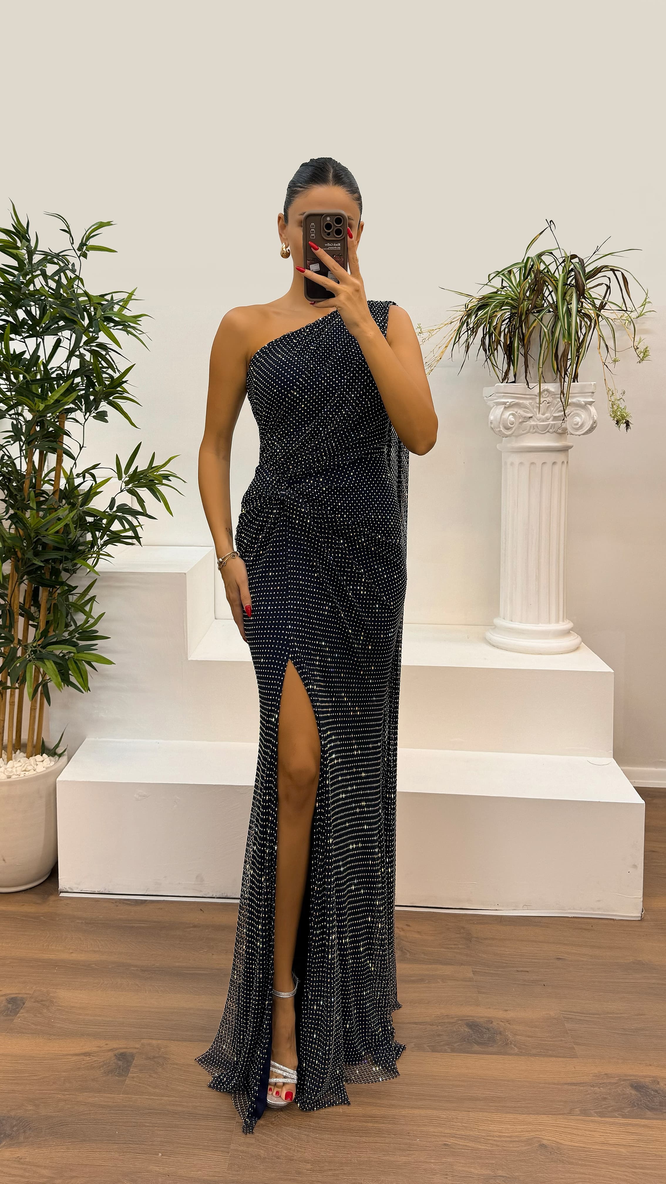 • Lacivert Tek Kol İşleme Detay Abiye Elbise