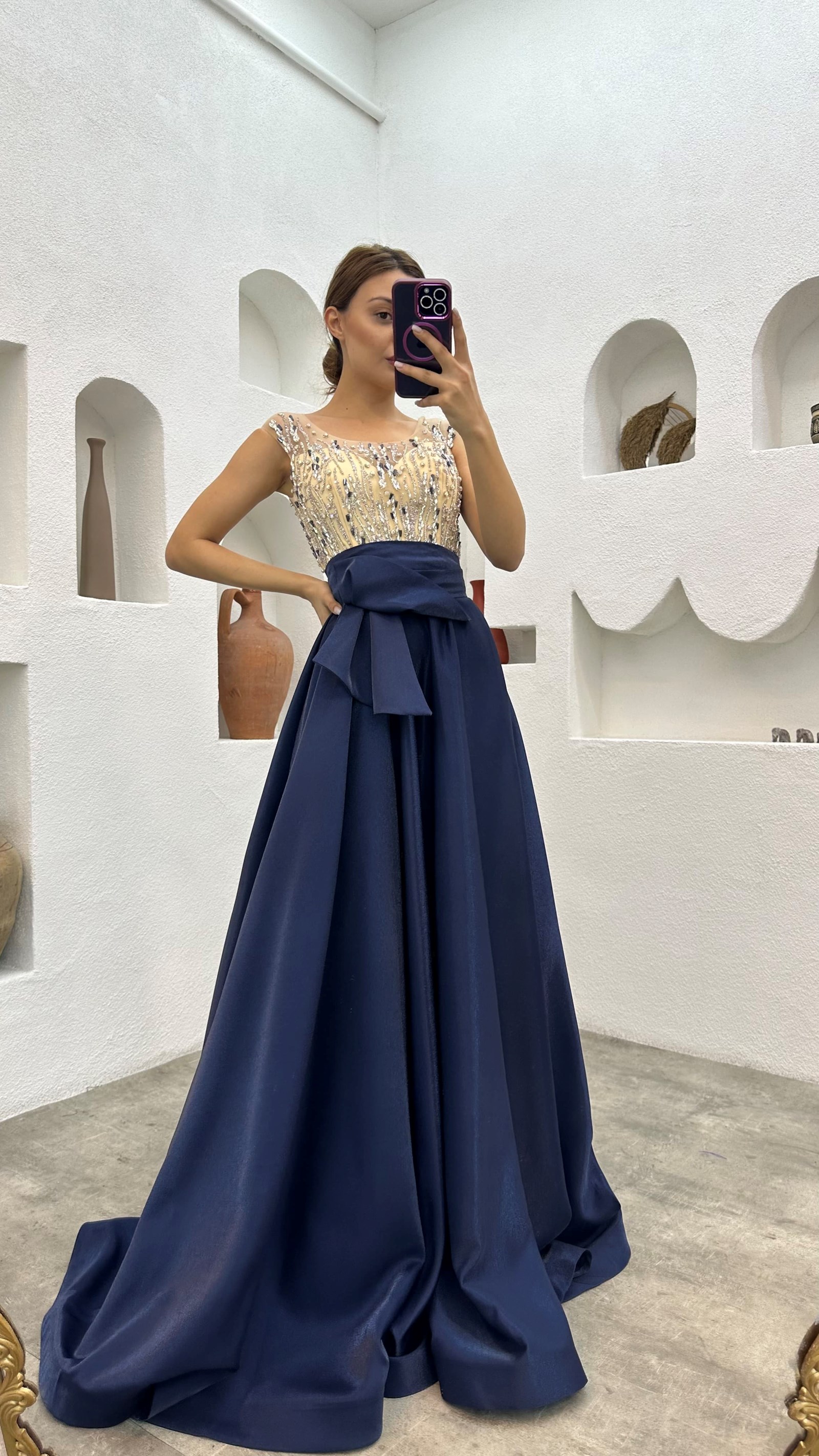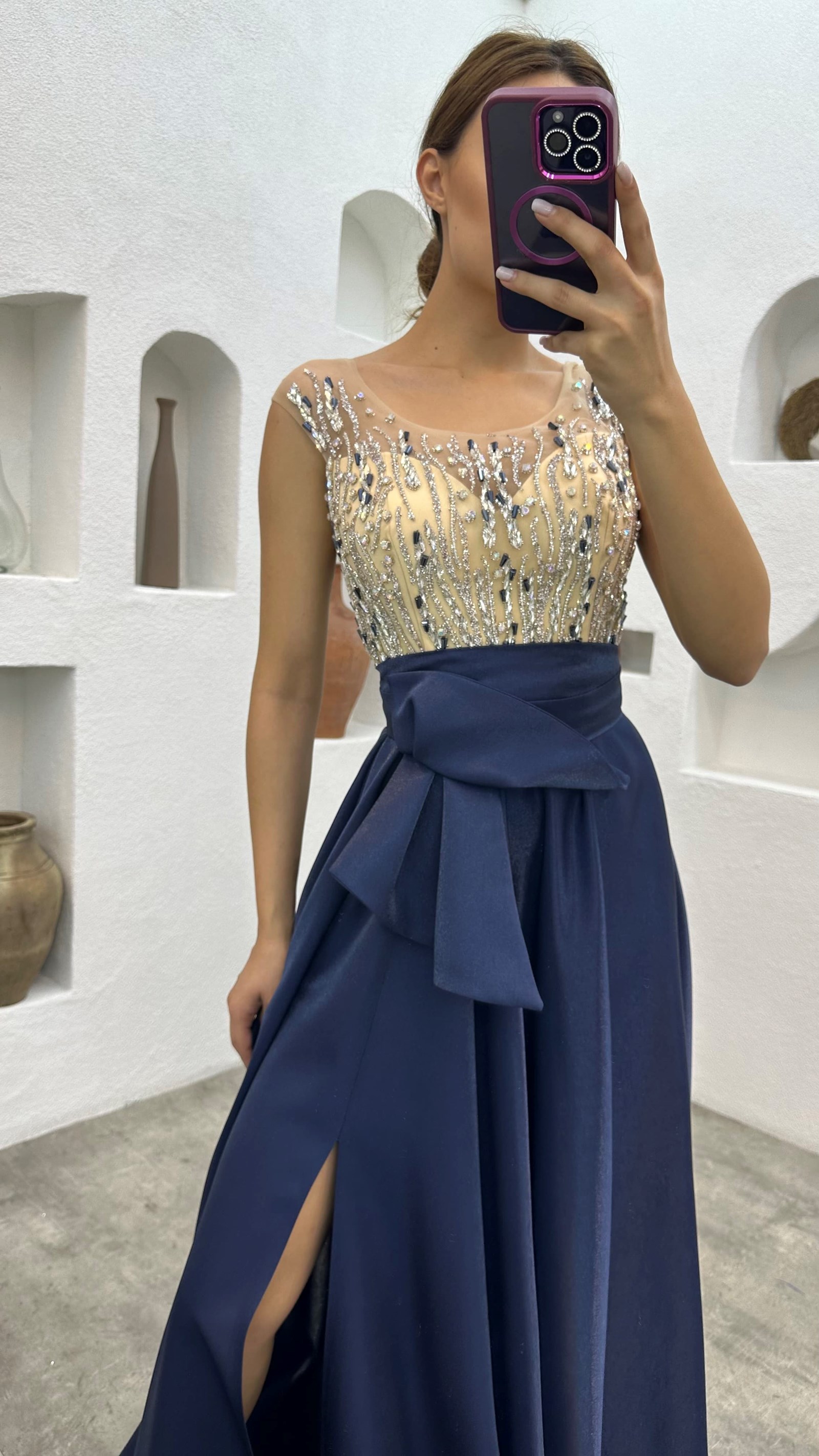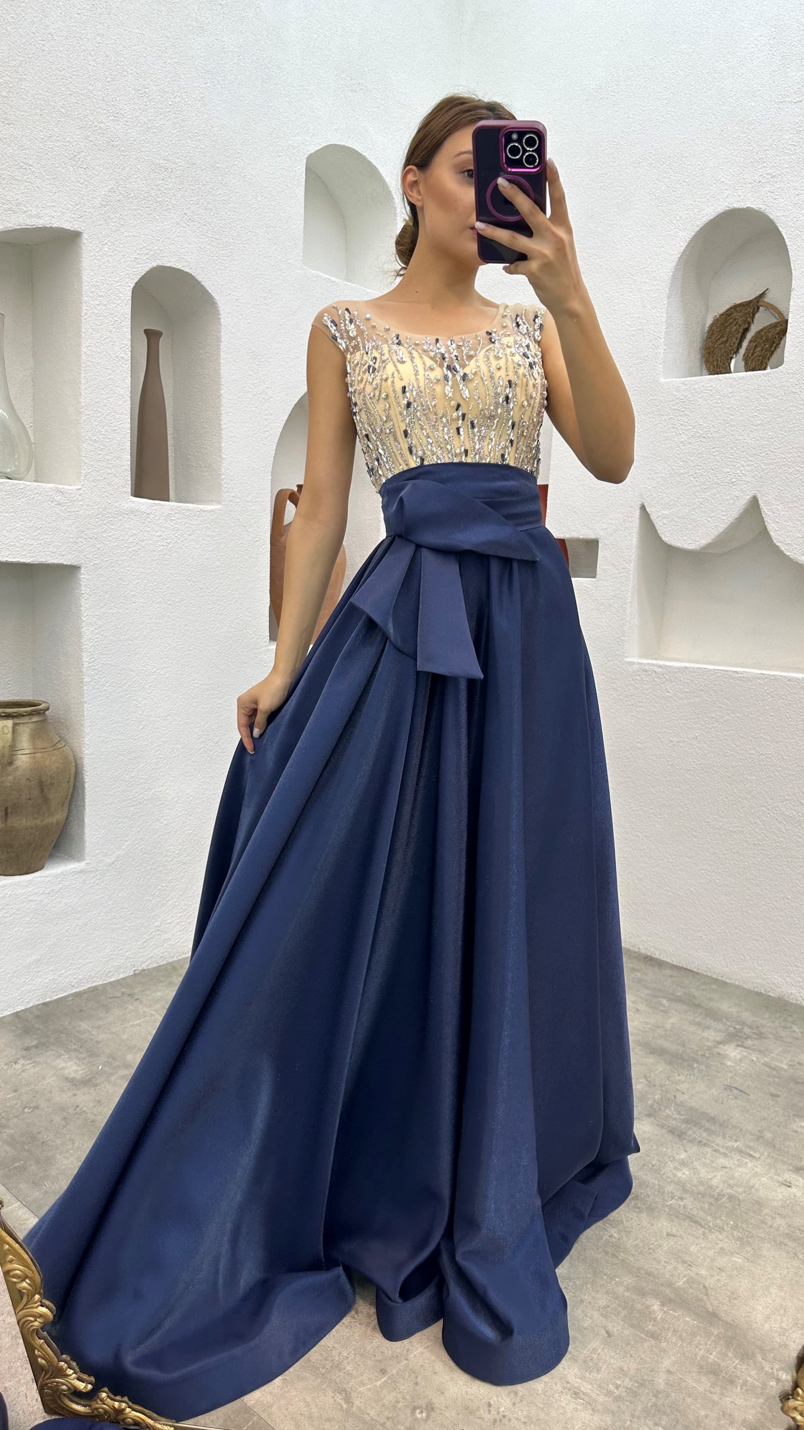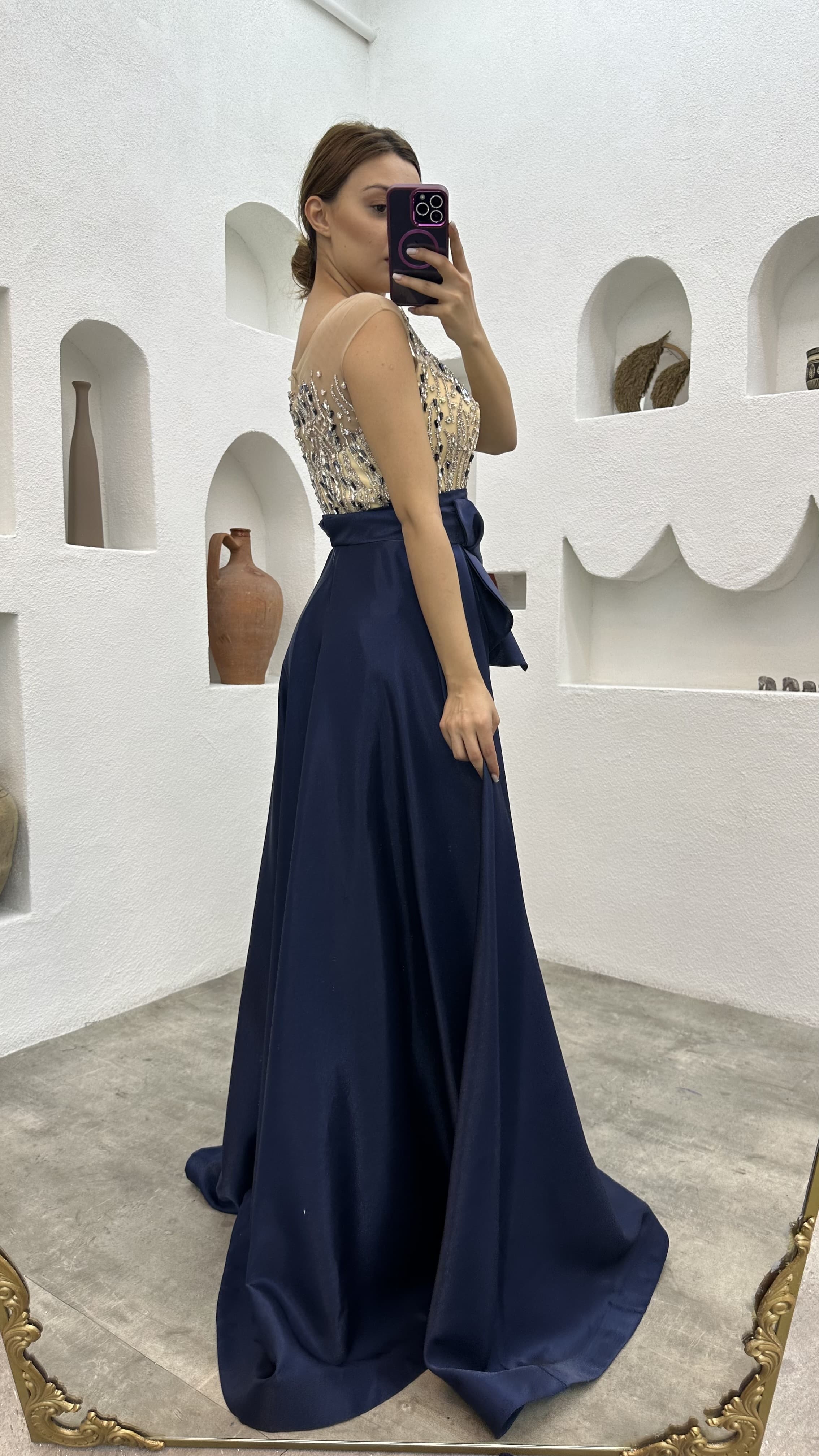 Lacivert Üzeri İşlemeli Kuşaklı Saten Abiye Elbise