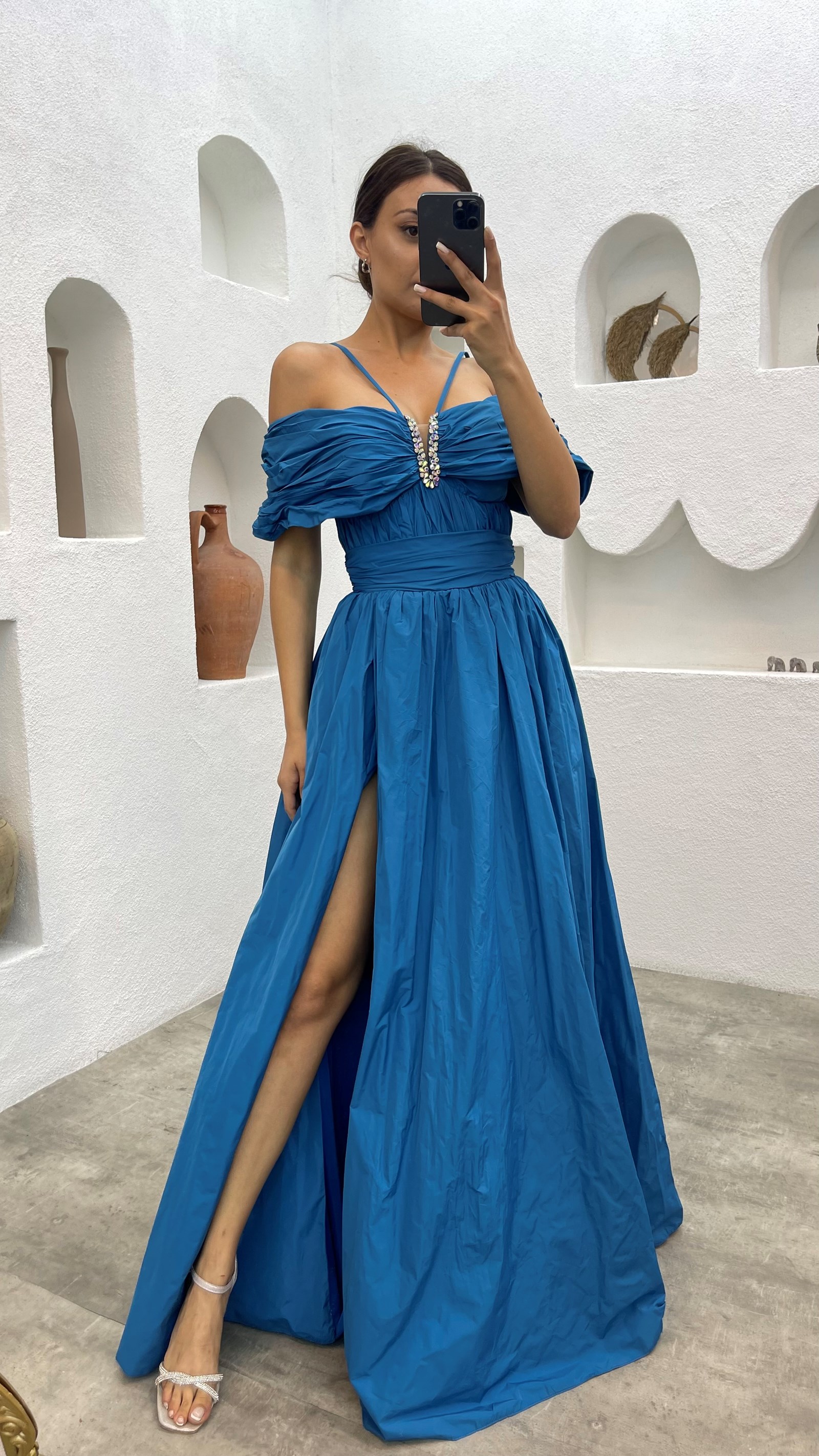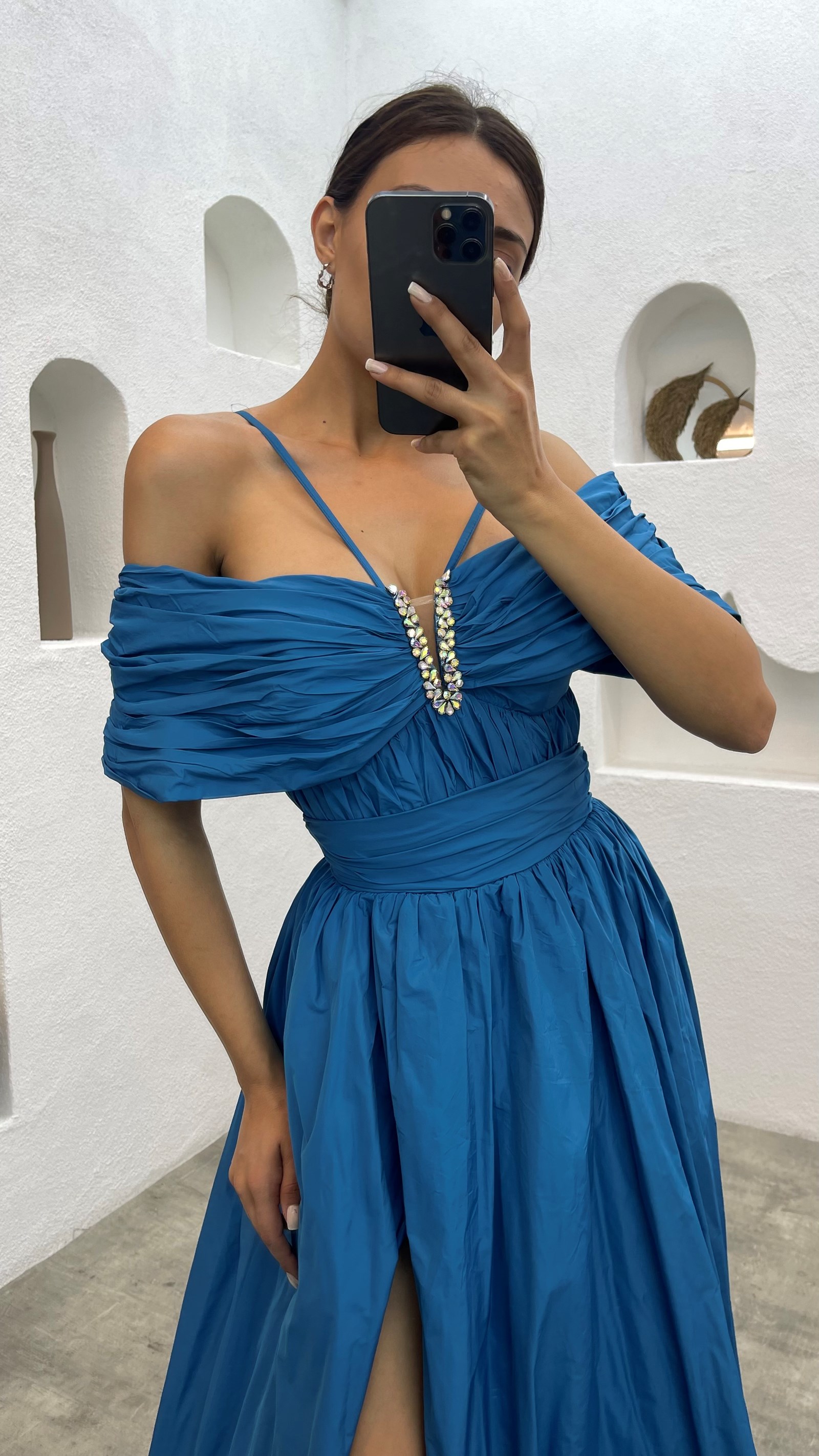 • Mavi İp Askılı Göğsü Taşlı Abiye Elbise