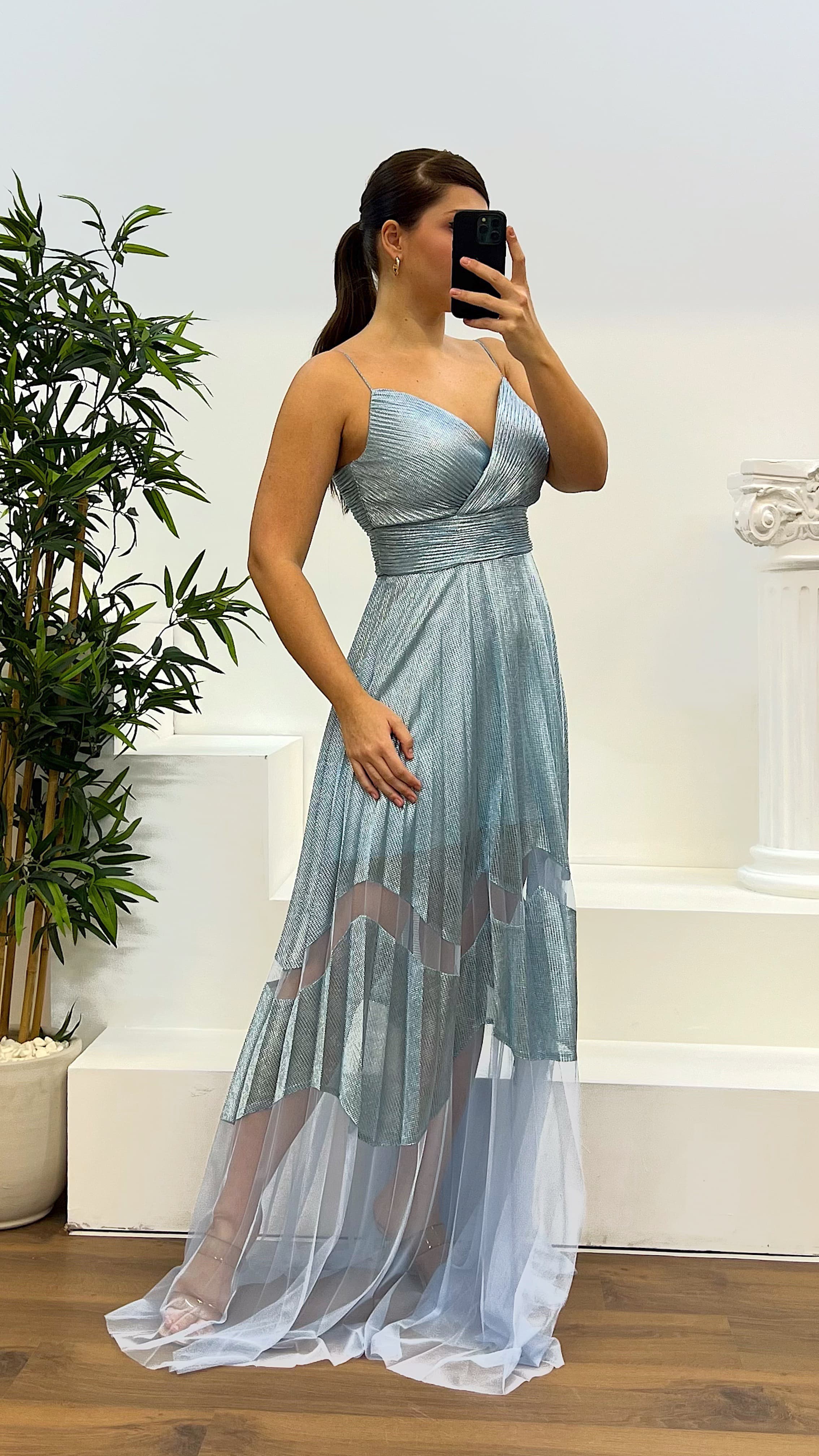 • Blaues Abendkleid in Übergröße mit Seilträgern und plissiertem Tülldetail