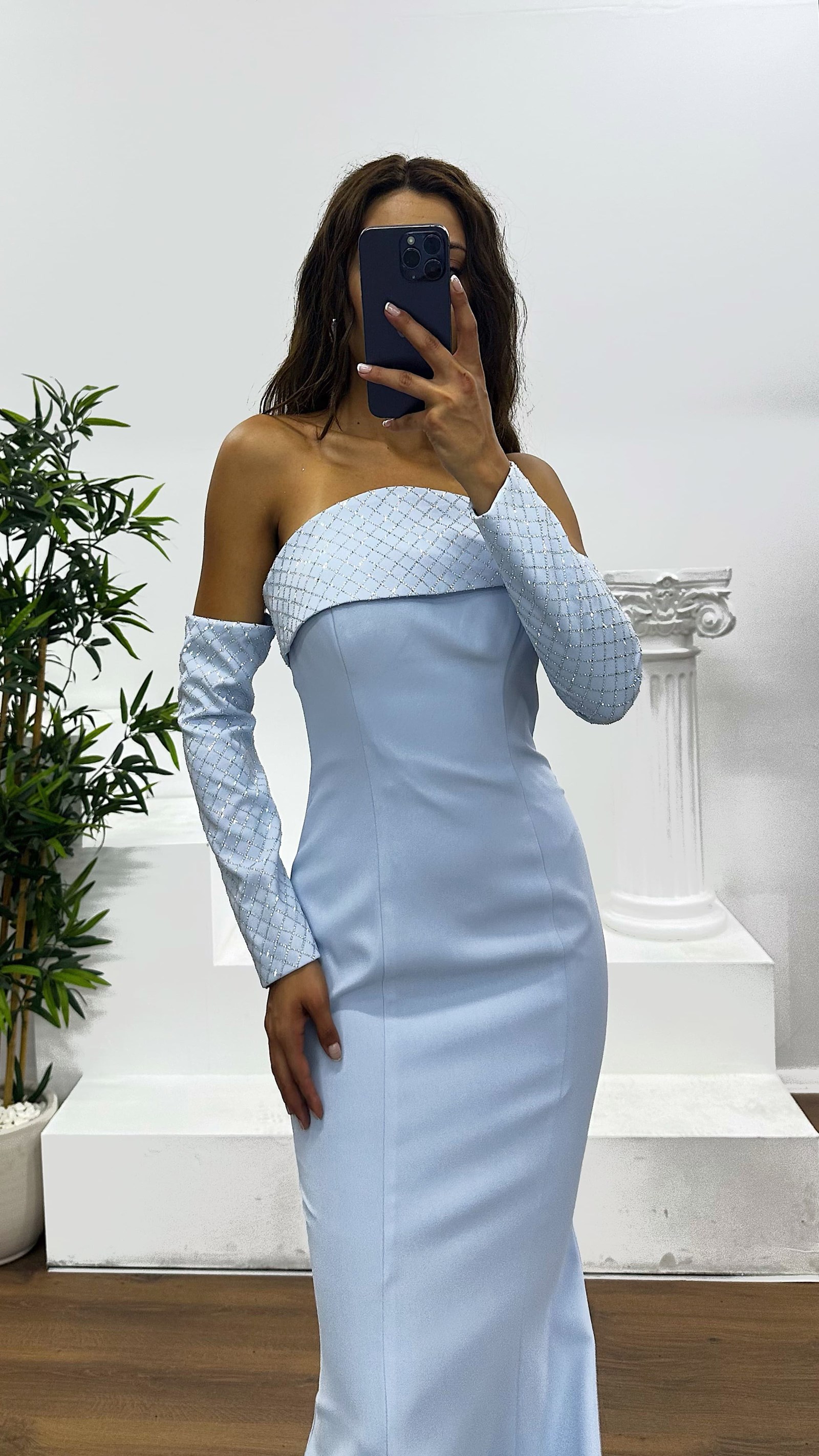 • Blaues trägerloses Abendkleid mit Handschuhen