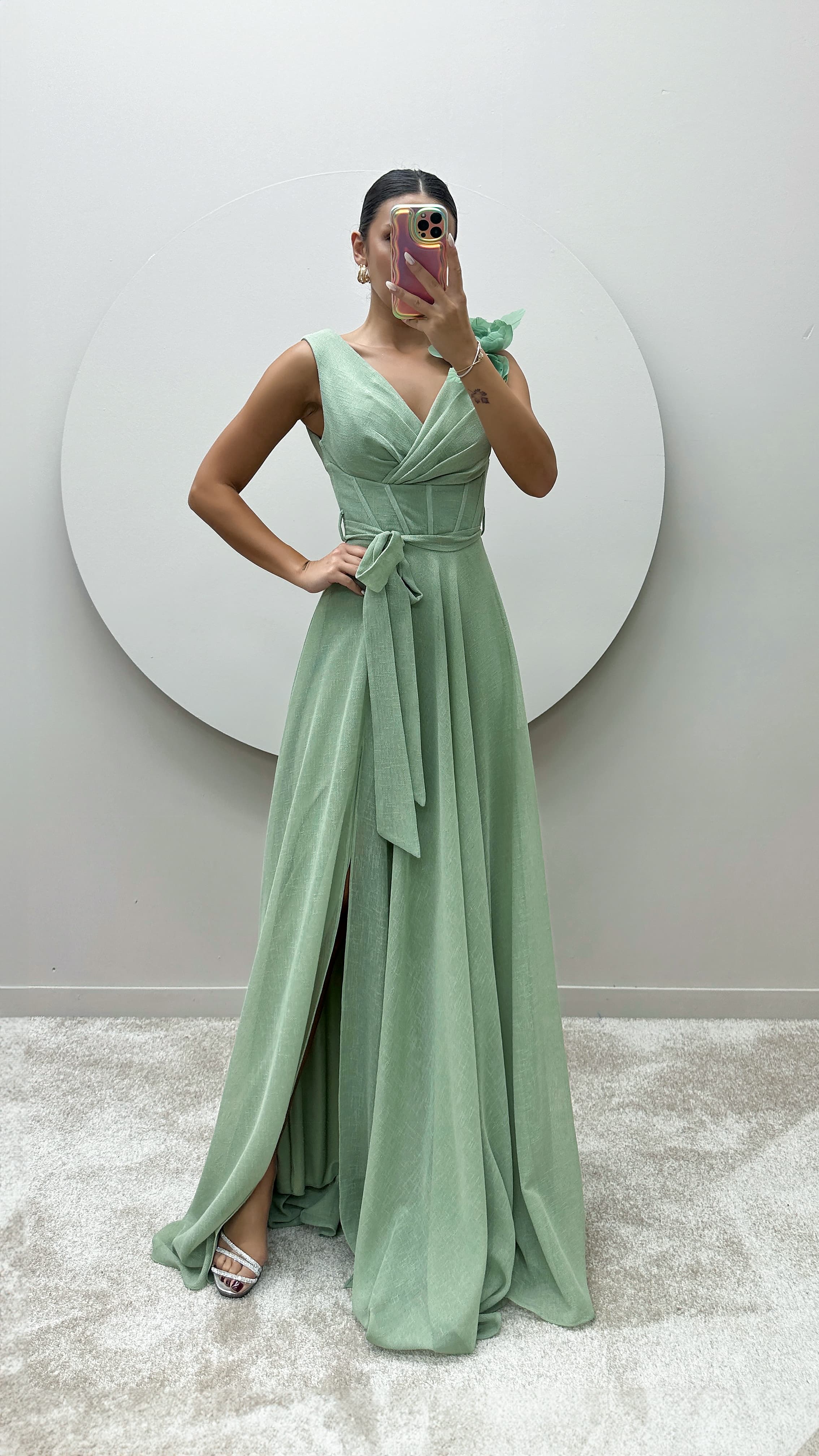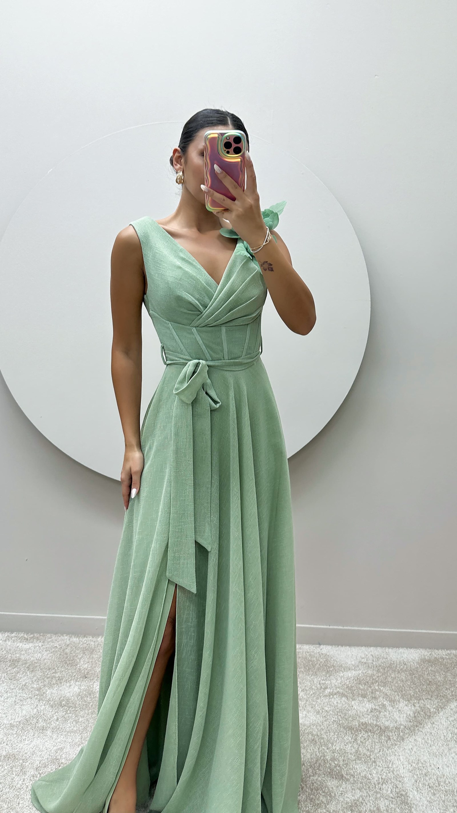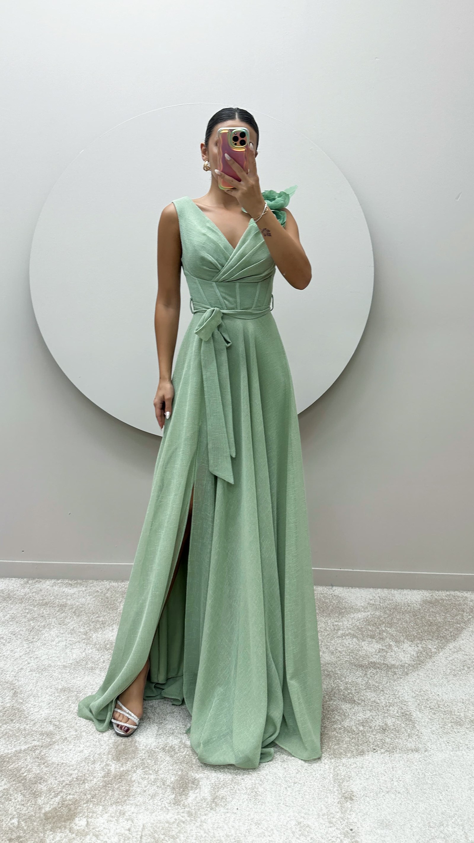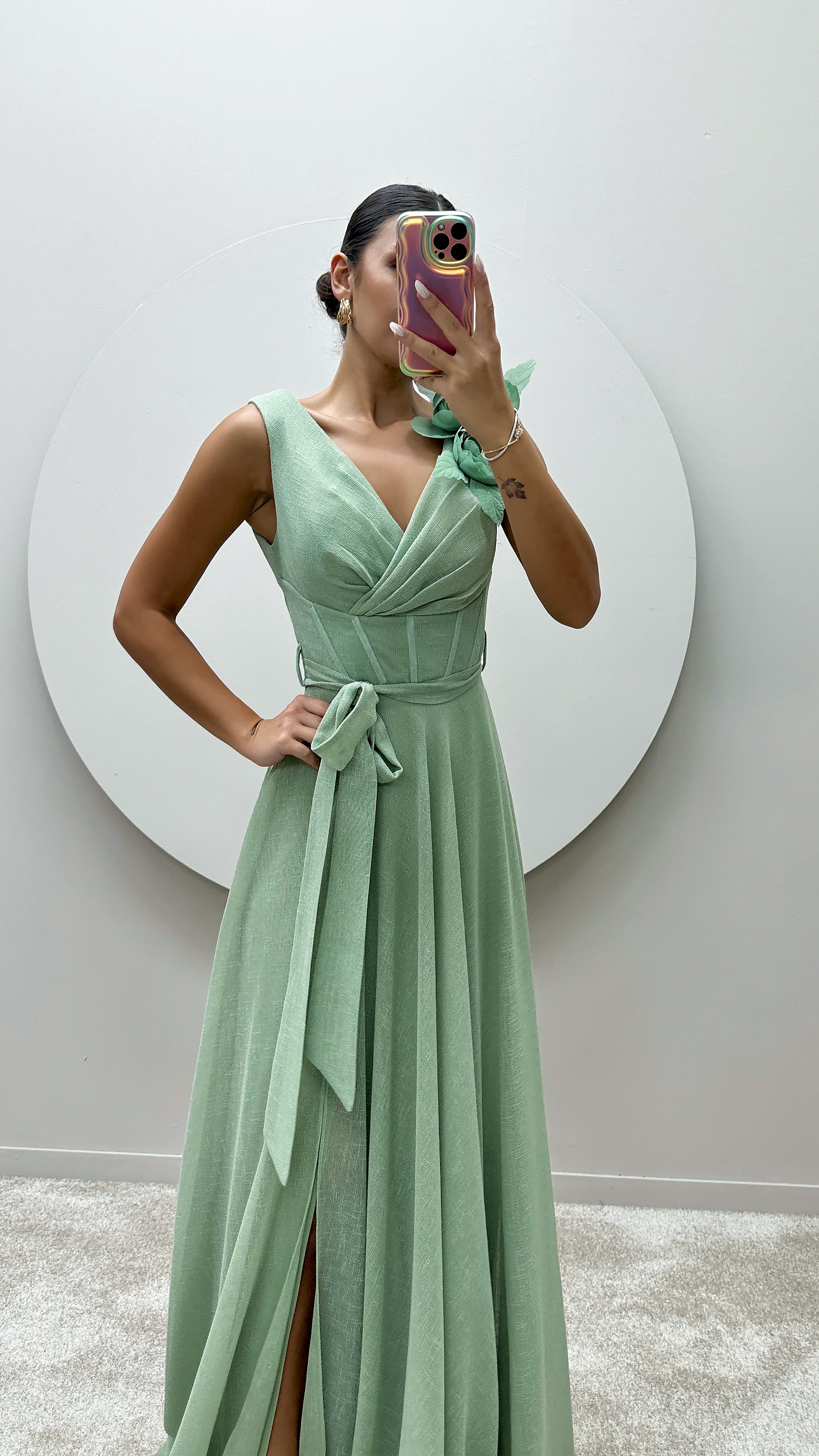 • Mint Yeşili Omuzu Çiçek Detay Kruvaze Yaka Tasarım Elbise
