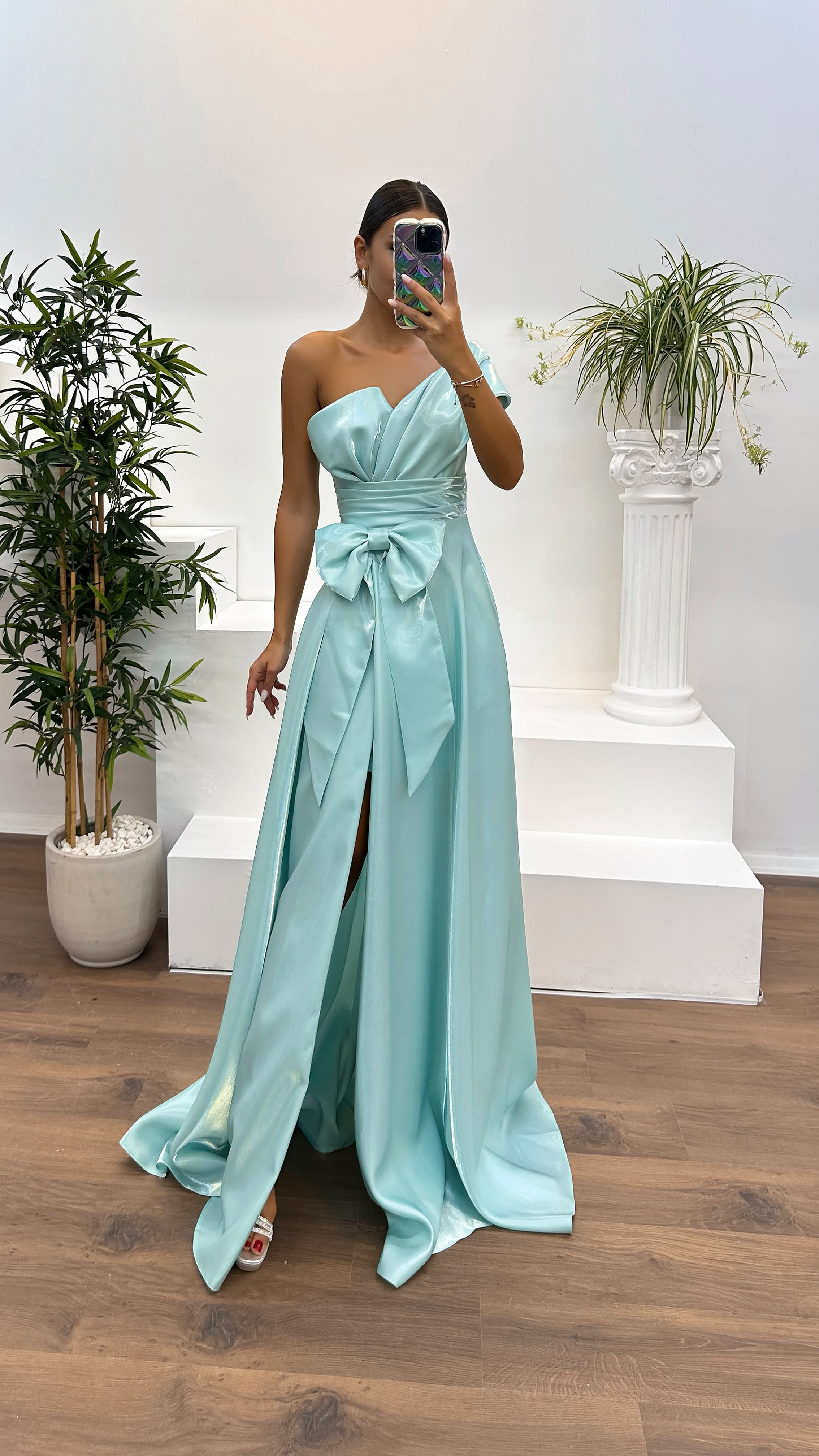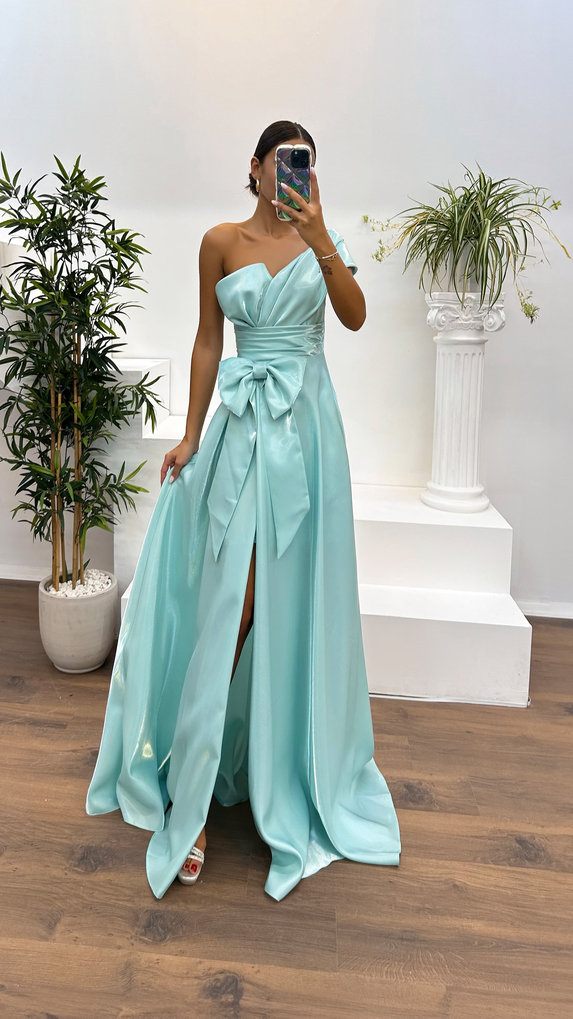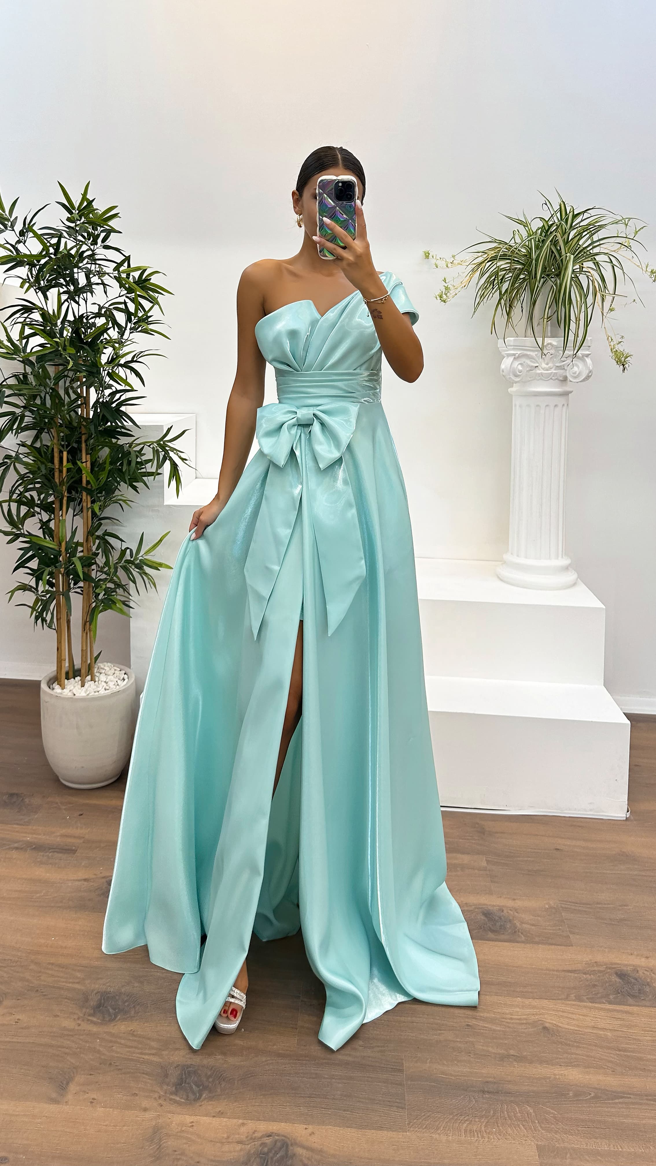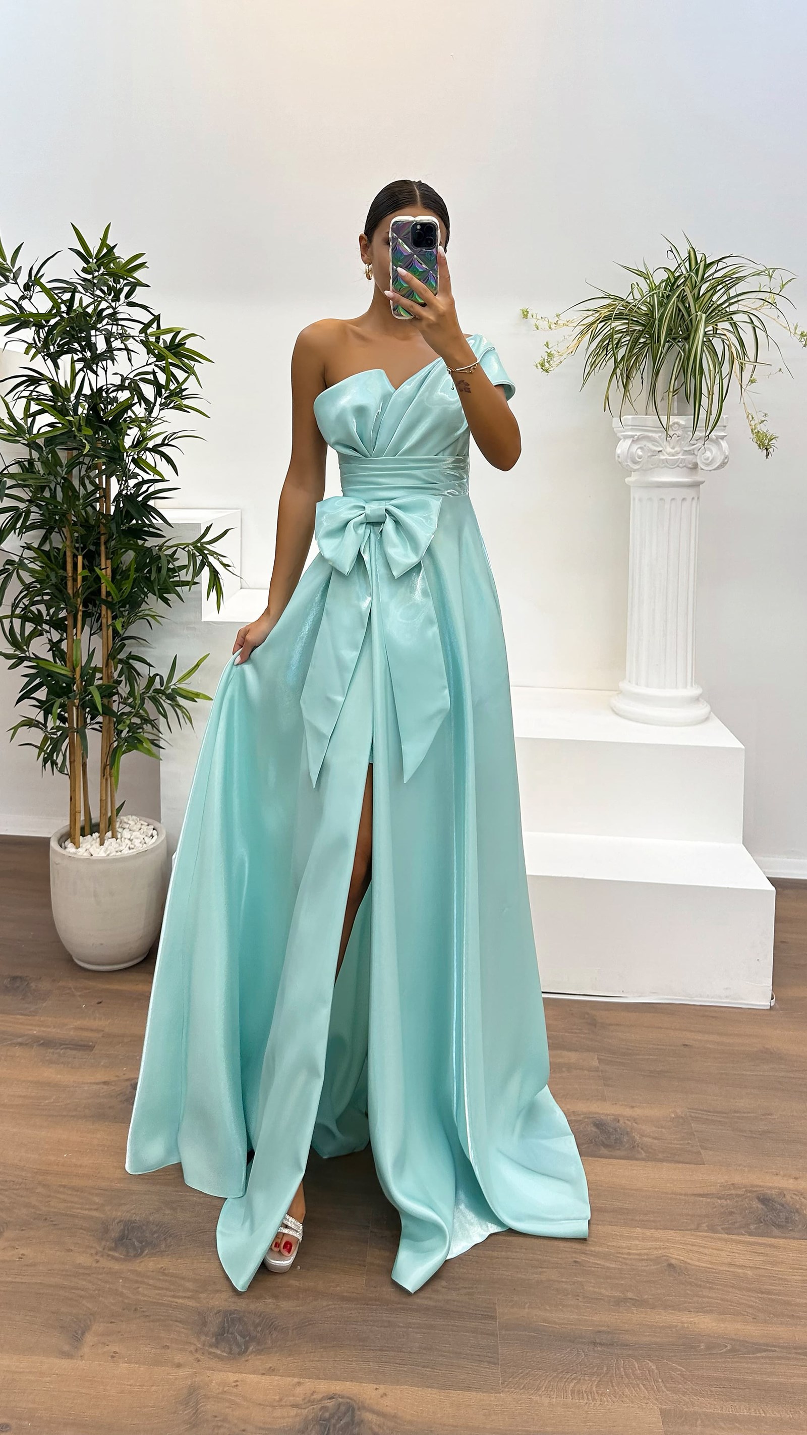 • Mint Yeşili Tek Kol Fiyonk Detay Abiye Elbise