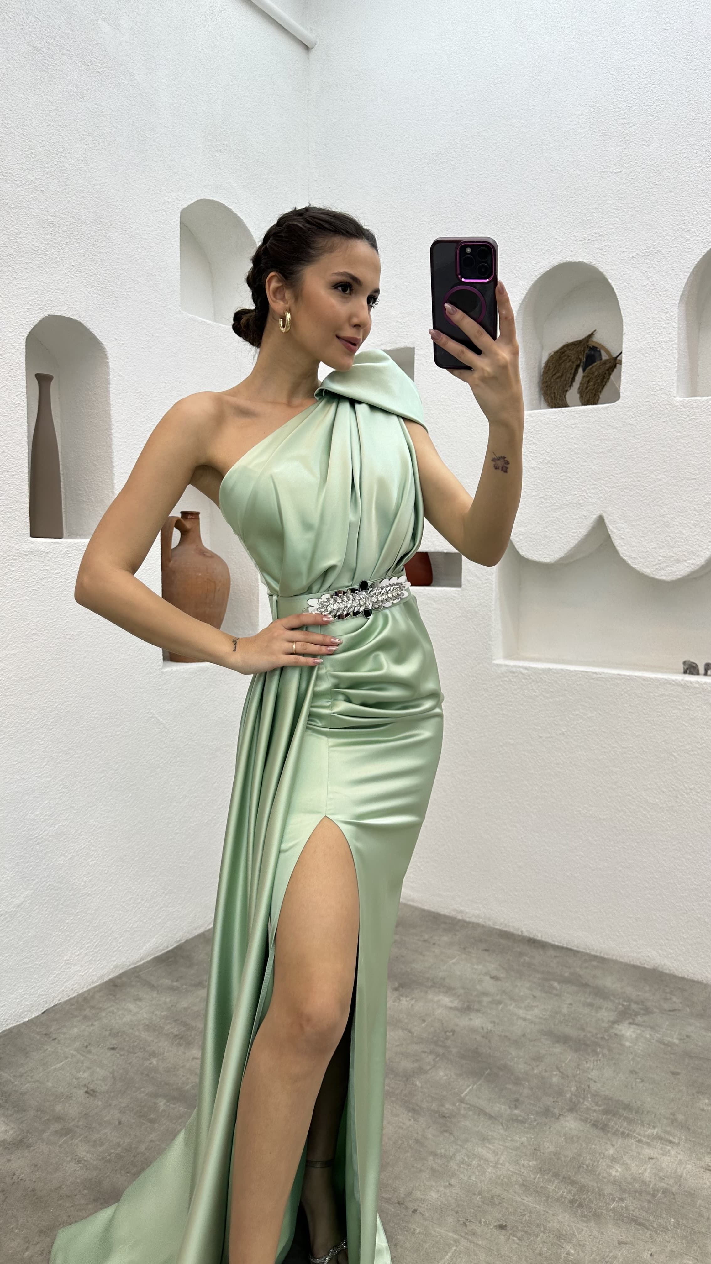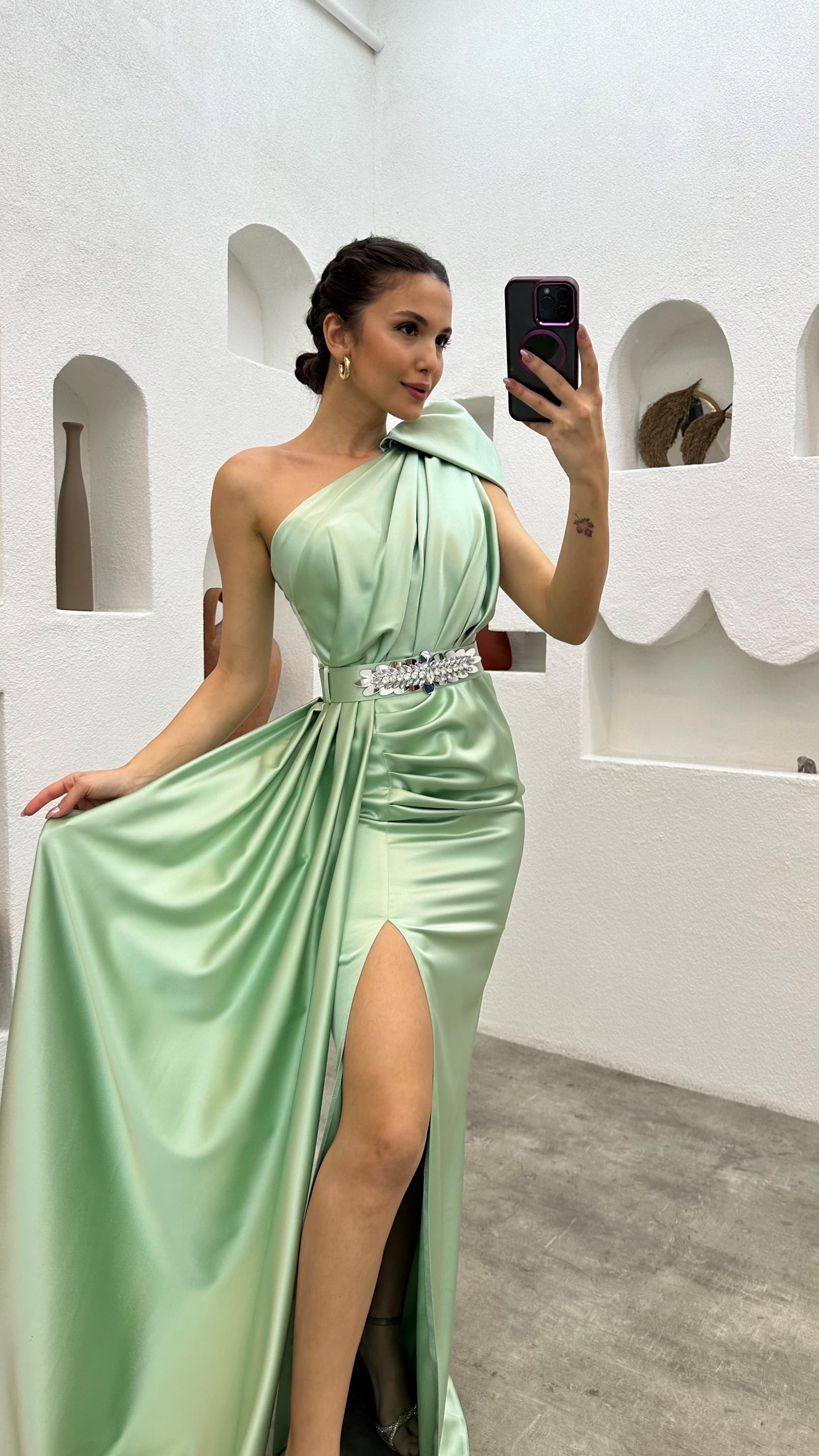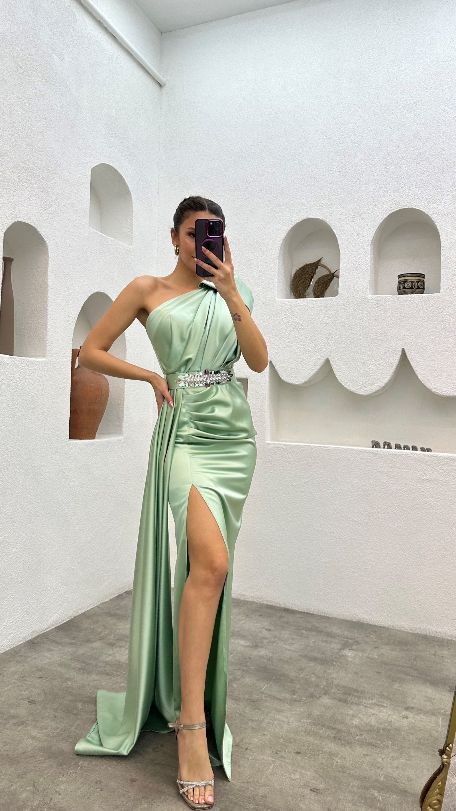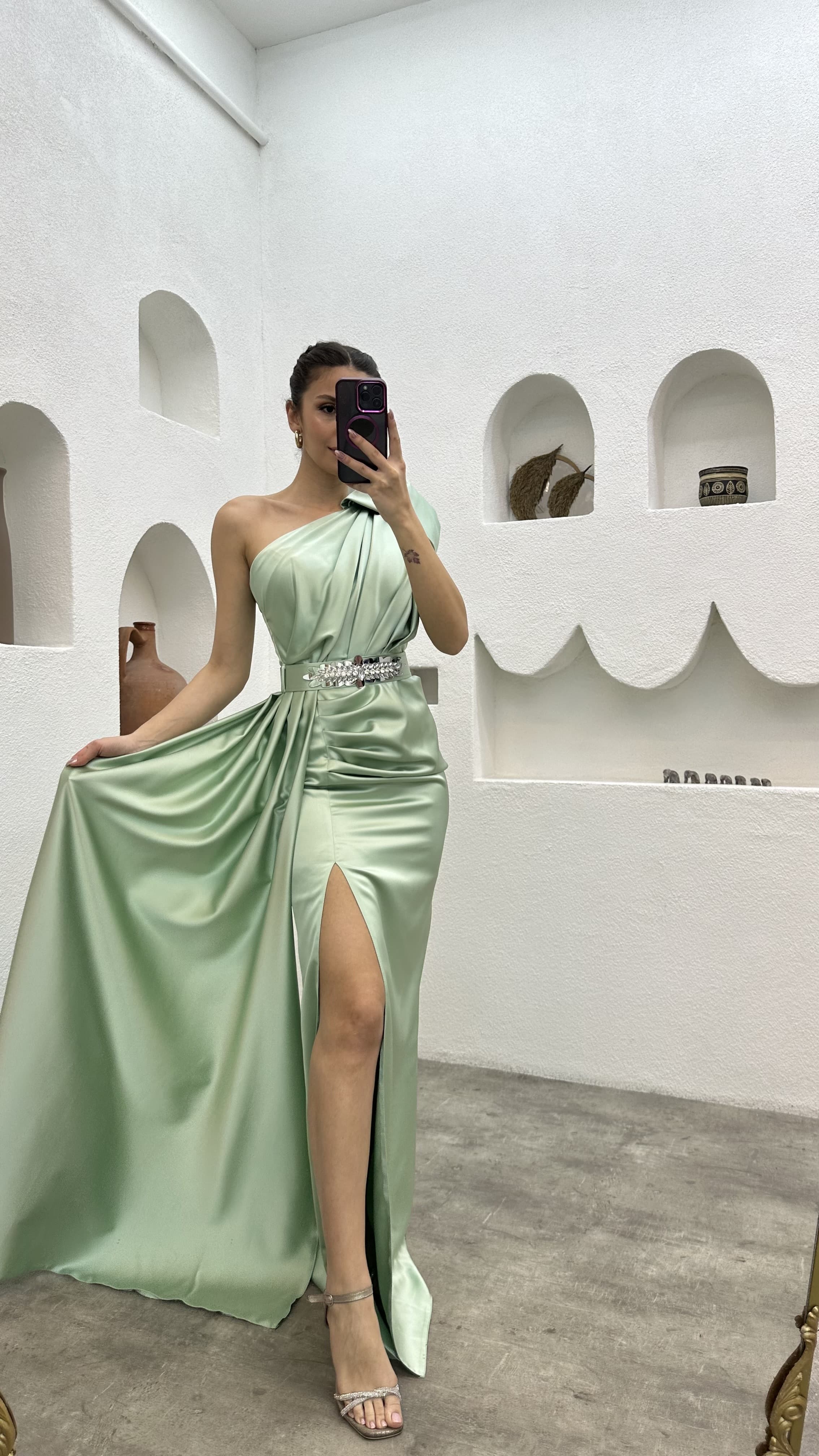 • Mint Yeşili Tek Omuz Kemeri İşlemeli Abiye Elbise
