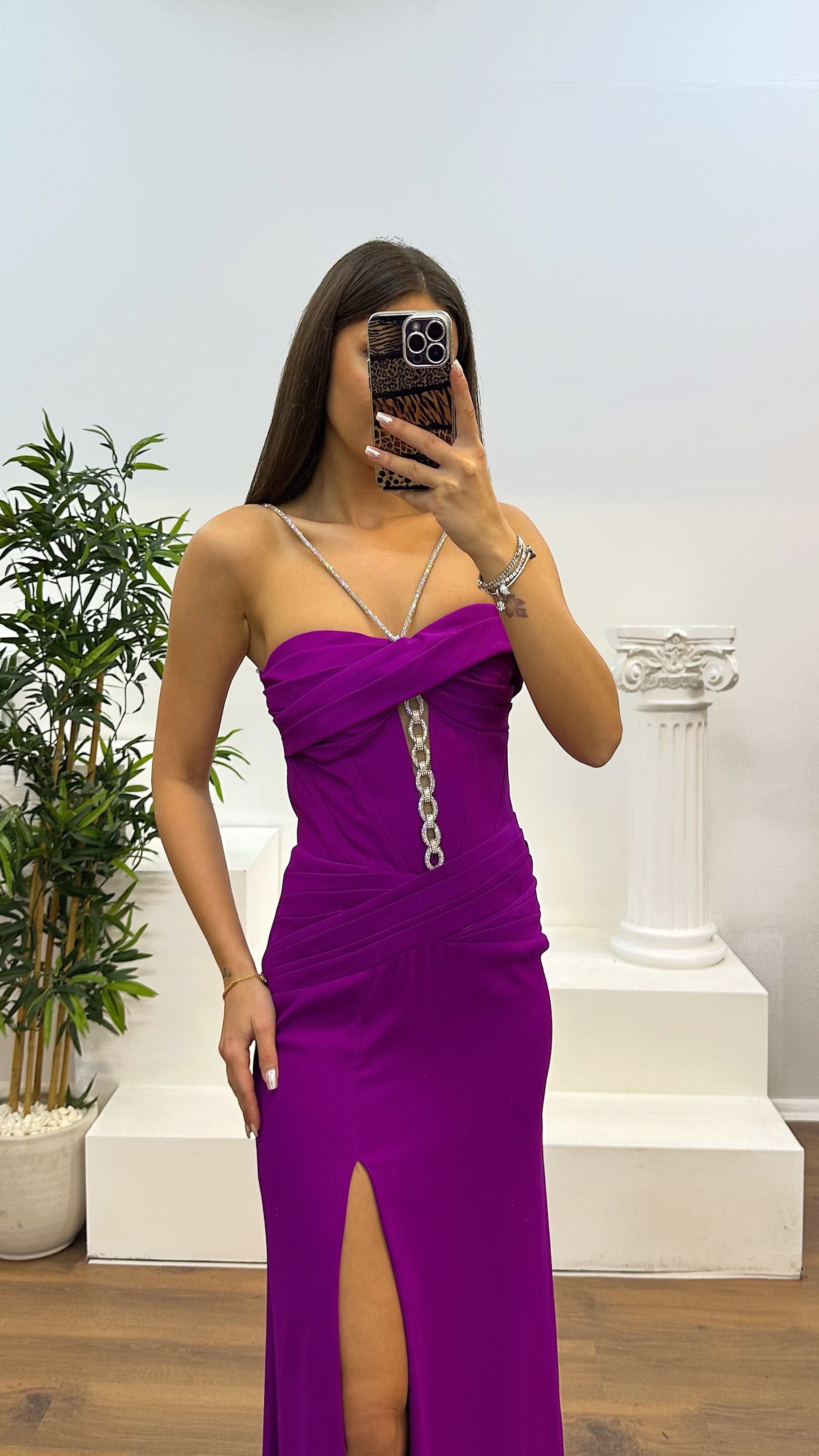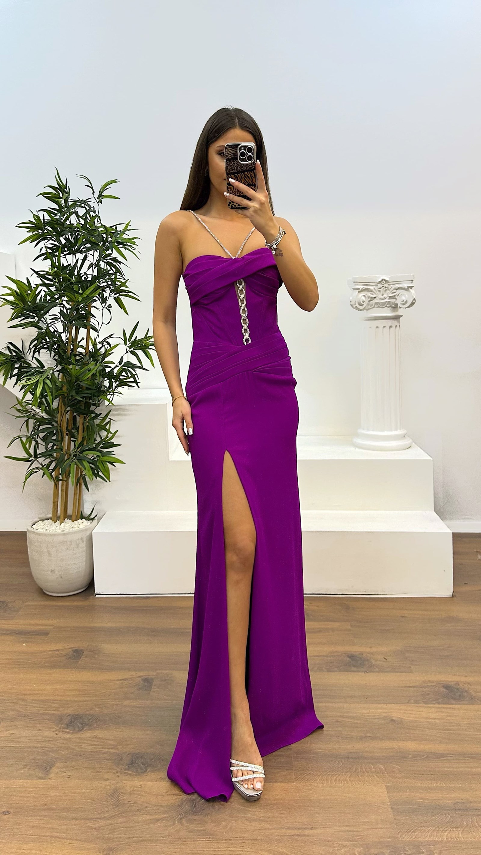 Abendkleid mit Kragen-Detail Das Produkt passt für die Größen 36 bis 40, mit Brustpolstern, gefüttert, mit Kreuzband und Reißverschluss zum Verschließen, mit Schlitz, entworfen als Abendkleid mit Kragen-Detail. Die Länge des Produkts kann zwischen 165 und 170 cm variieren. Stoffart: Atlas, 100% Polyester.