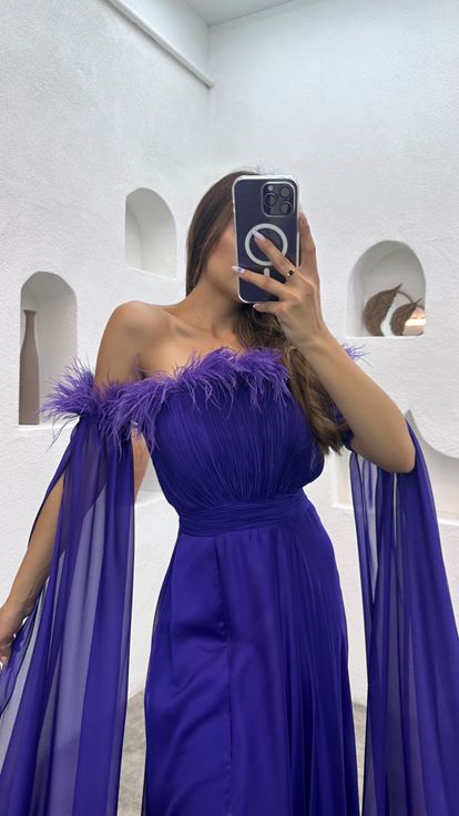 • Mor  Tüy Detay Gögsü Pliseli Abiye Elbise