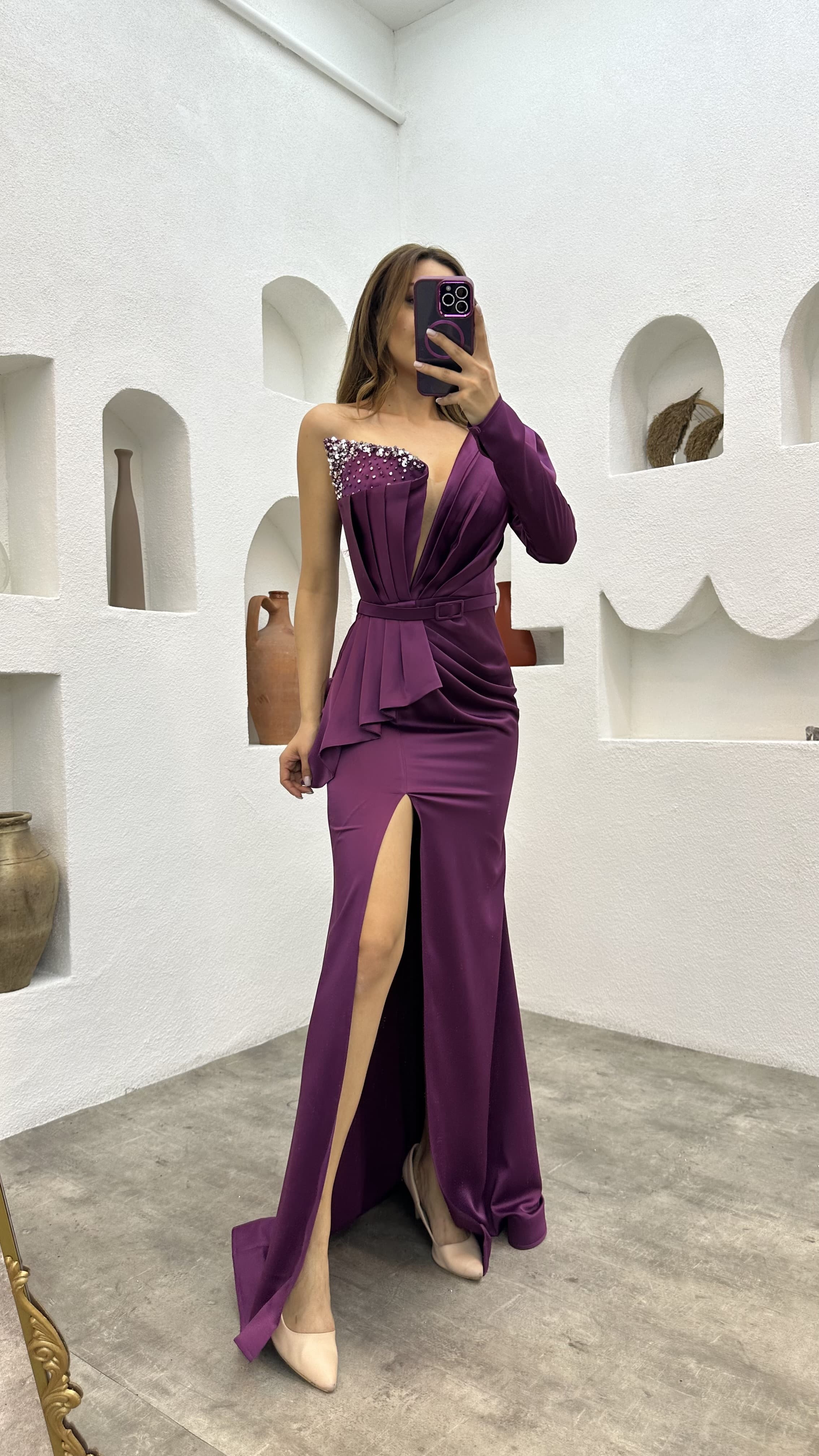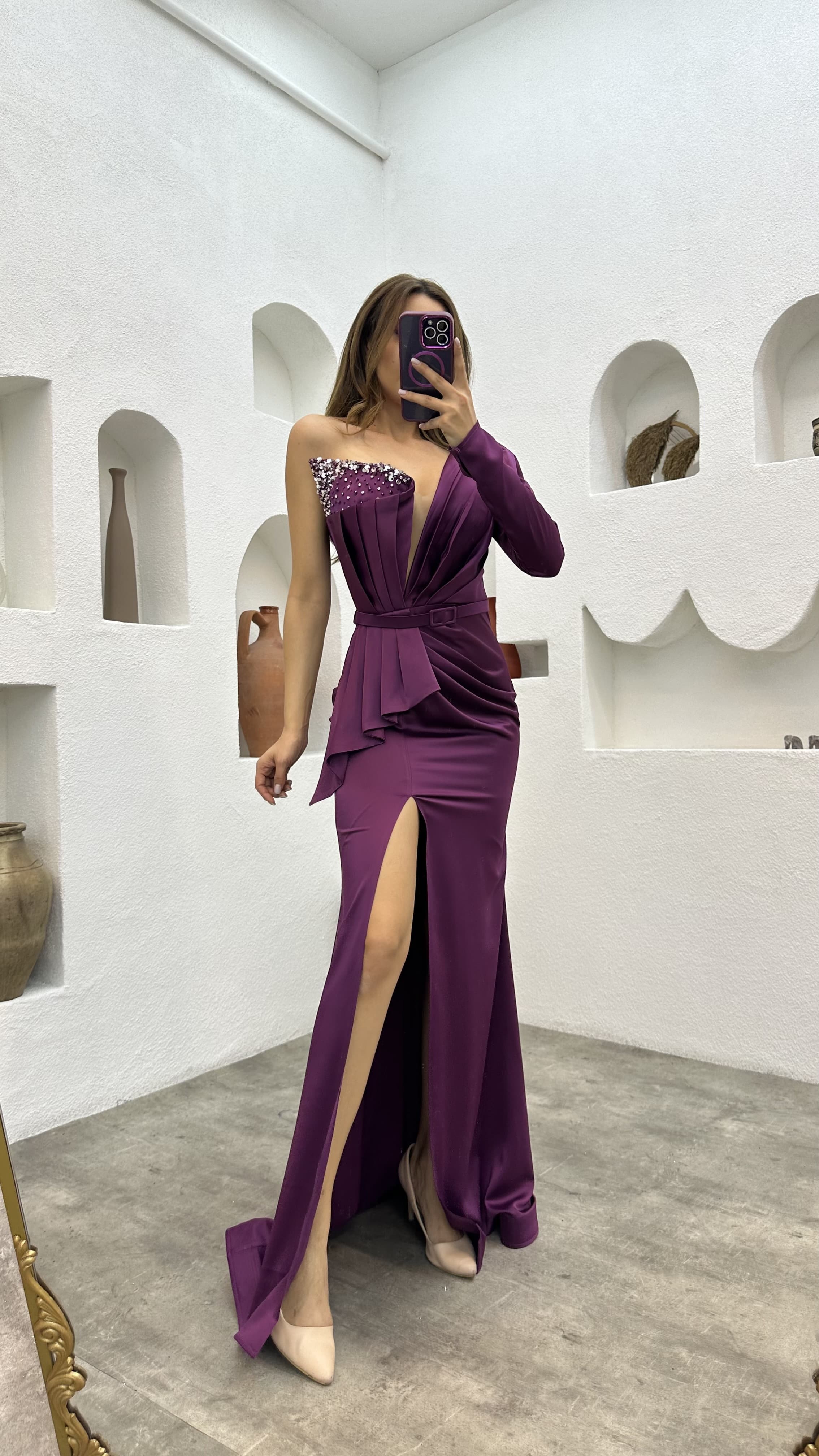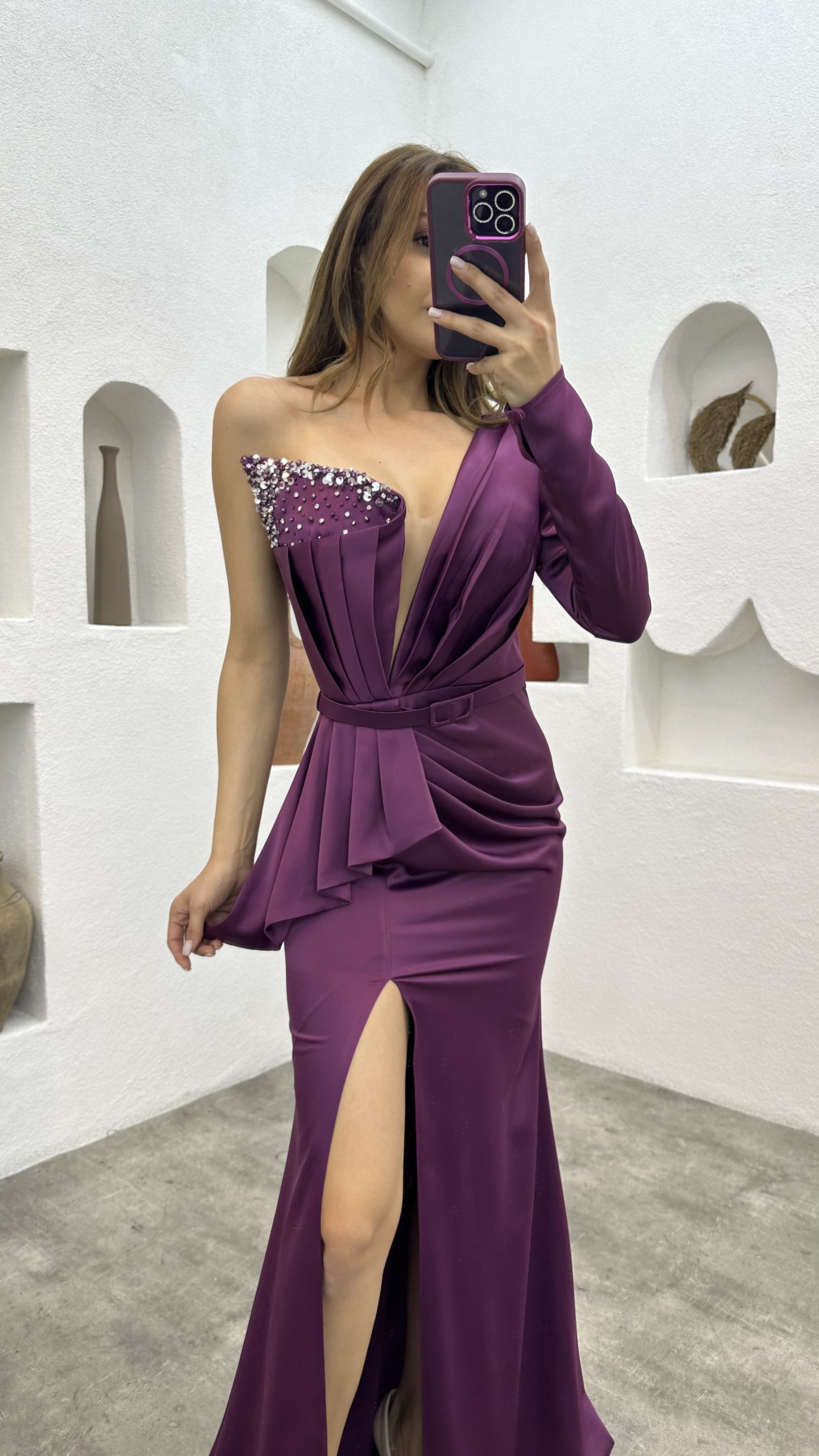 Mürdüm Tek Kol İşlemeli Kemerli Saten Abiye Elbise