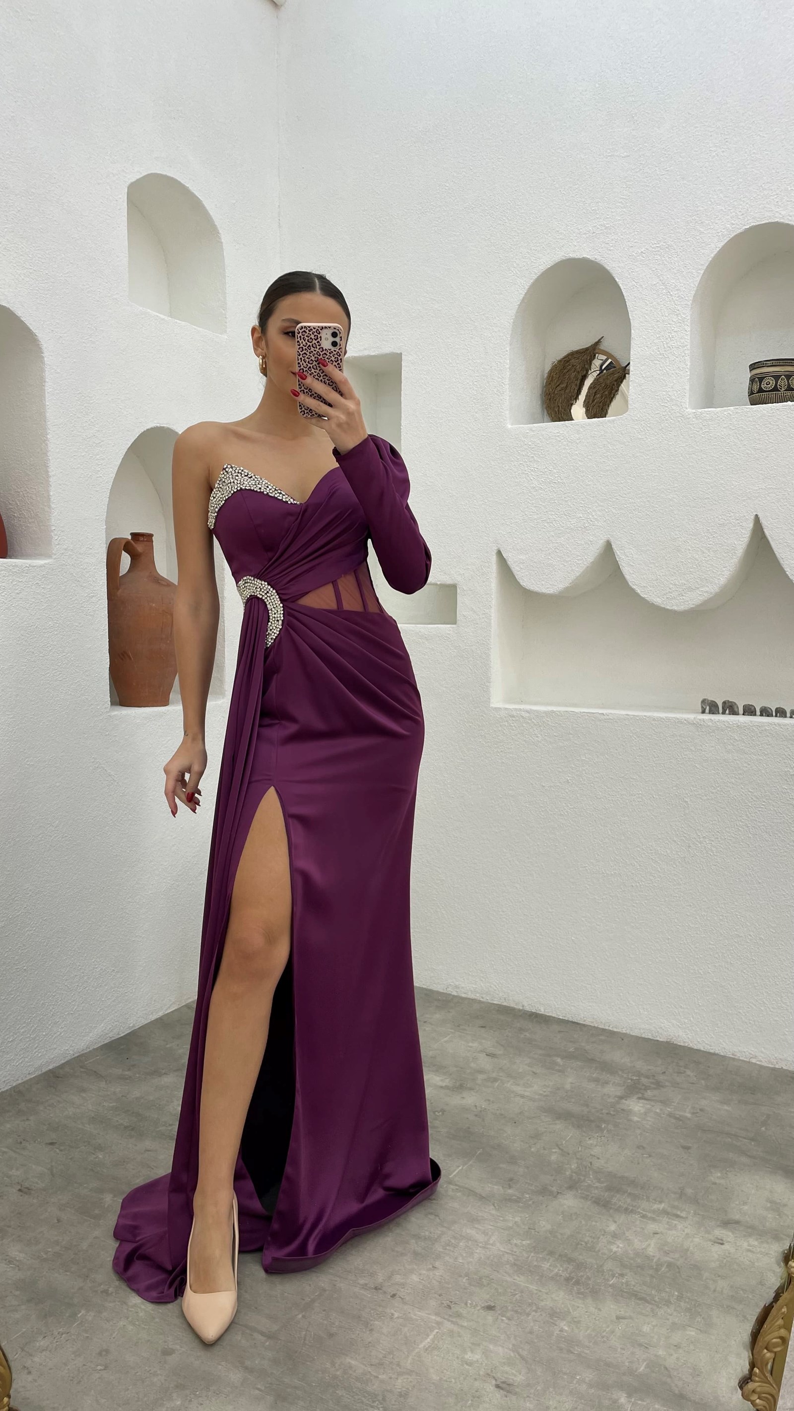 • Mürdüm Tek Kol İşlemeli Saten Abiye Elbise