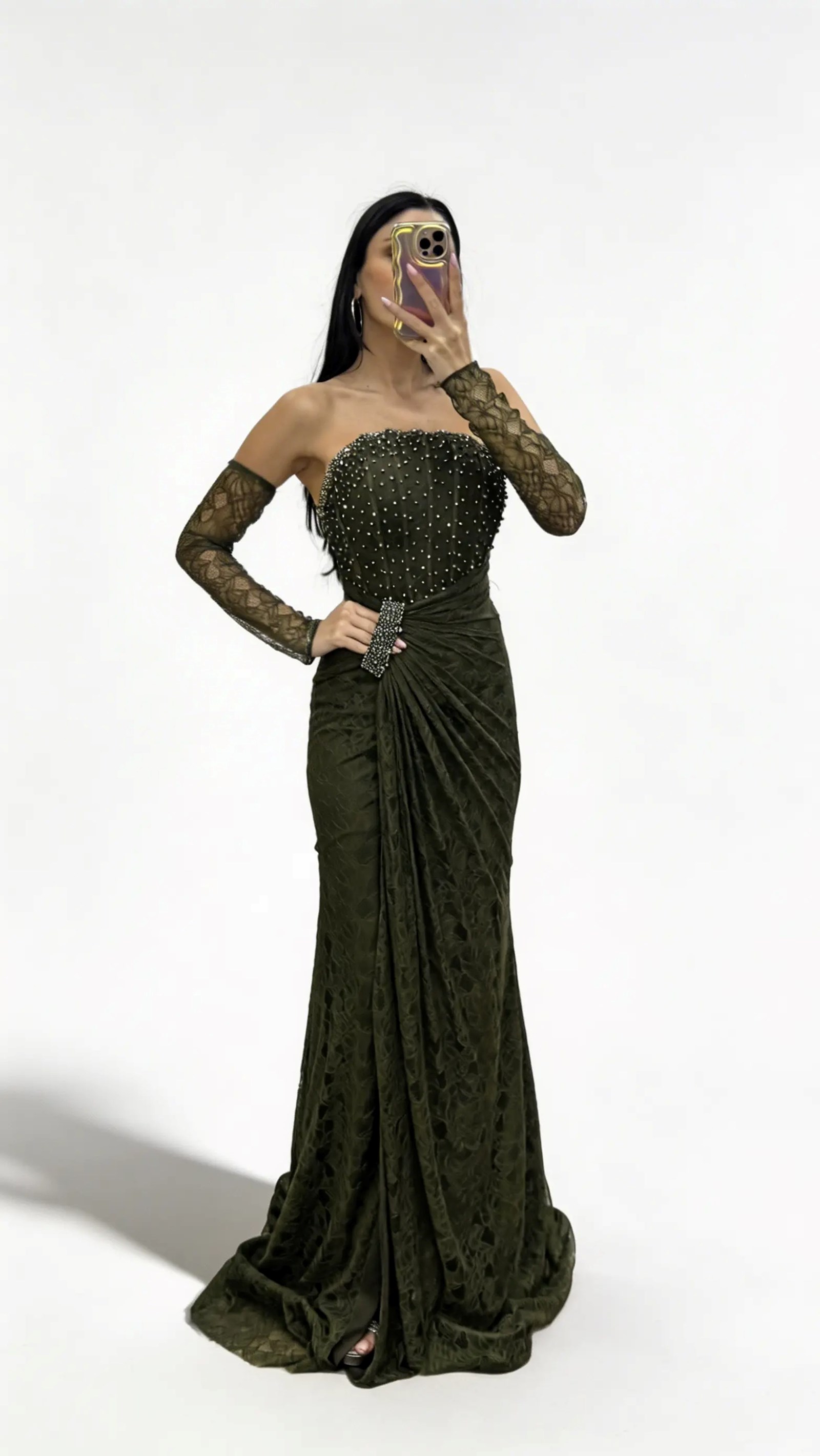 Olivgrünes trägerloses Abendkleid aus Spitze mit Steinschnalle