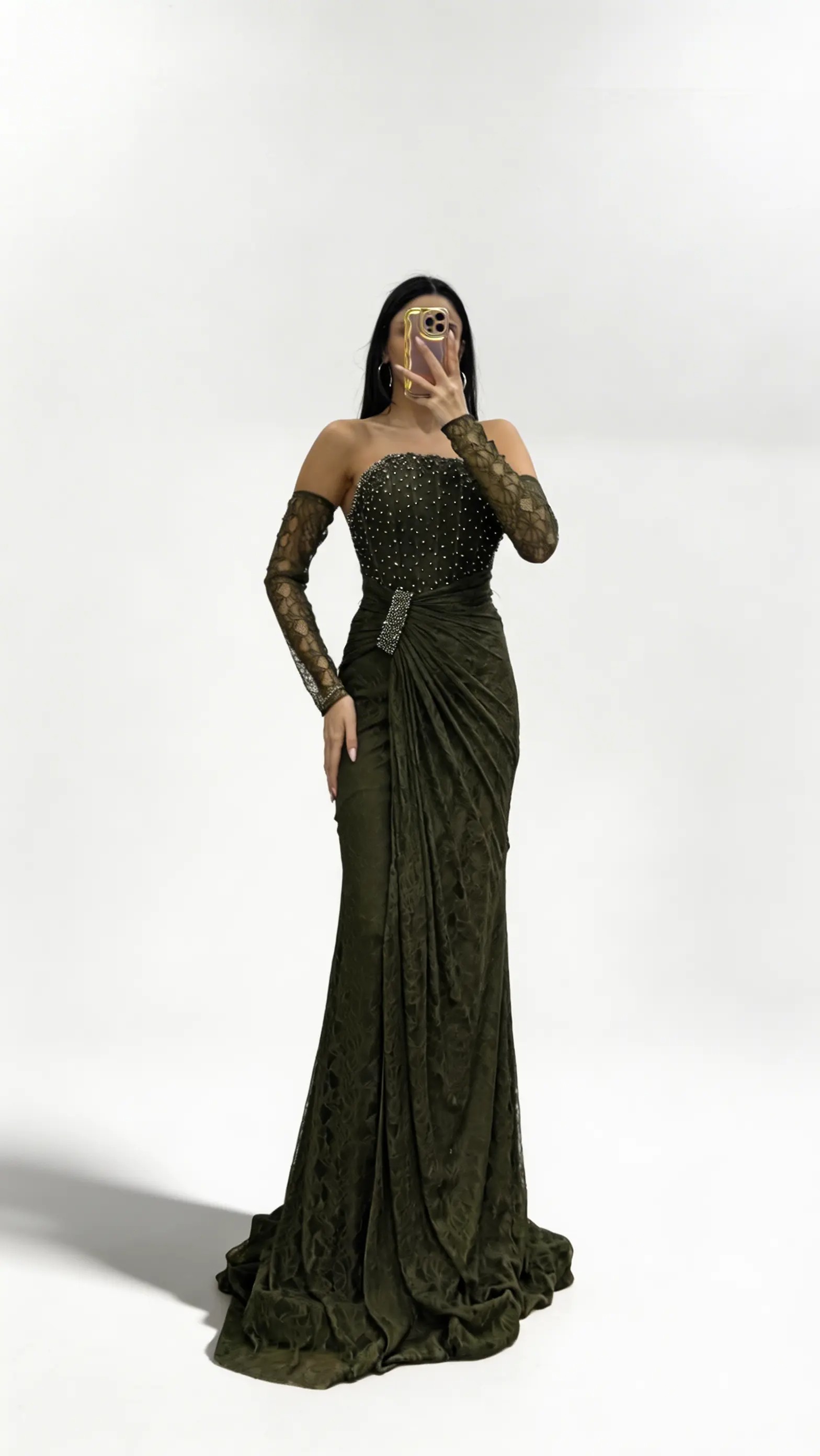 Olivgrünes  trägerloses Abendkleid aus Spitze mit Steinschnalle