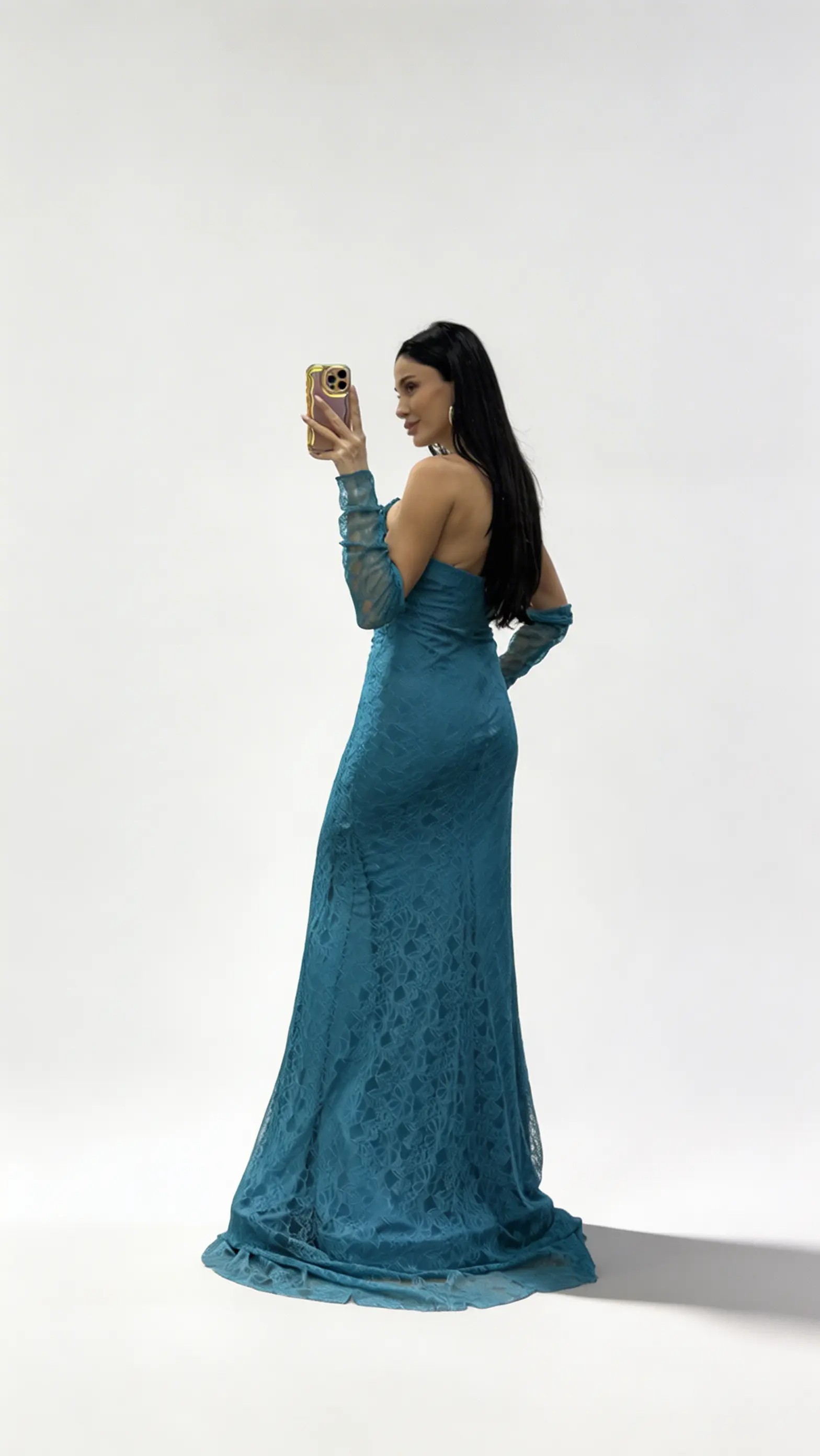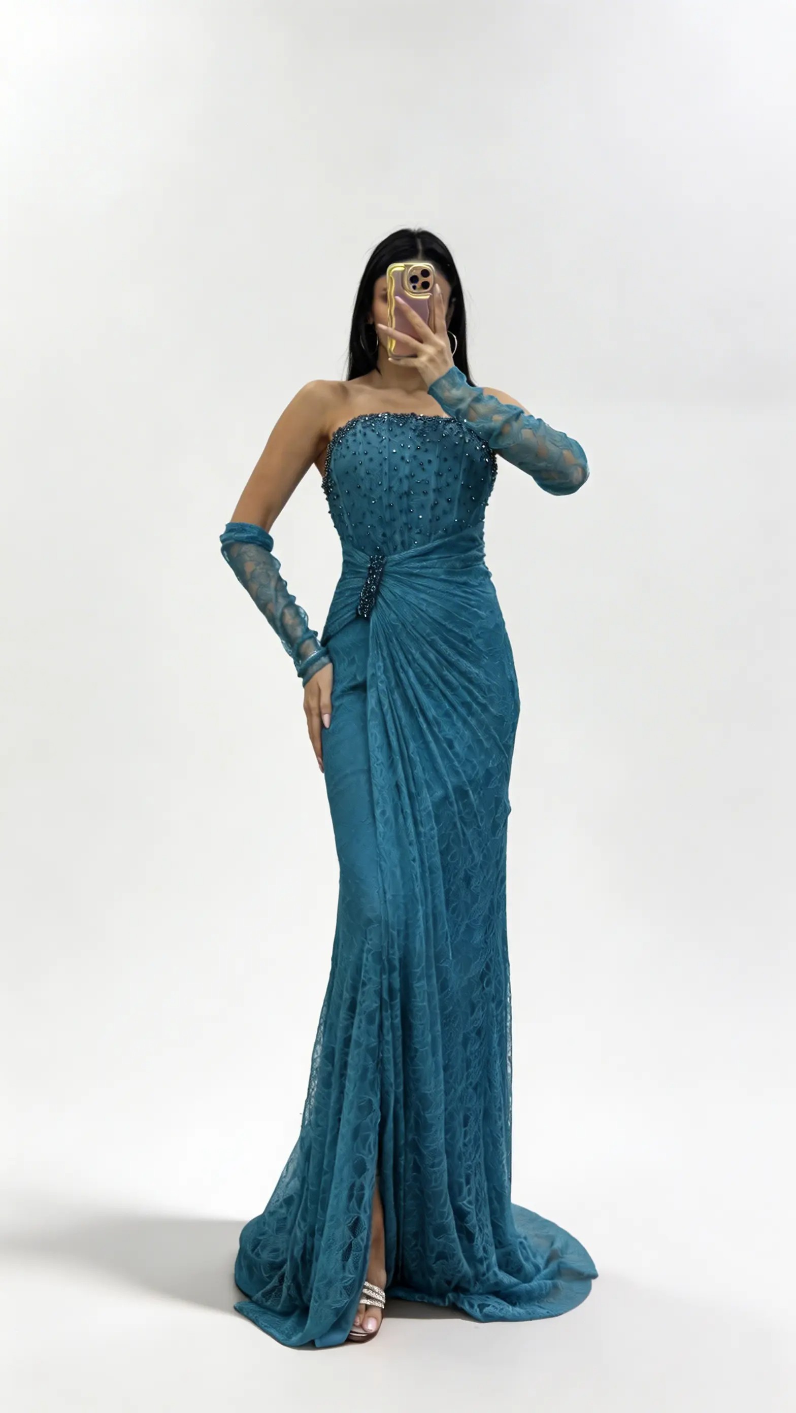 Petrolblaues trägerloses Abendkleid aus Spitze mit Steinschnalle