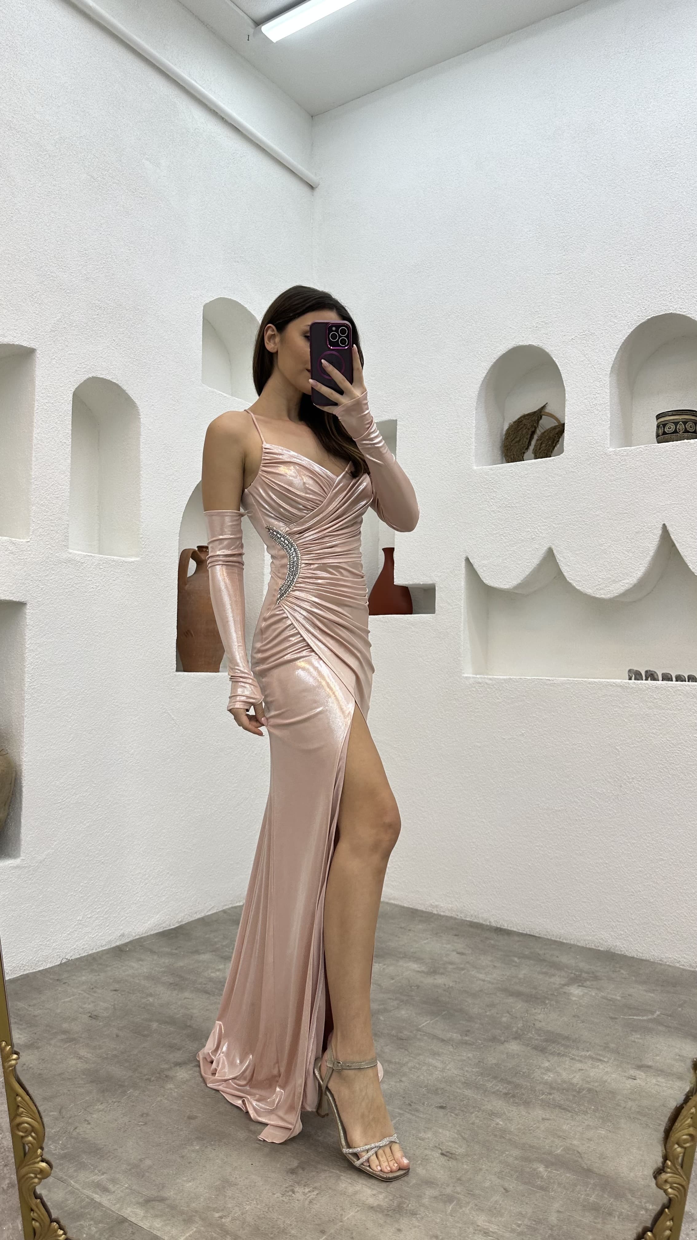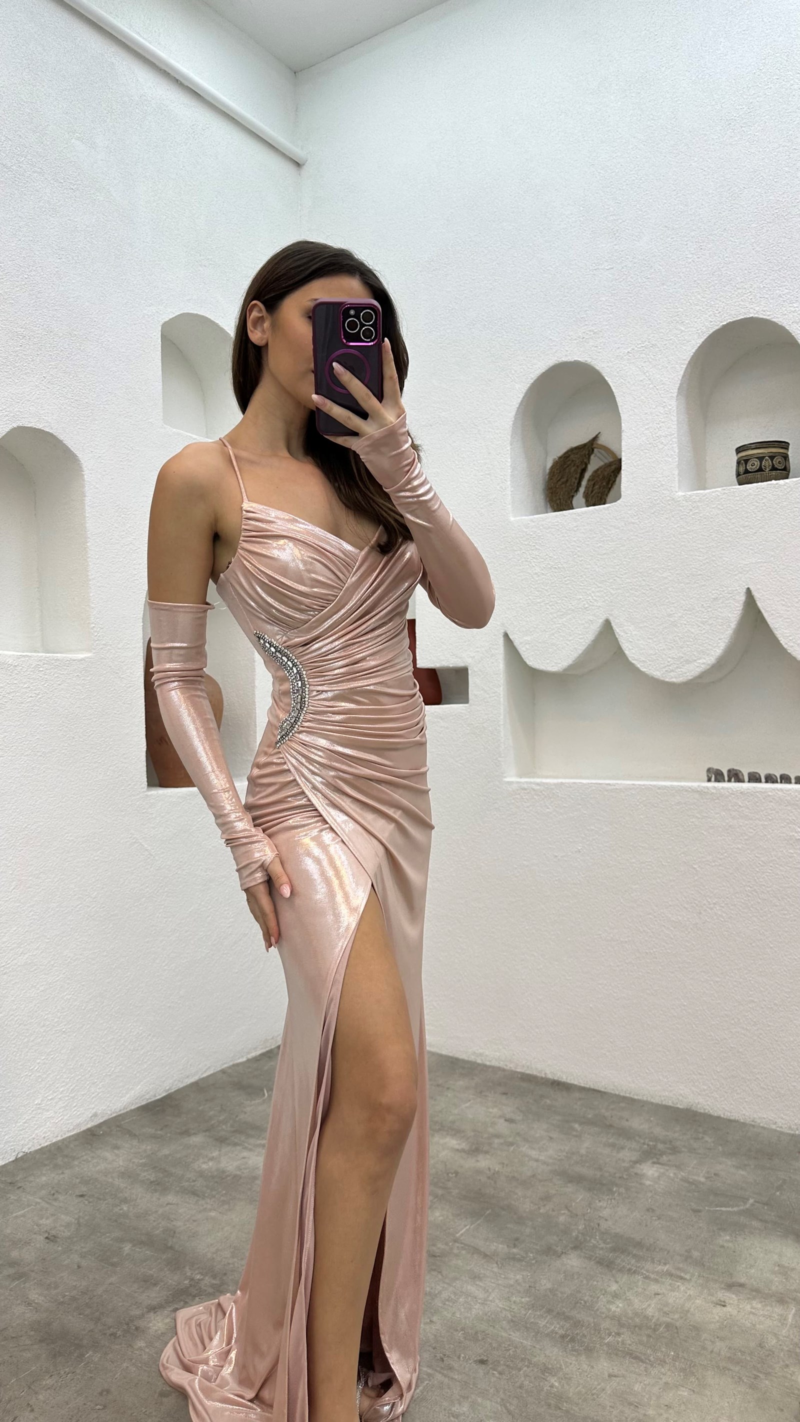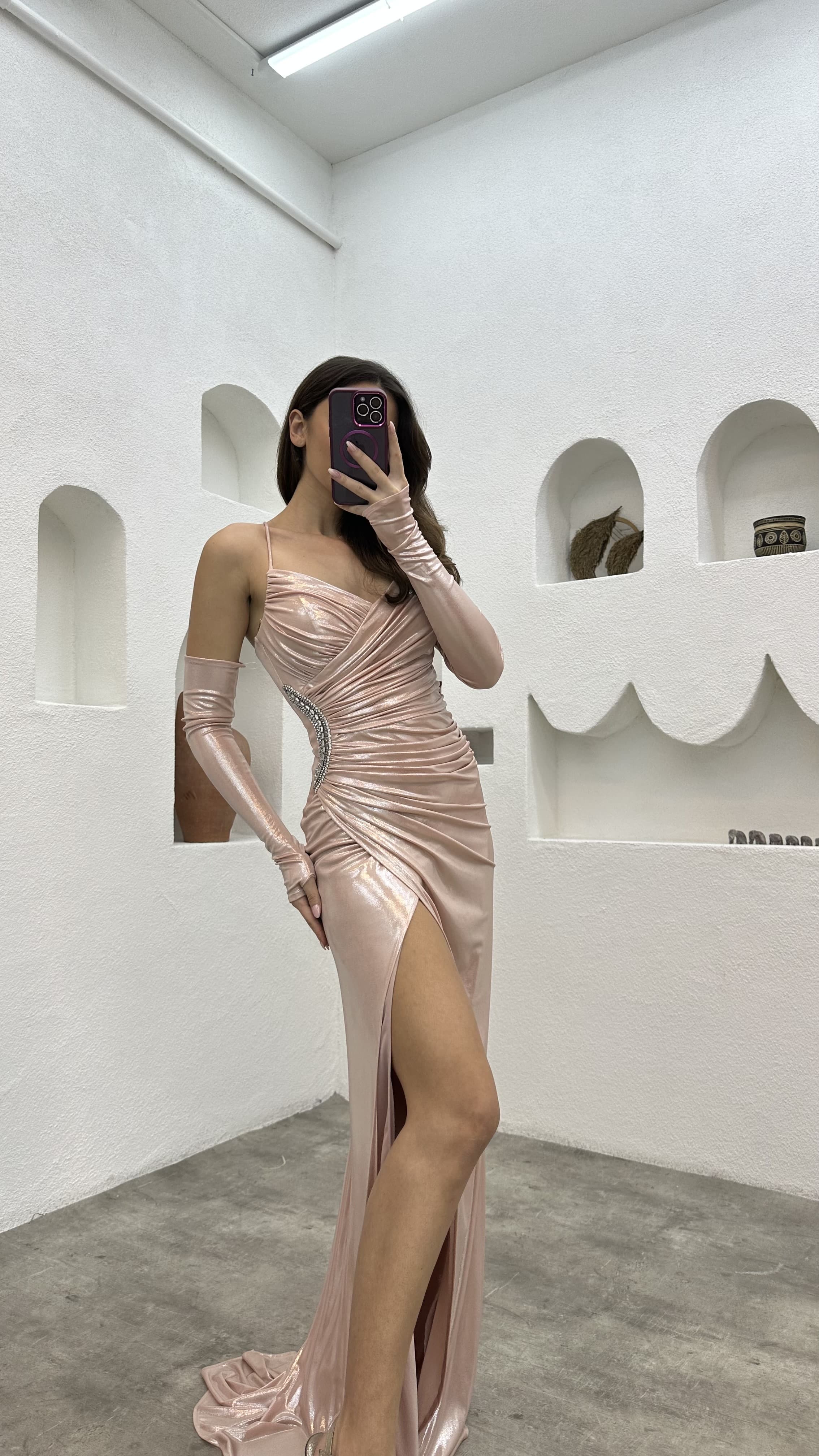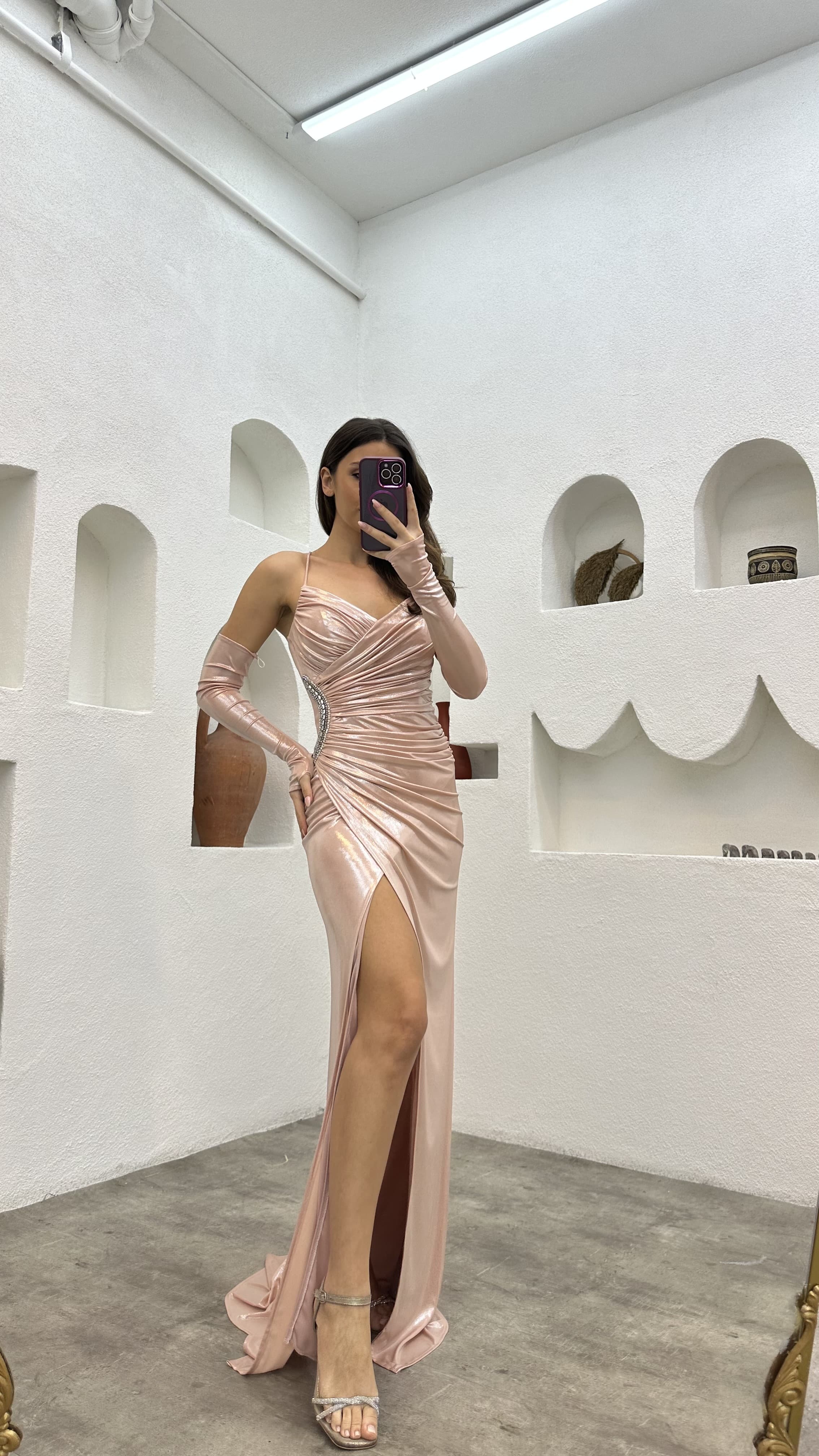• Pudra İp Askılı Beli İşlemeli Saten Abiye Elbise