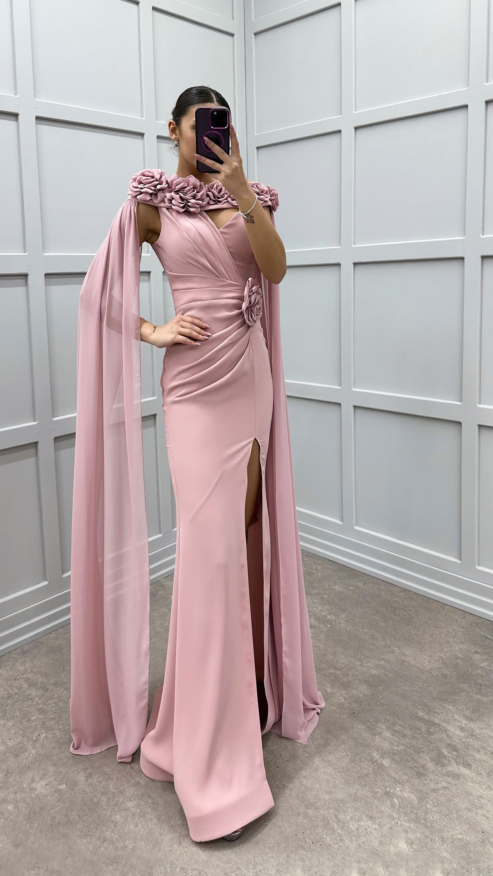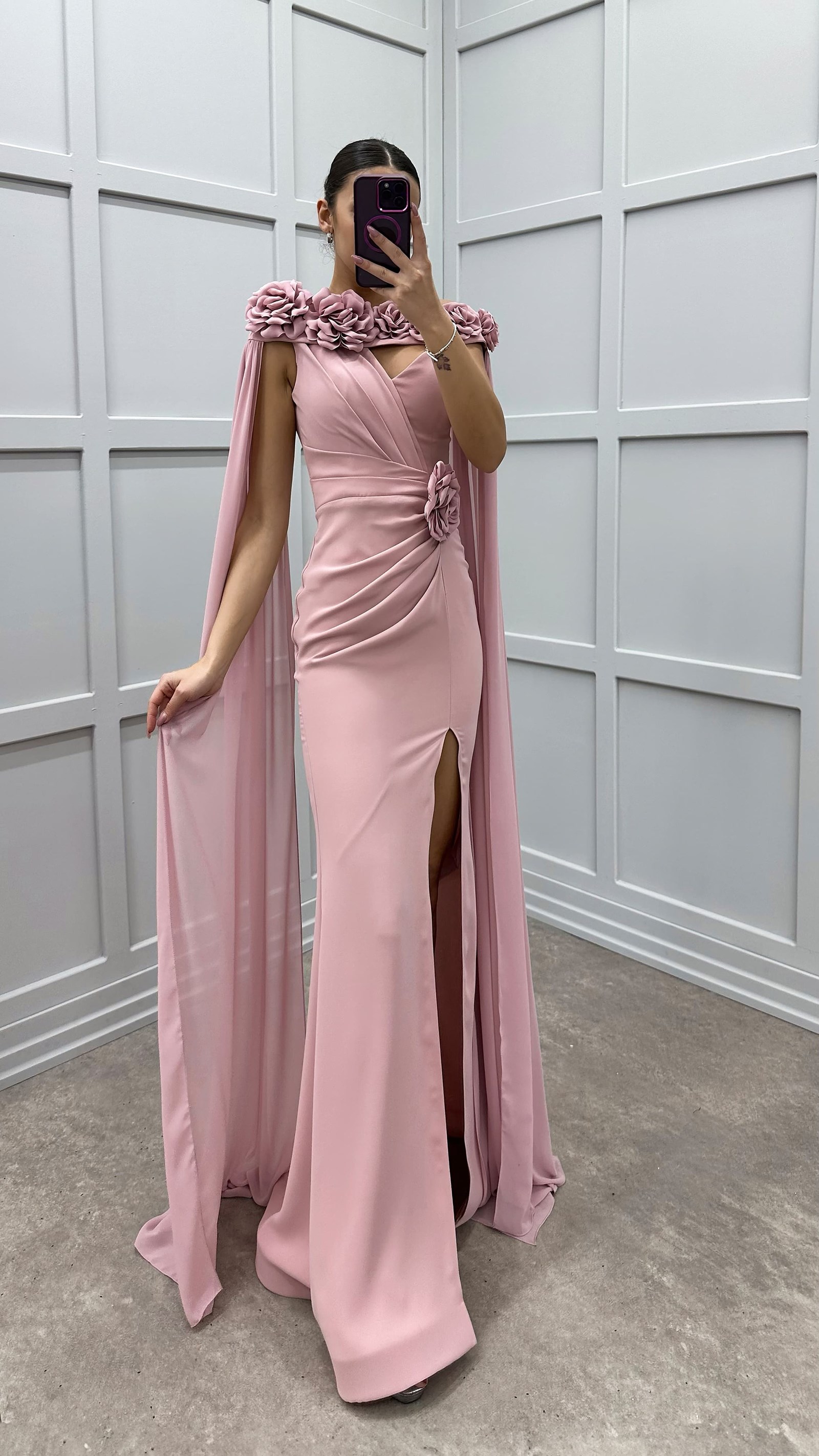 • Pudra Omuzları Gül Detay Abiye Elbise