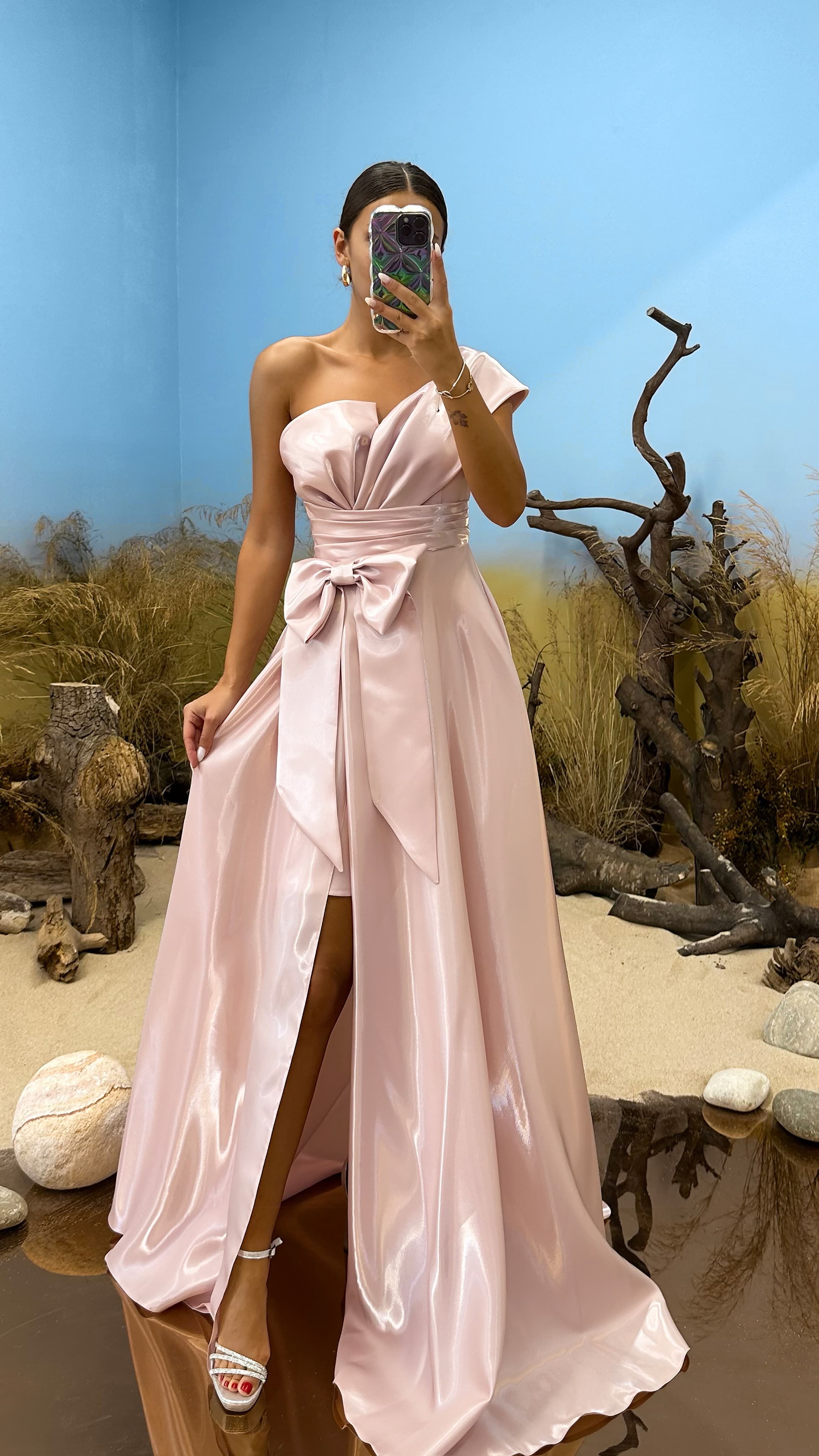 • Pudra Tek Kol Fiyonk Detay Abiye Elbise