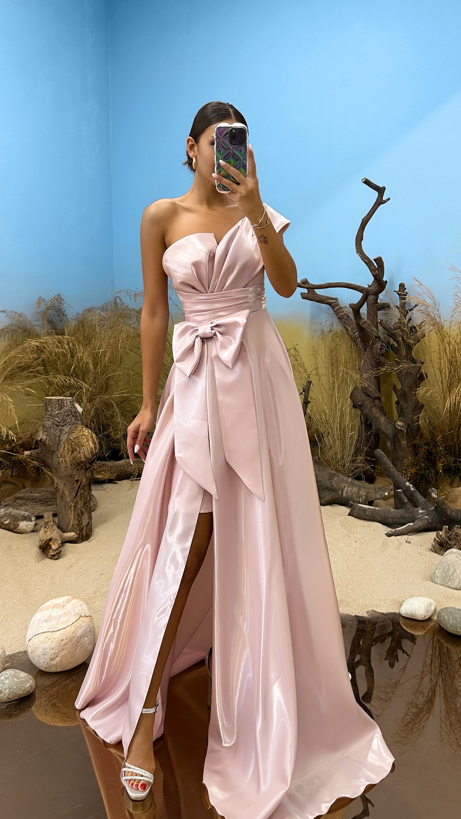 Puderfarbenes, einärmliges Abendkleid mit Schleifendetail