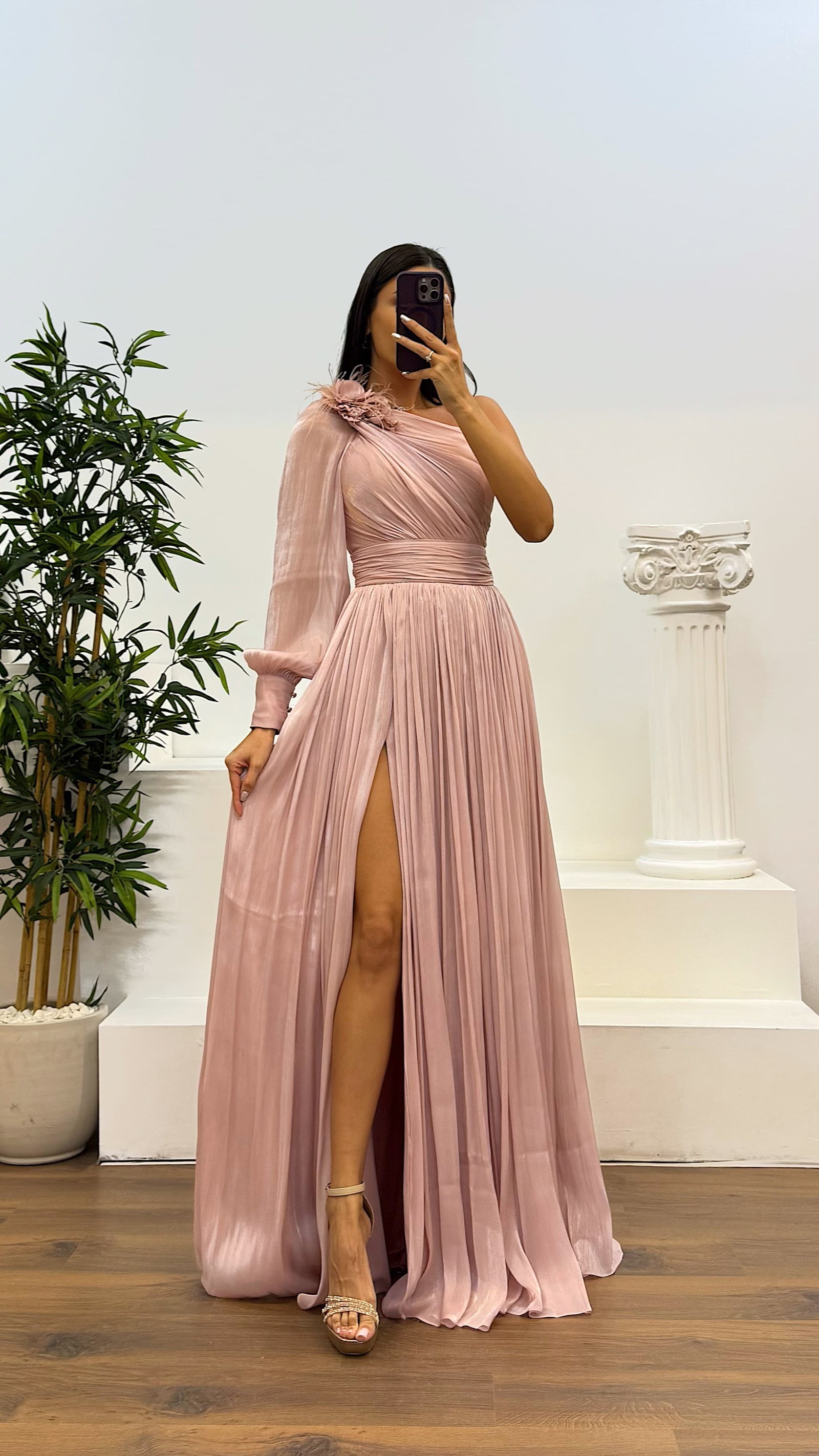 • Soğan Kabuğu Tek Kol Piliseli Abiye Elbise