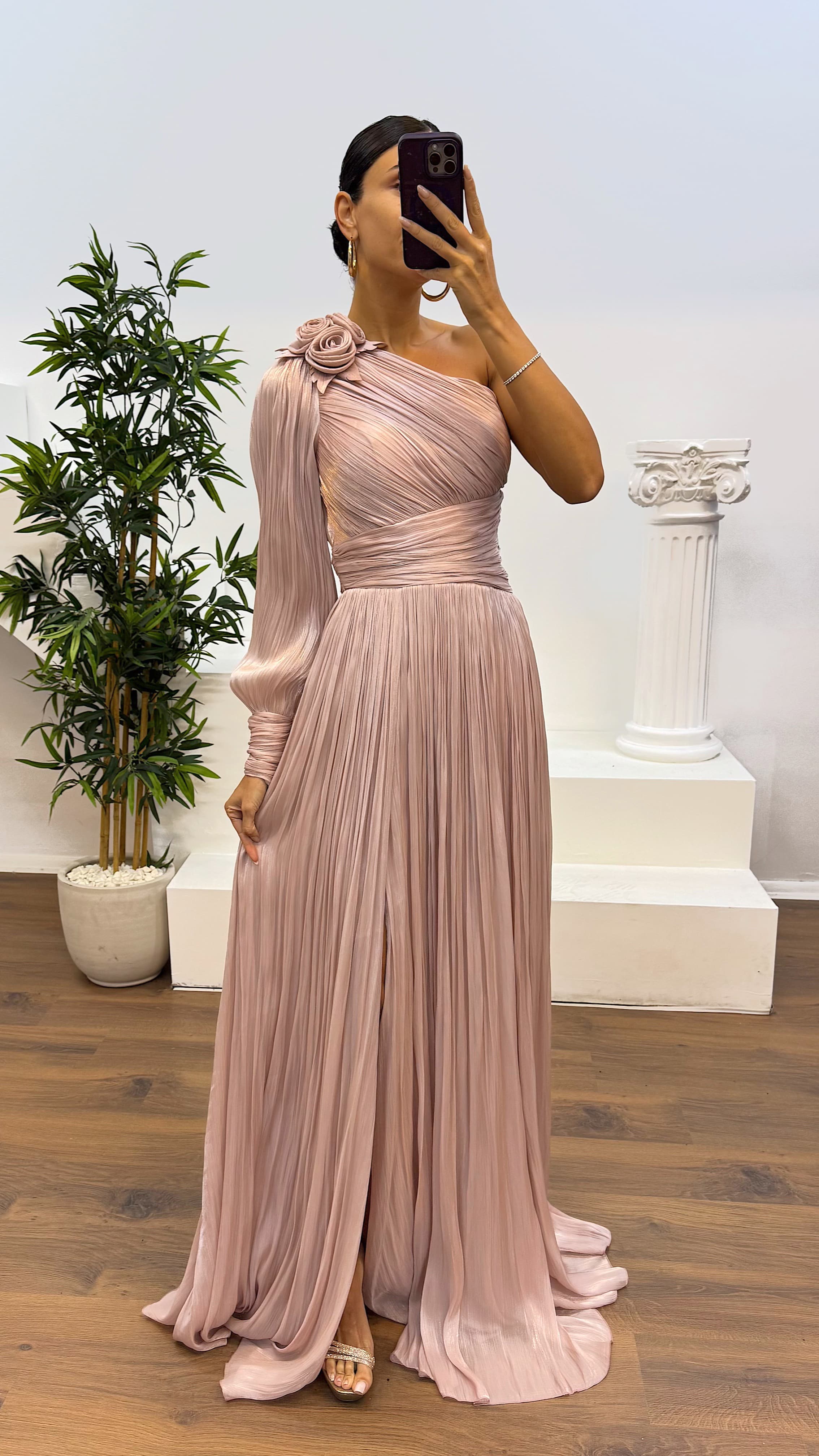 • Pudra Tek Kol Piliseli Şifon Abiye Elbise