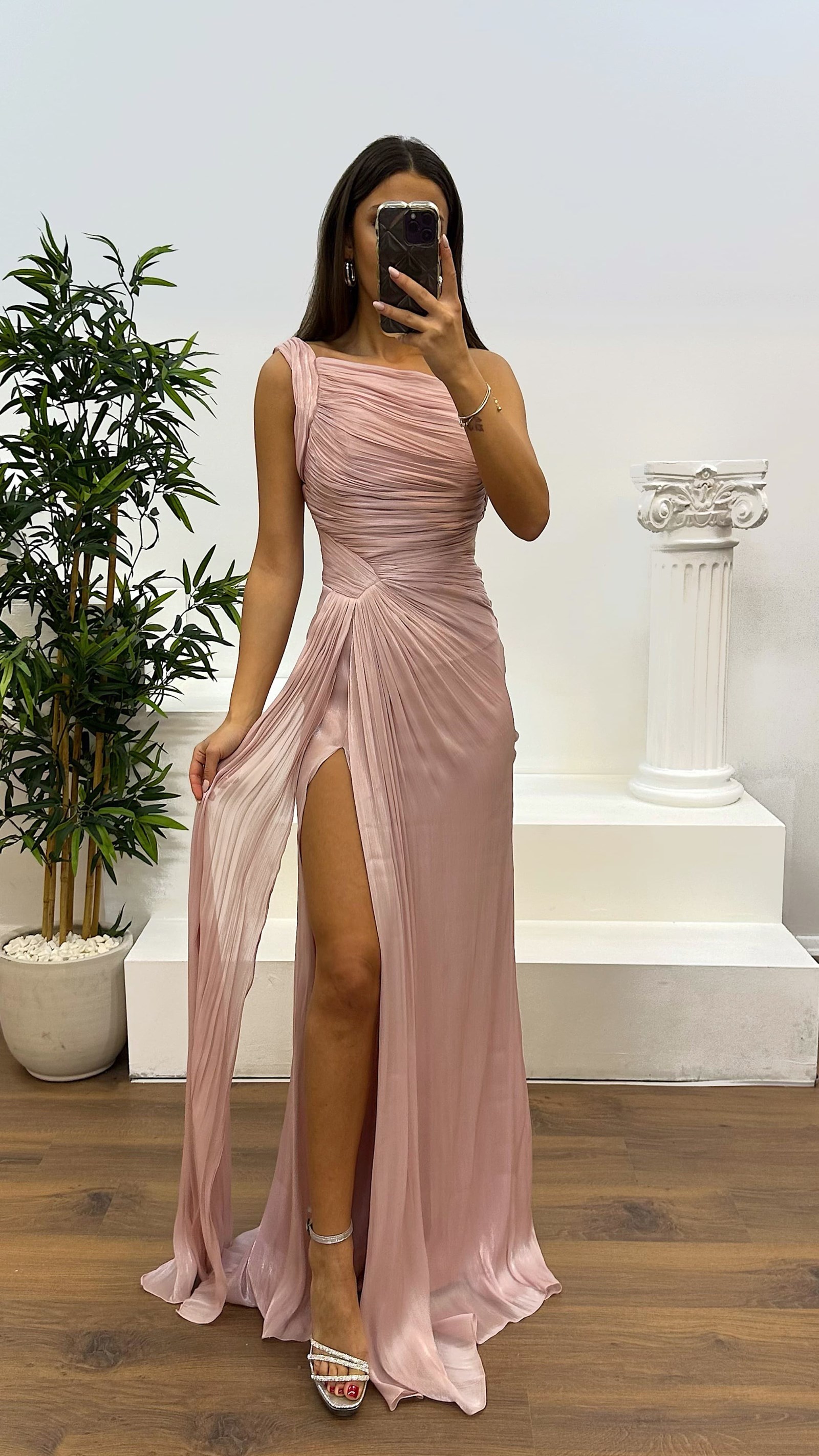 Ein-Schulter-Abendkleid mit Drapierung Das Produkt ist als ein einschulteriges, drapiertes Abendkleid mit Brustpolstern, Futter, Schlitz, einer Schulter, passend für die Größen 36-44, konzipiert. Länge des Produkts: Kann zwischen 175-170 cm variieren. Stoffart: Chiffon 66% Viskose 34% Polyester