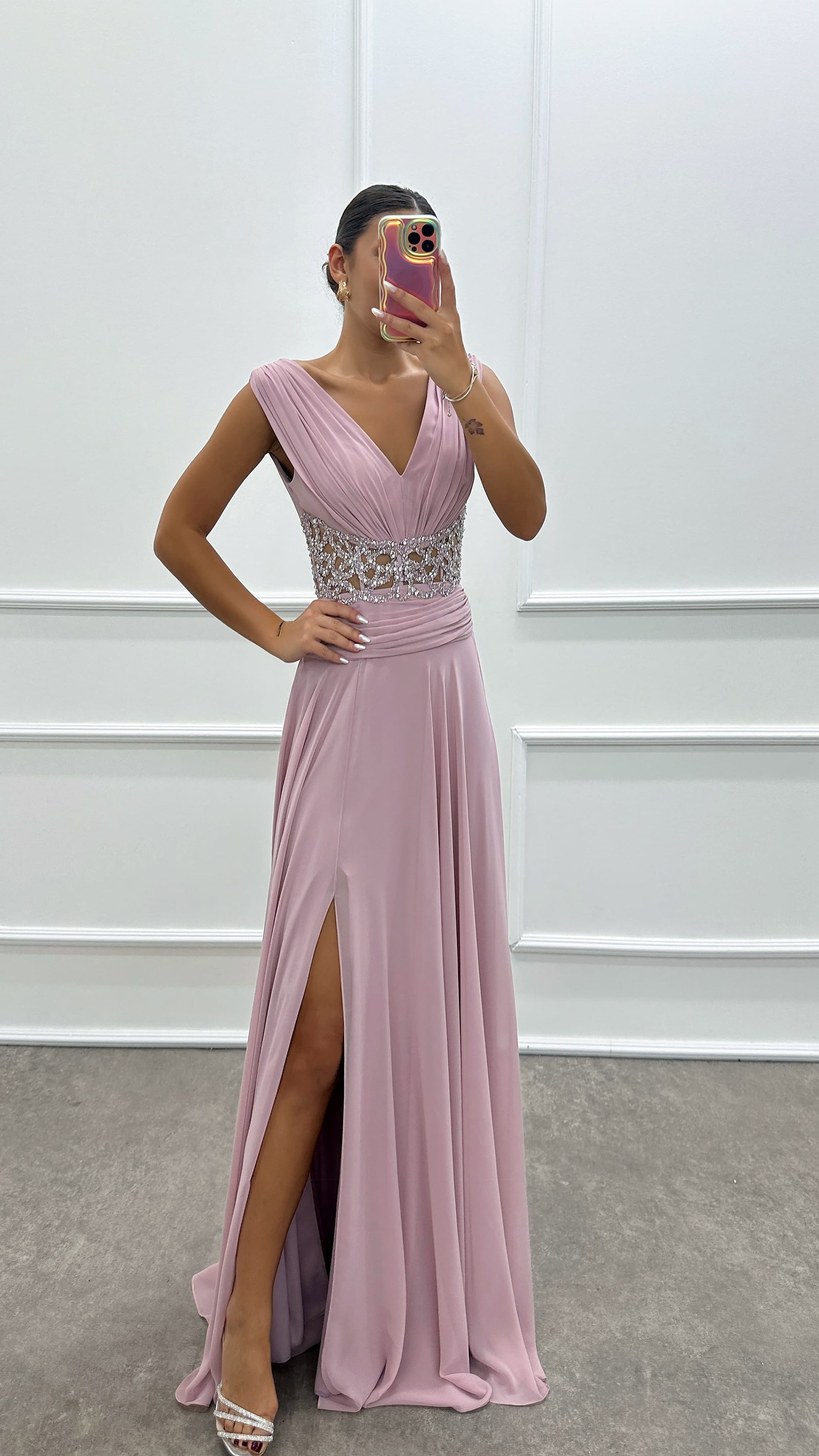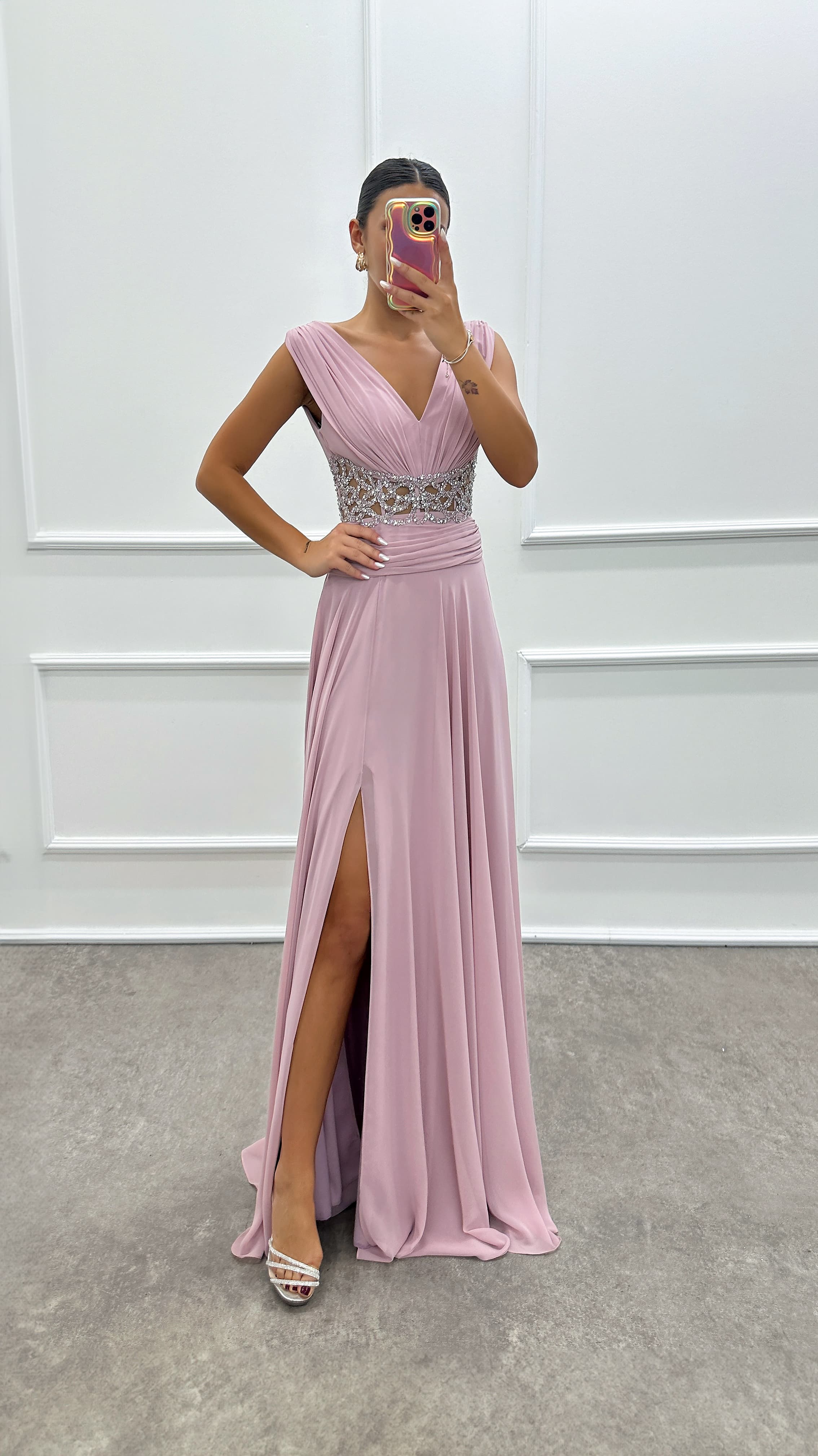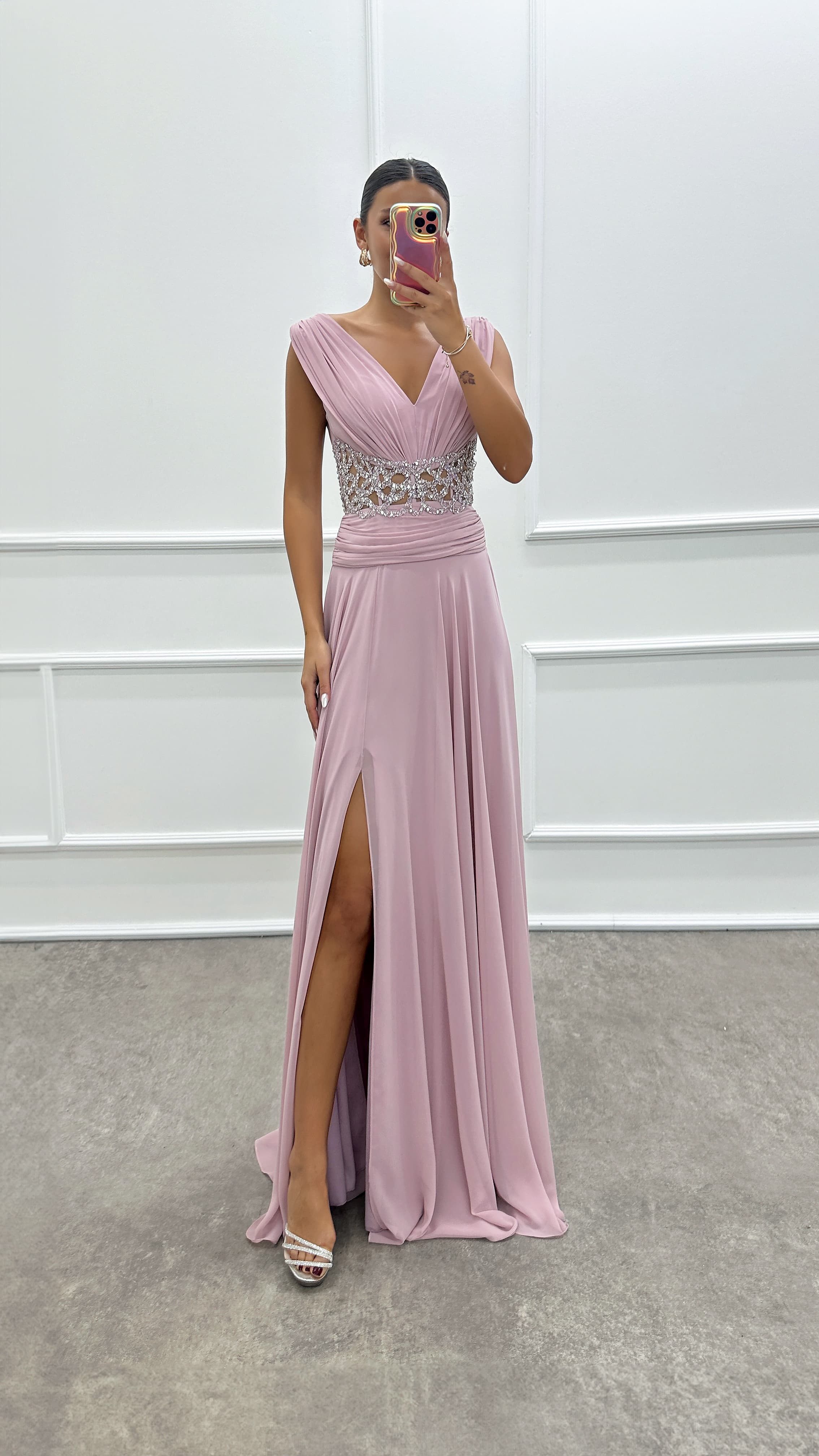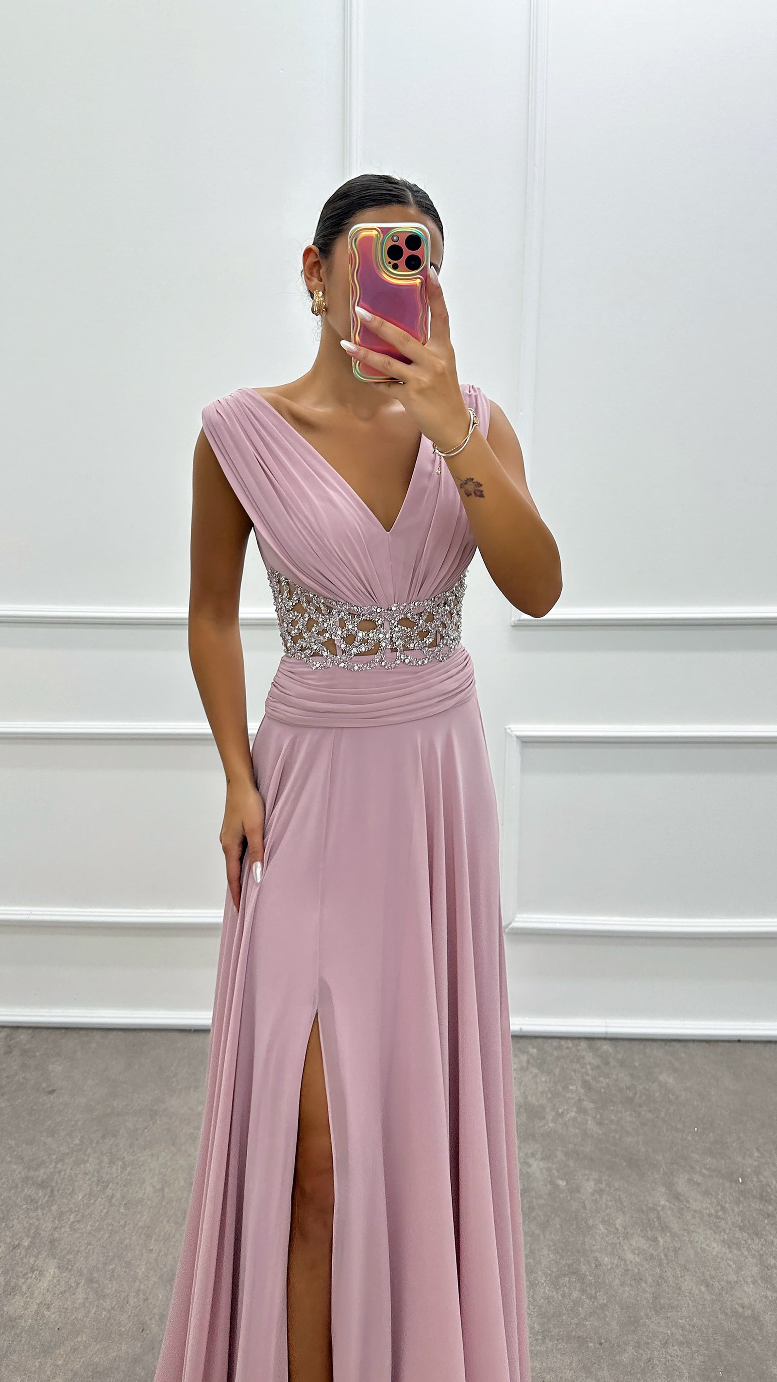Pudra V Yaka Beli Transparan Taşlı Tasarım Elbise