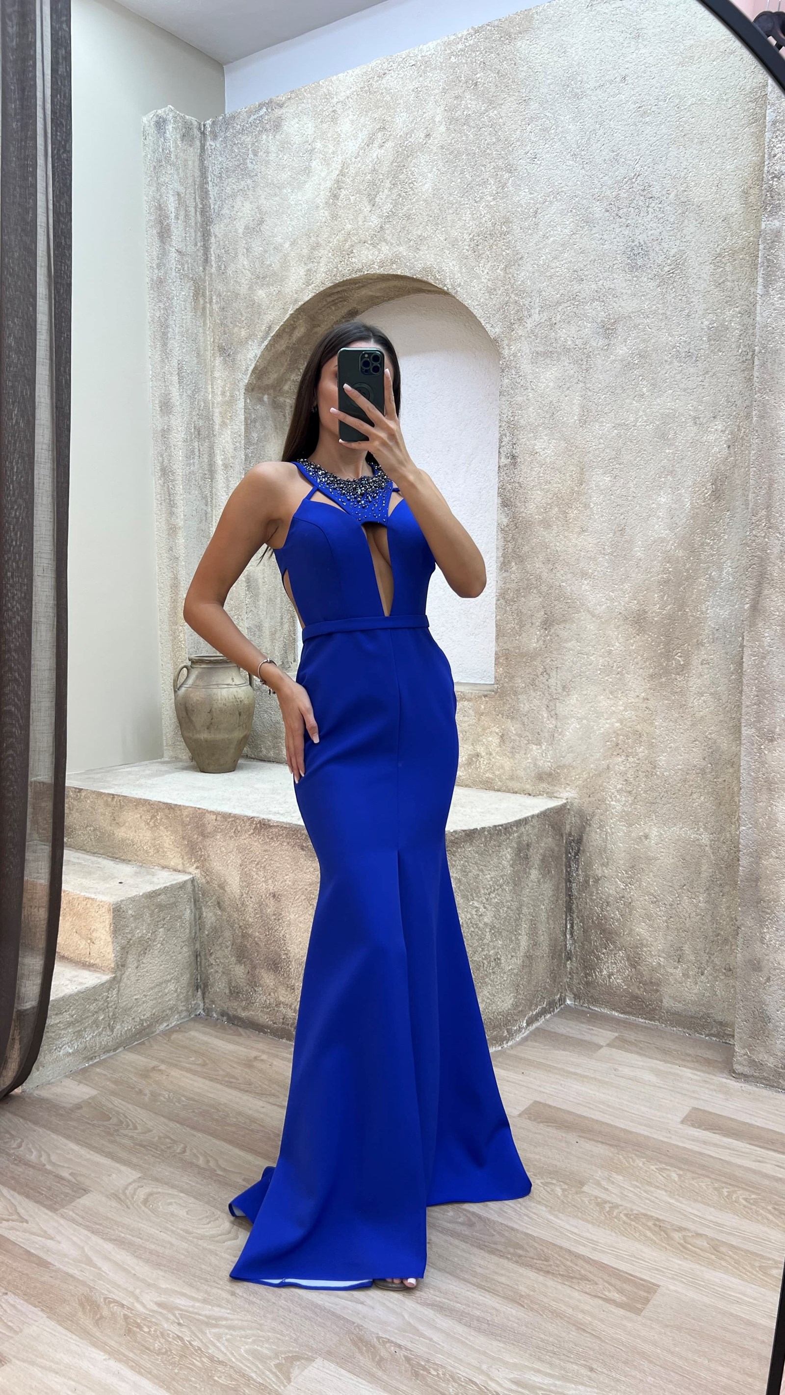 • Siyah Boyun Detay İşlemeli Tasarım Abiye Elbise