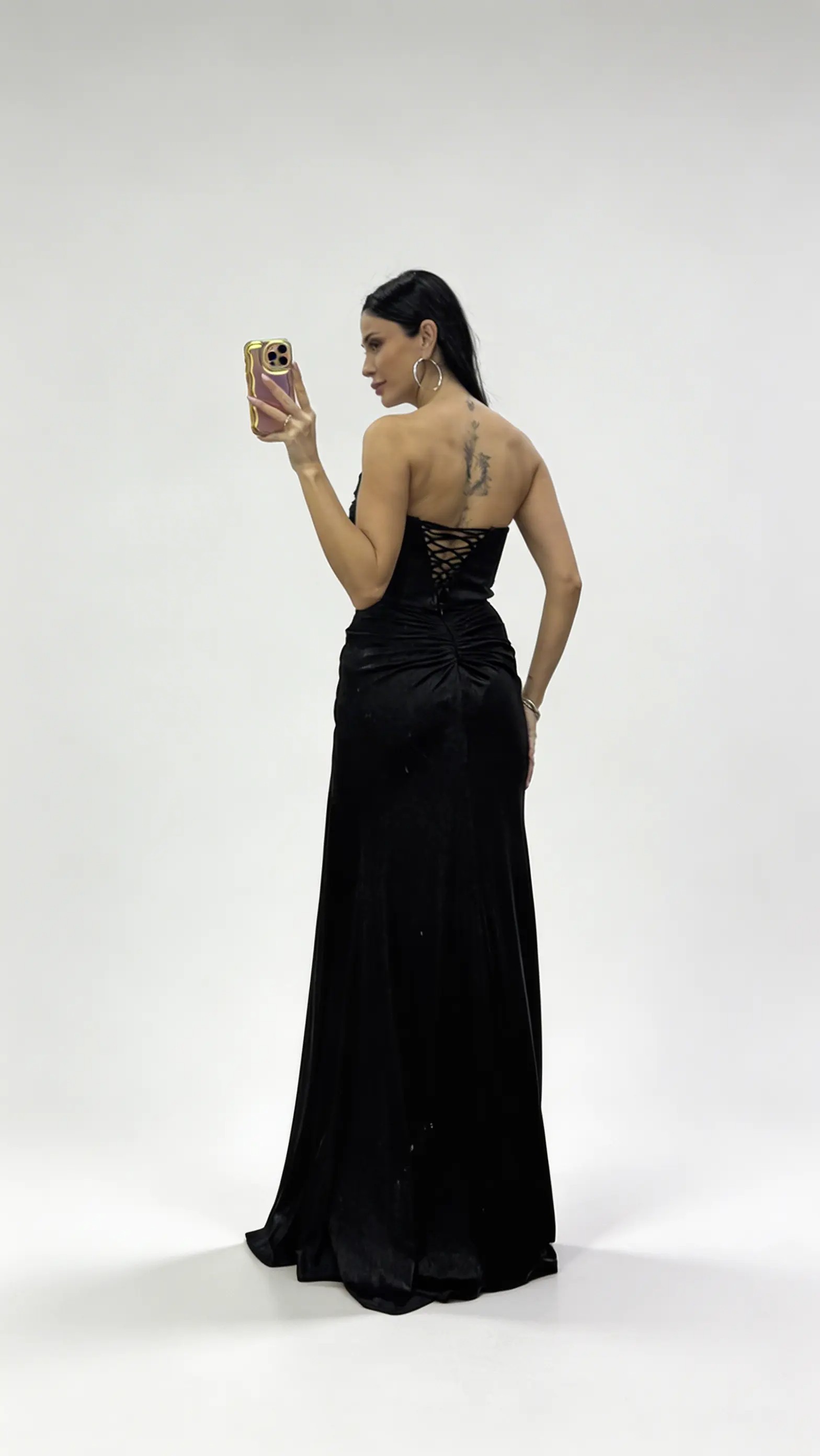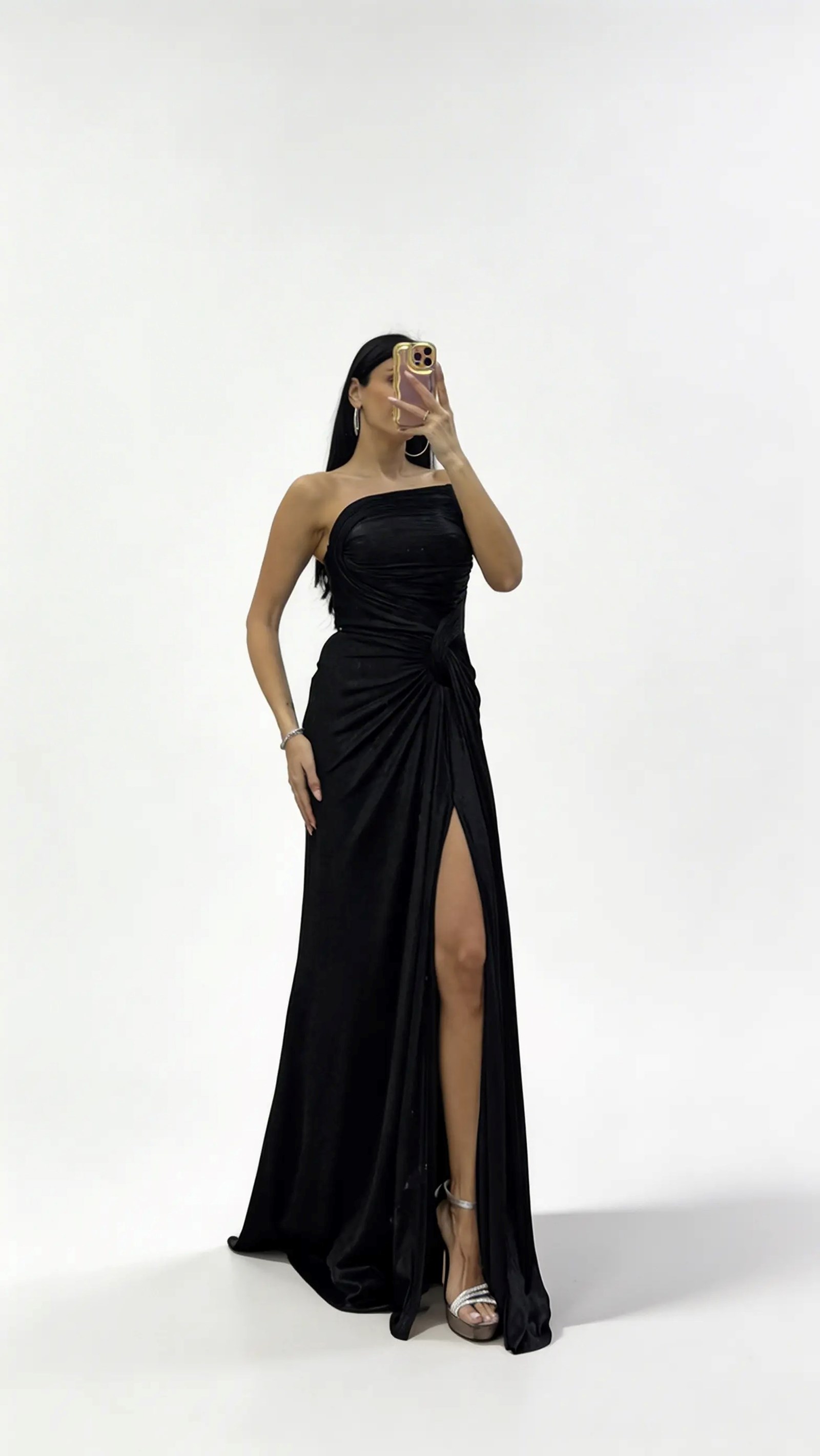 • Siyah Drapeli Düğüm Detaylı Uzun Abiye Elbise