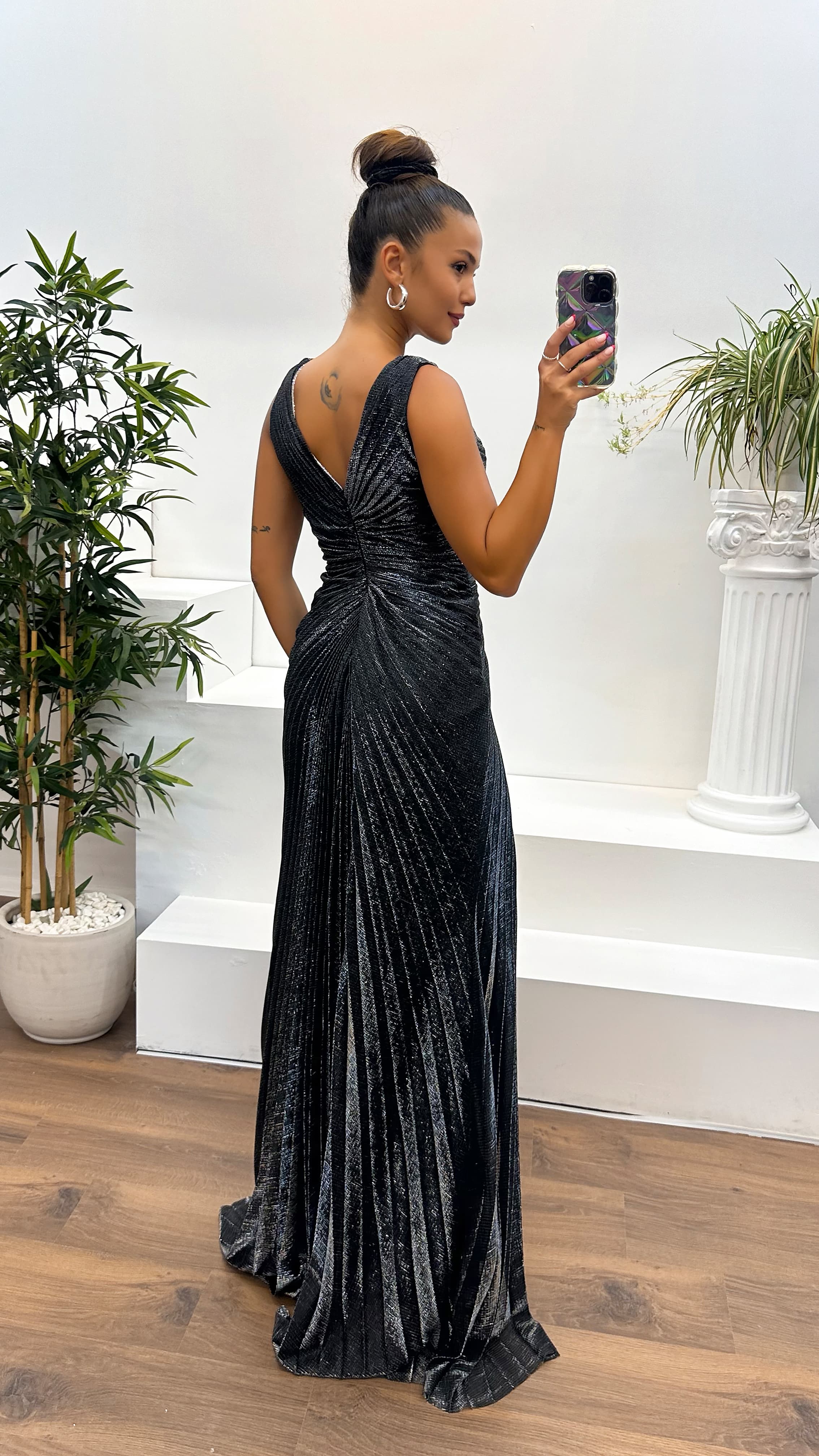 • Gümüş V Yaka Taş Detay Abiye Elbise
