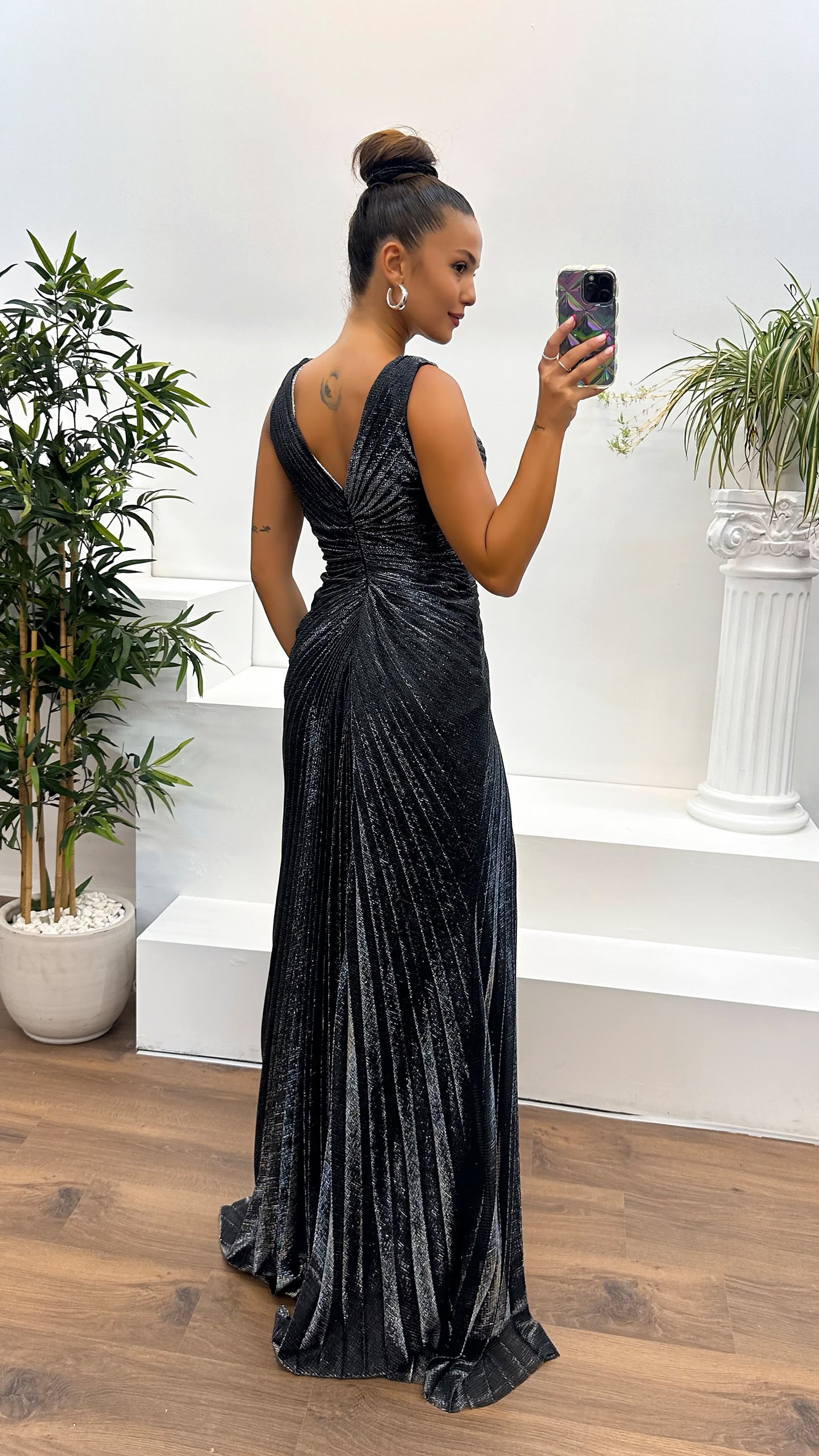 • Siyah Gümüş V Yaka Taş Detay Abiye Elbise