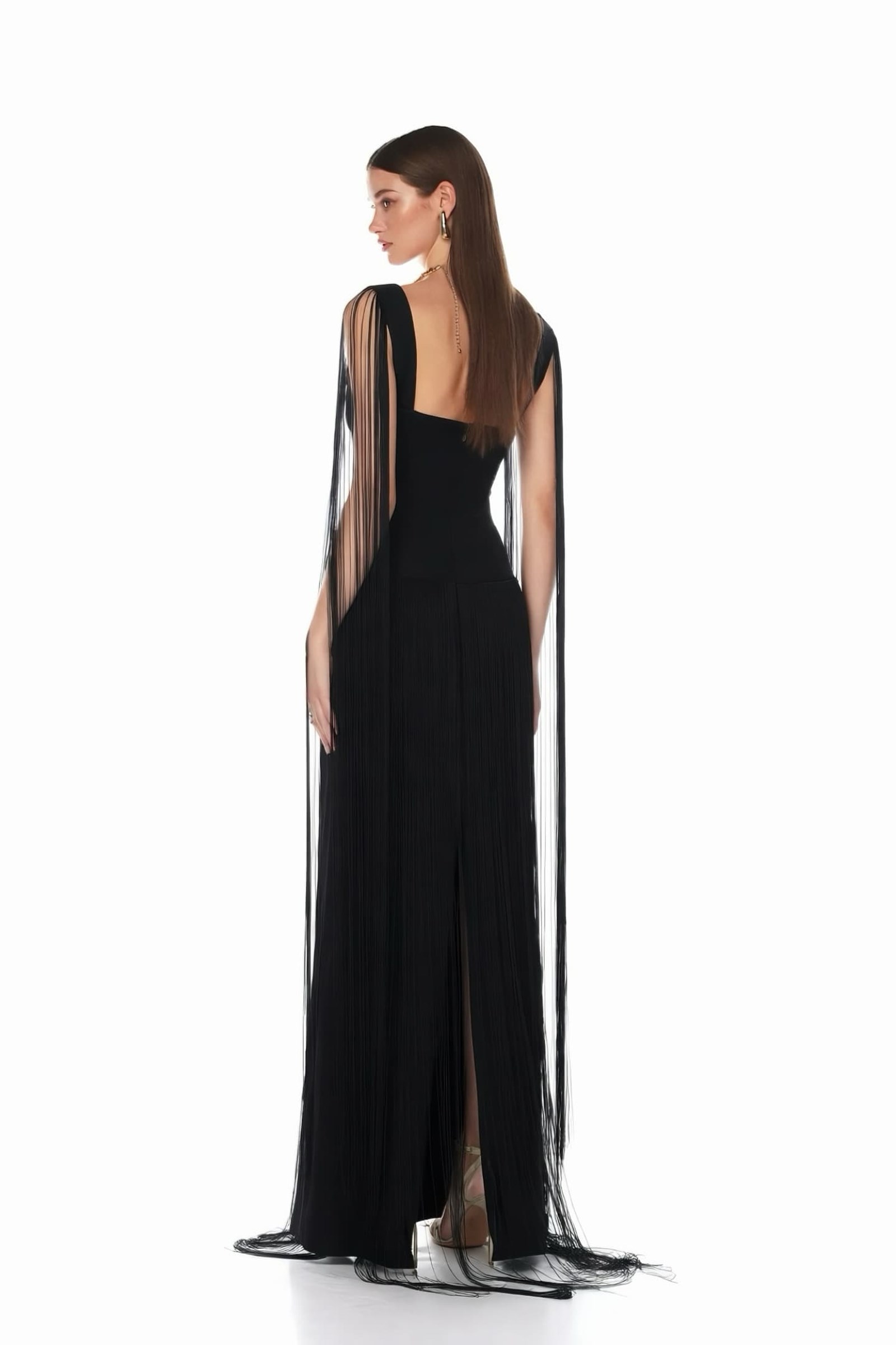 • Siyah Kare Yaka Püsküllü Abiye Elbise