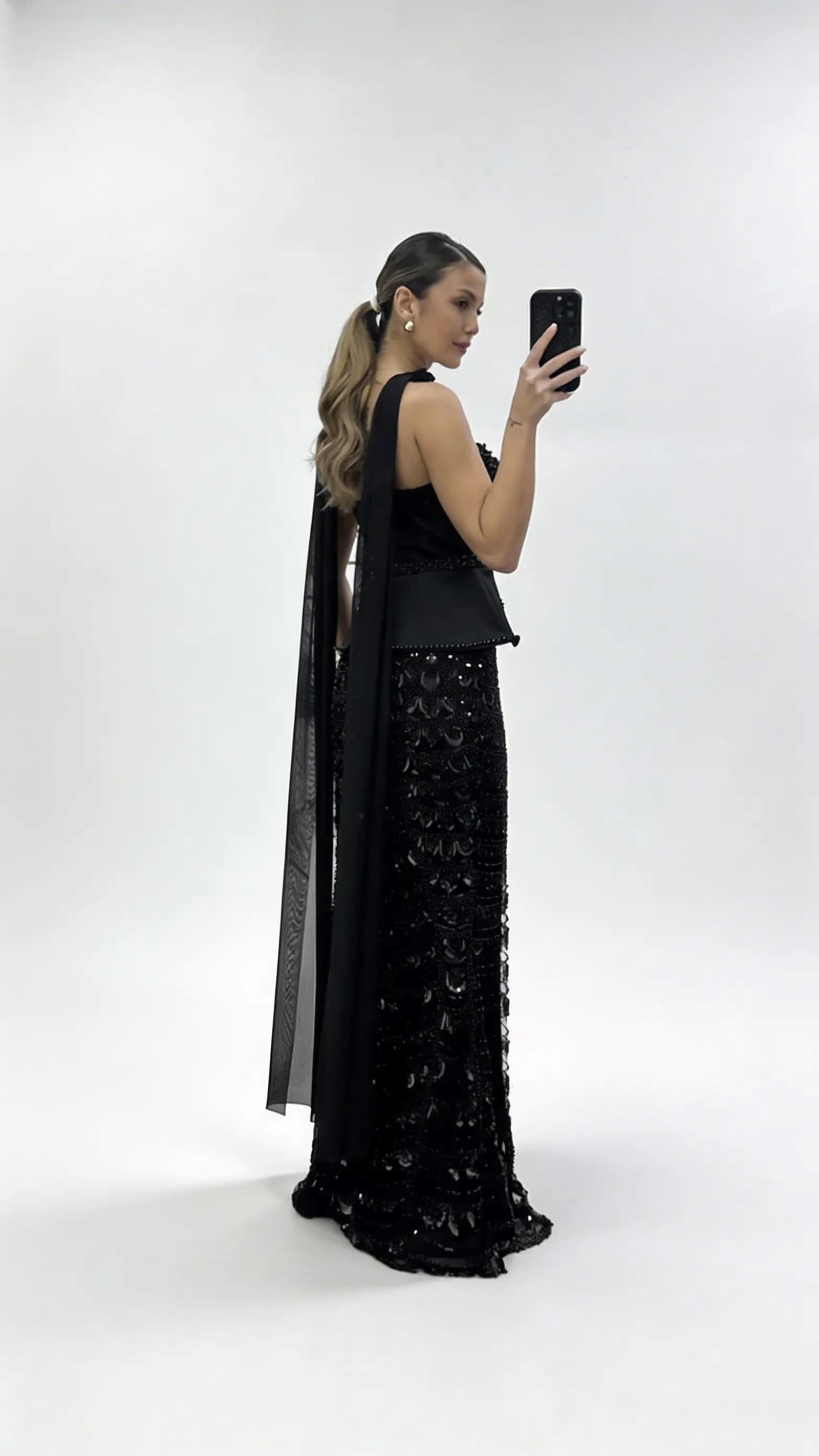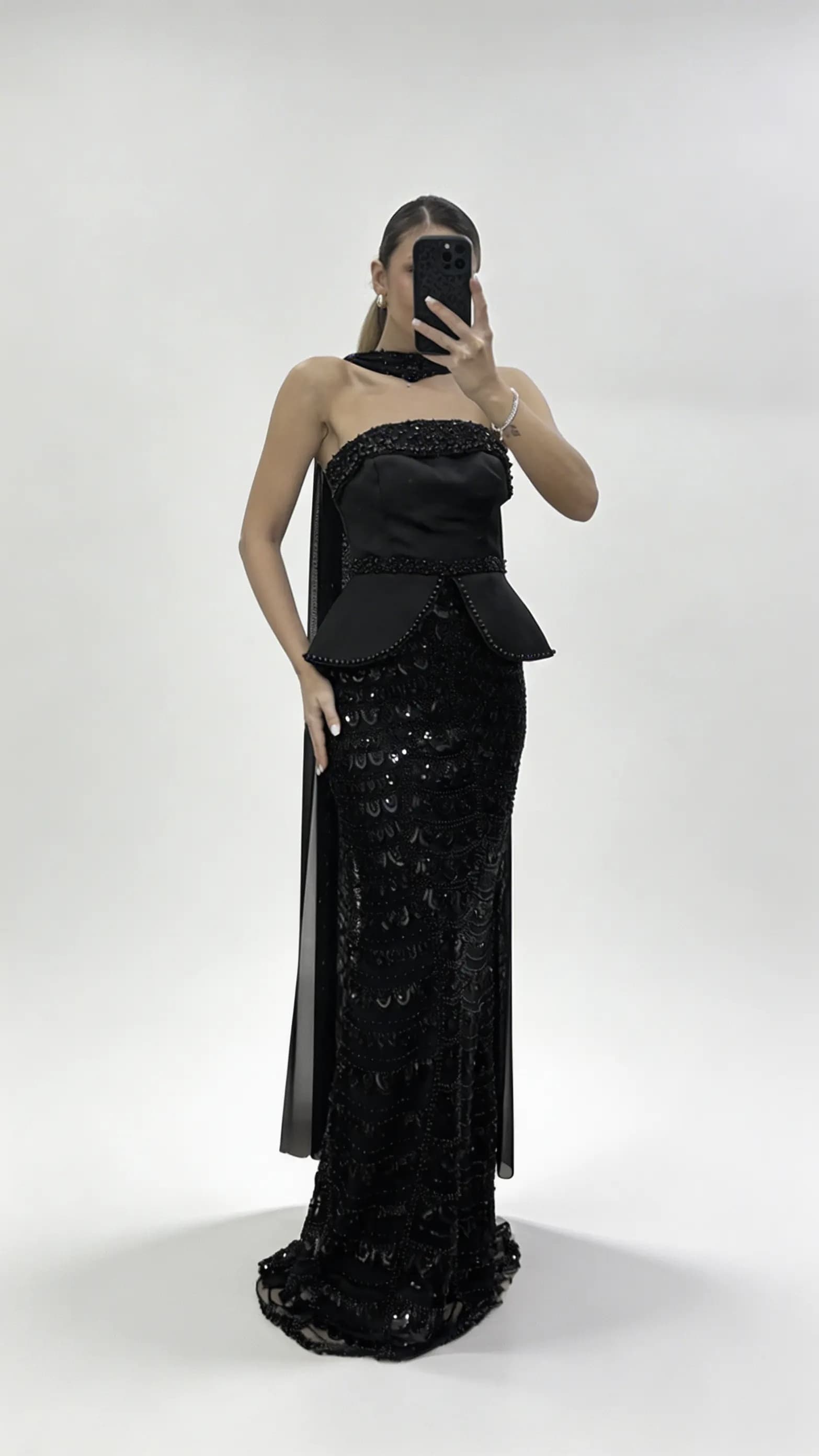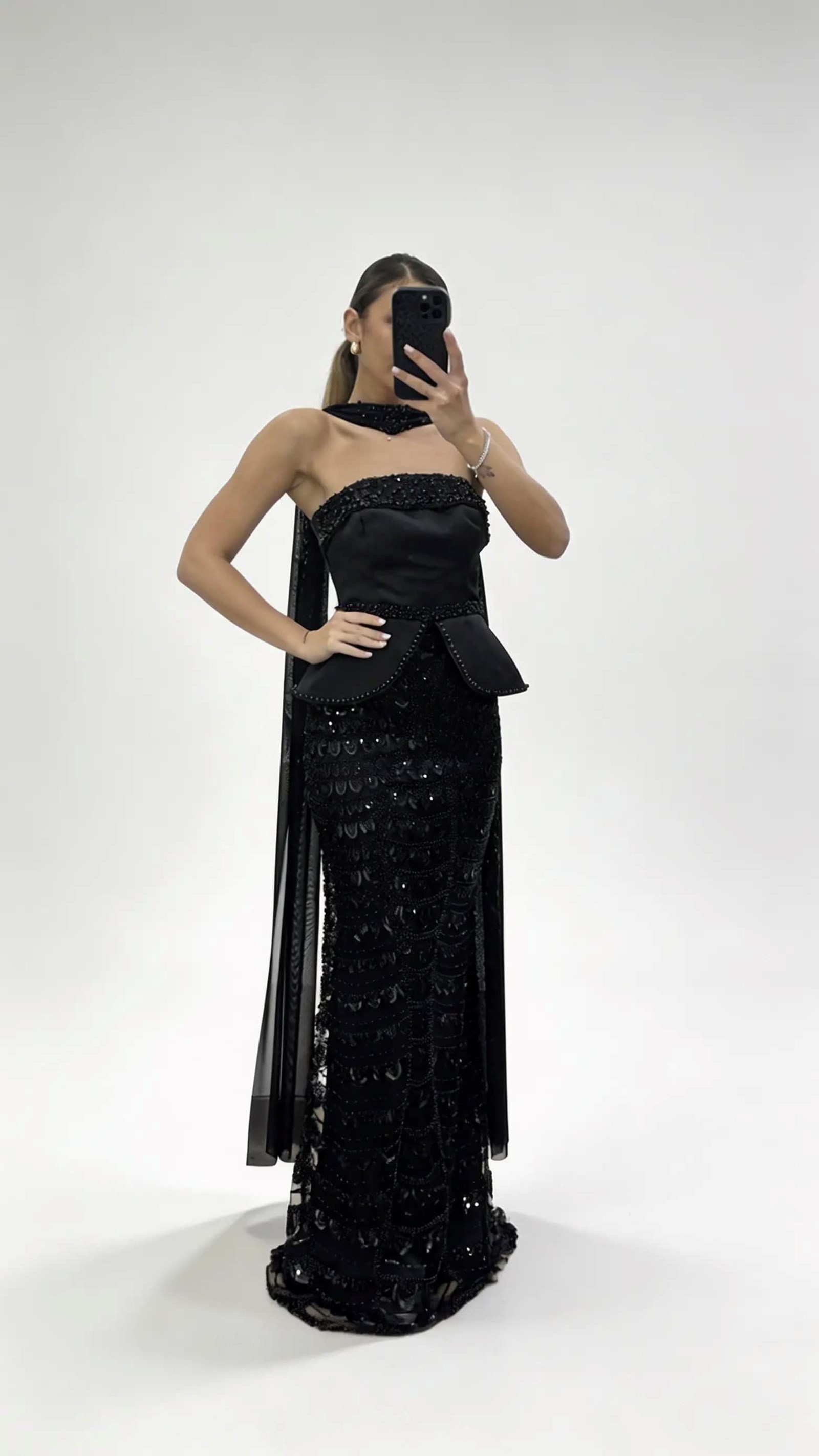 Schwarzer  perlenbesetzter Schal  schößchenförmiges  mit Tüll verziertes Abendkleid