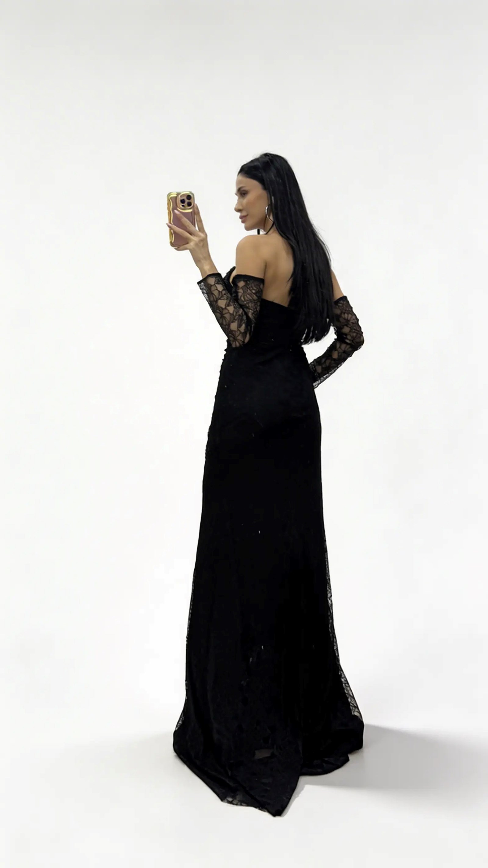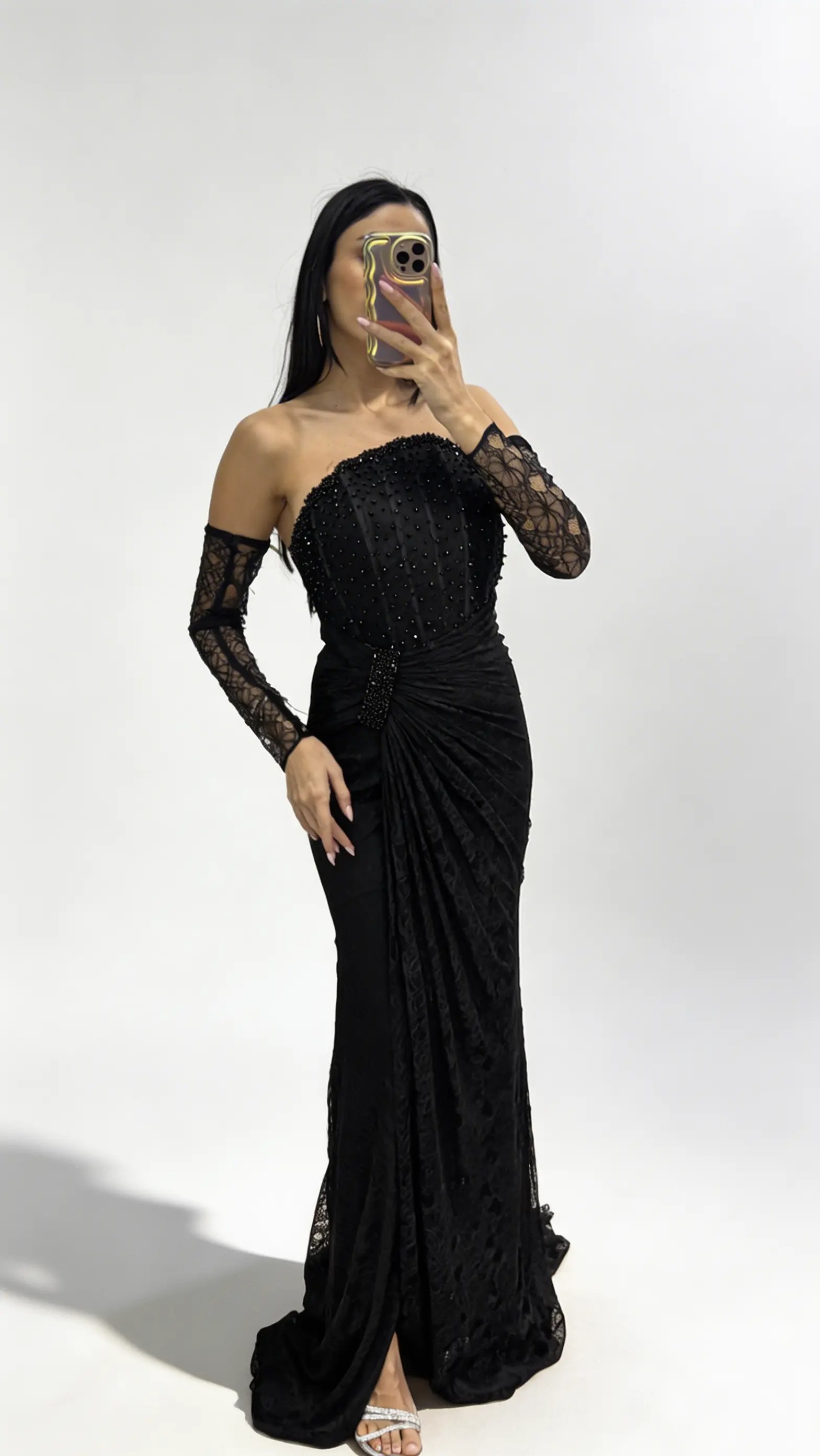 Schwarzes  trägerloses Abendkleid aus Spitze mit Steinschnalle