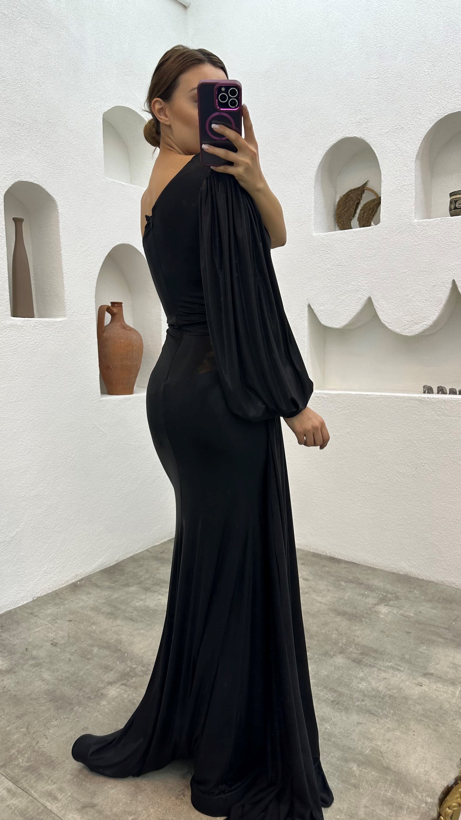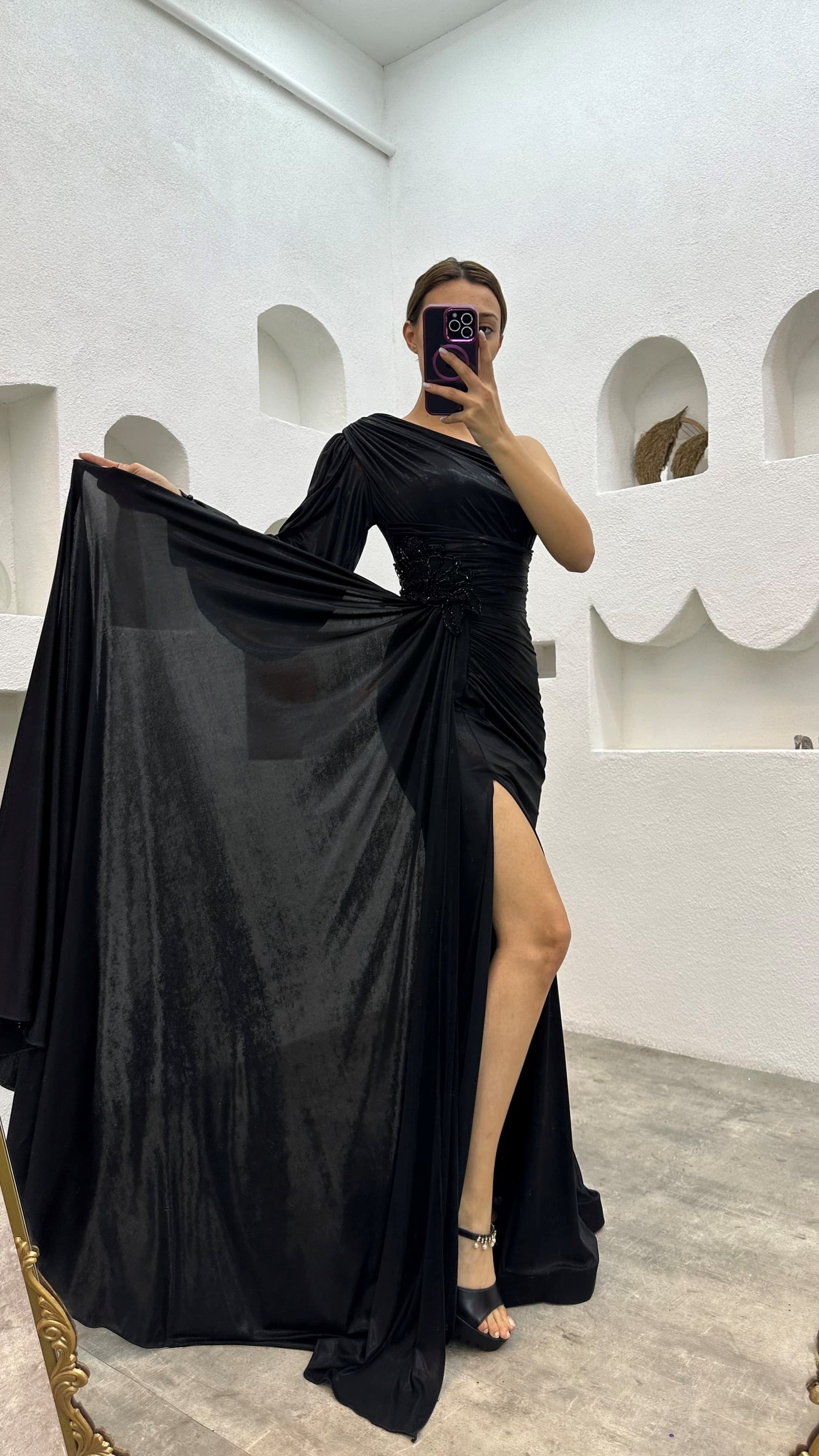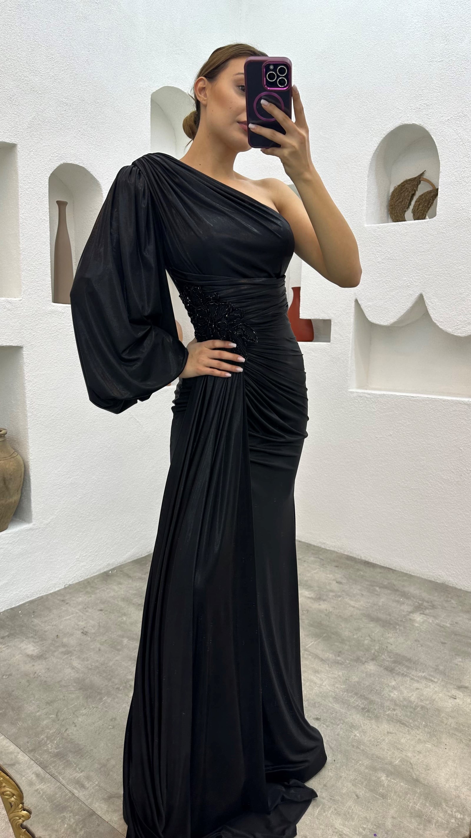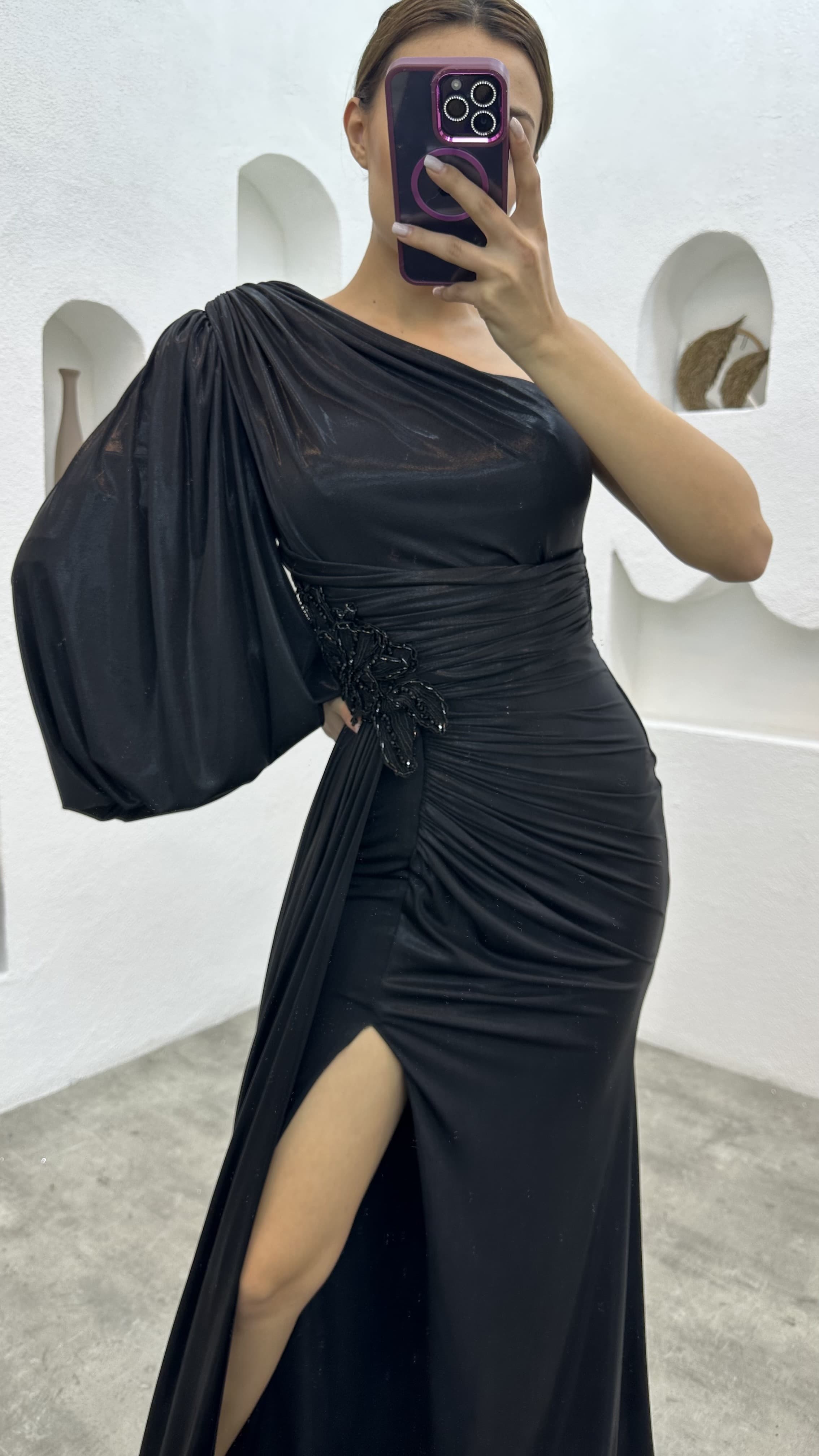 • Siyah Tek Kol Broş Detay Büzgülü Saten Abiye Elbise