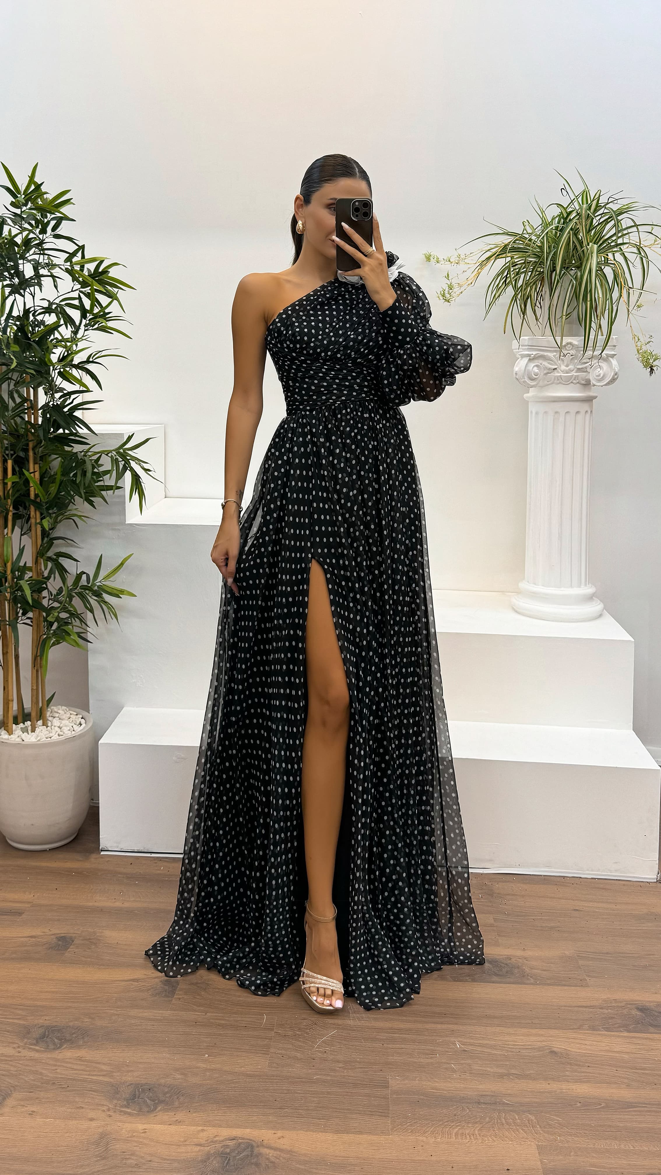 • Siyah Tek Kol Puantiyeli Abiye Elbise