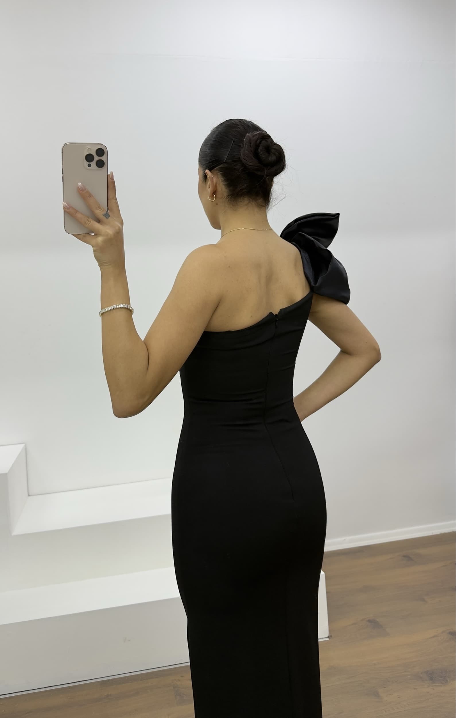 • Siyah Tek Omuz Fiyonk Detaylı Straplez Kalem Abiye Elbise