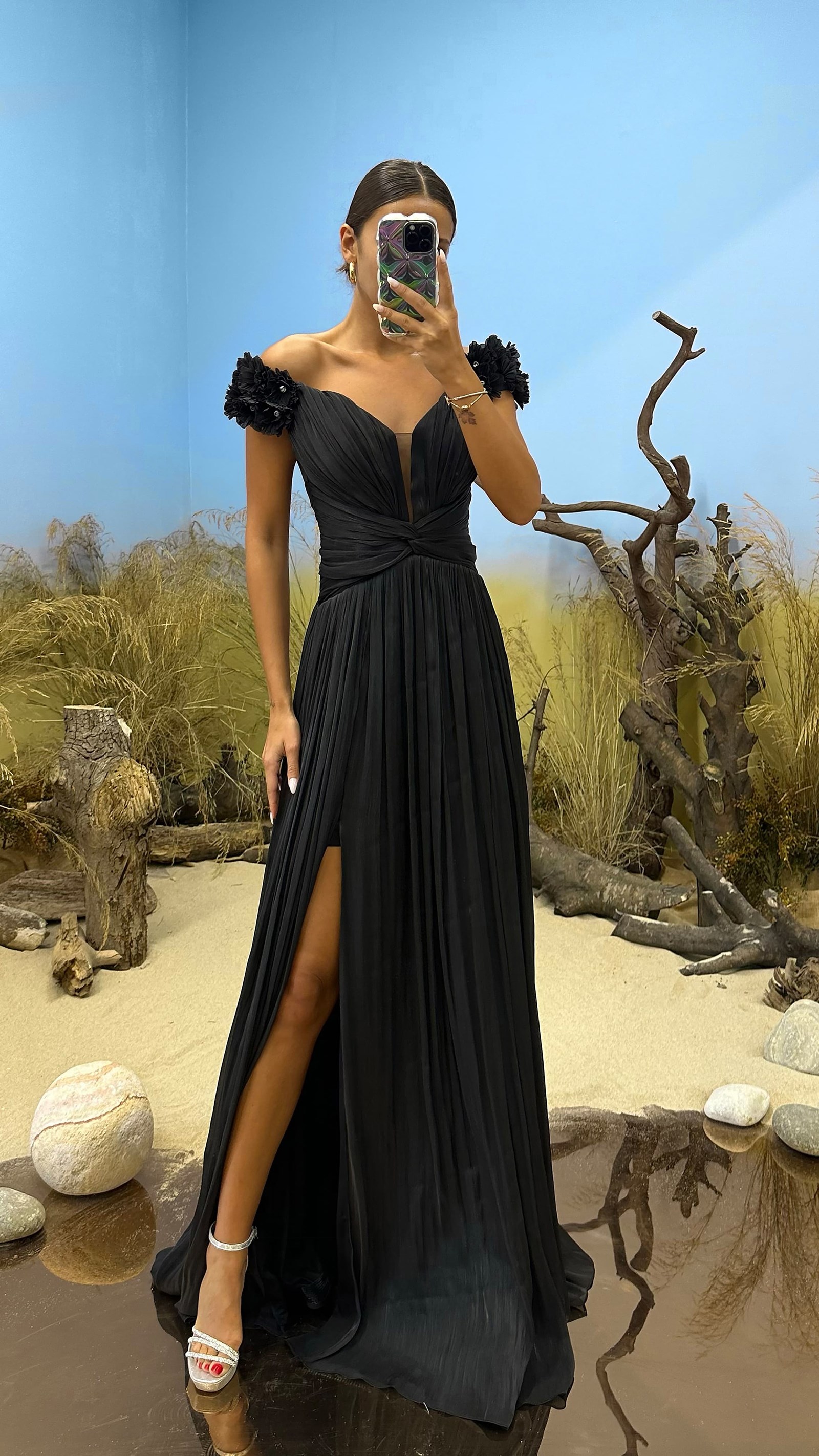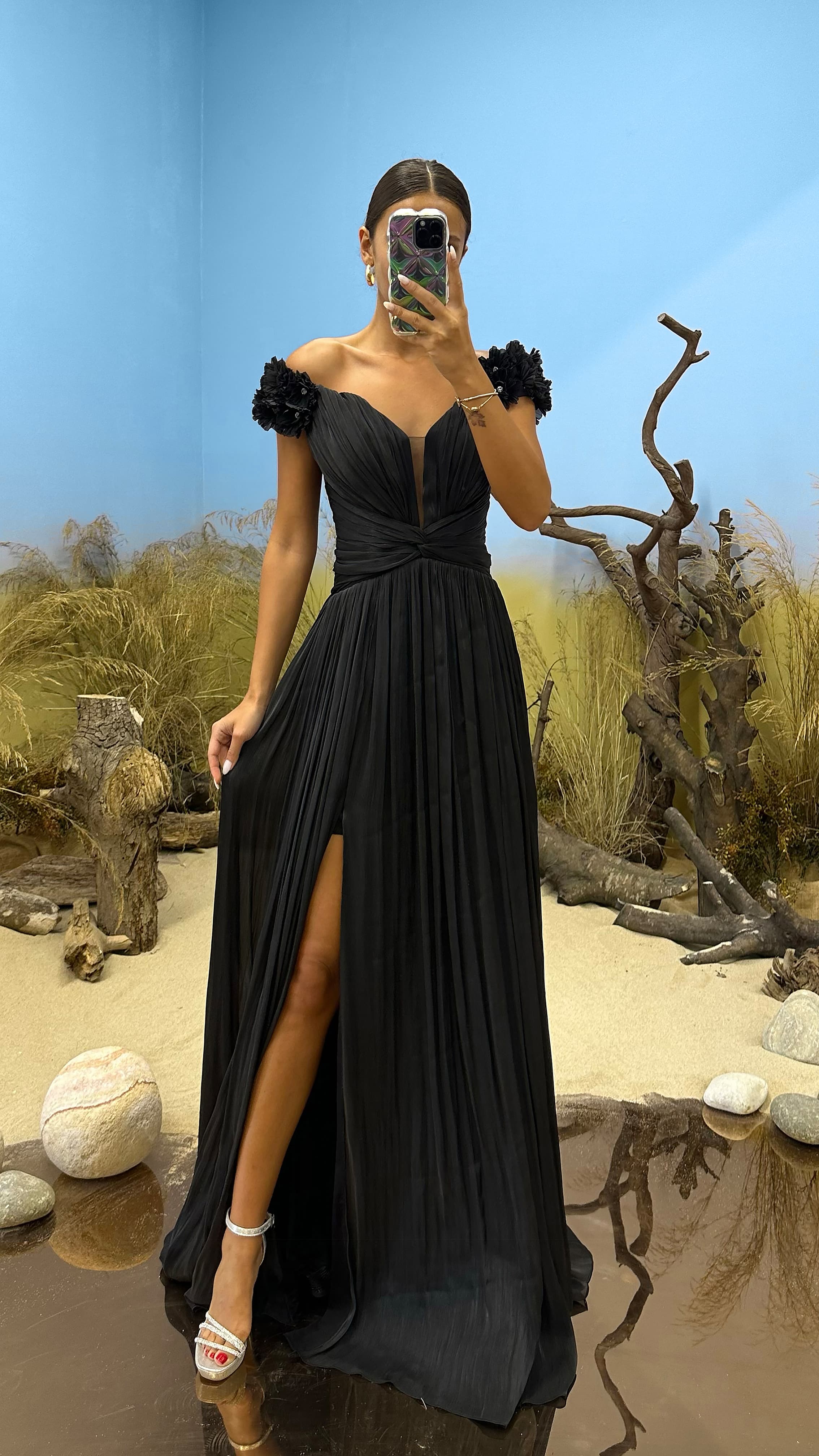 • Siyah V Yaka Drapeli Tasarım Elbise