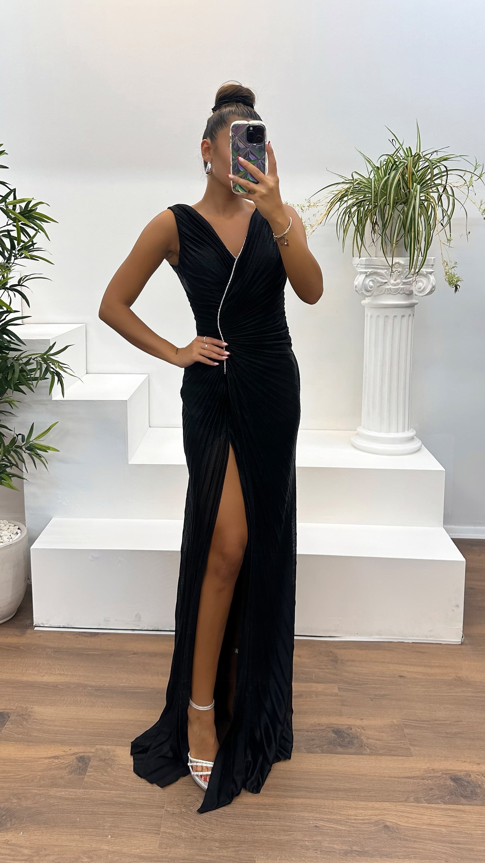 • Siyah V Yaka Taş Detay Abiye Elbise