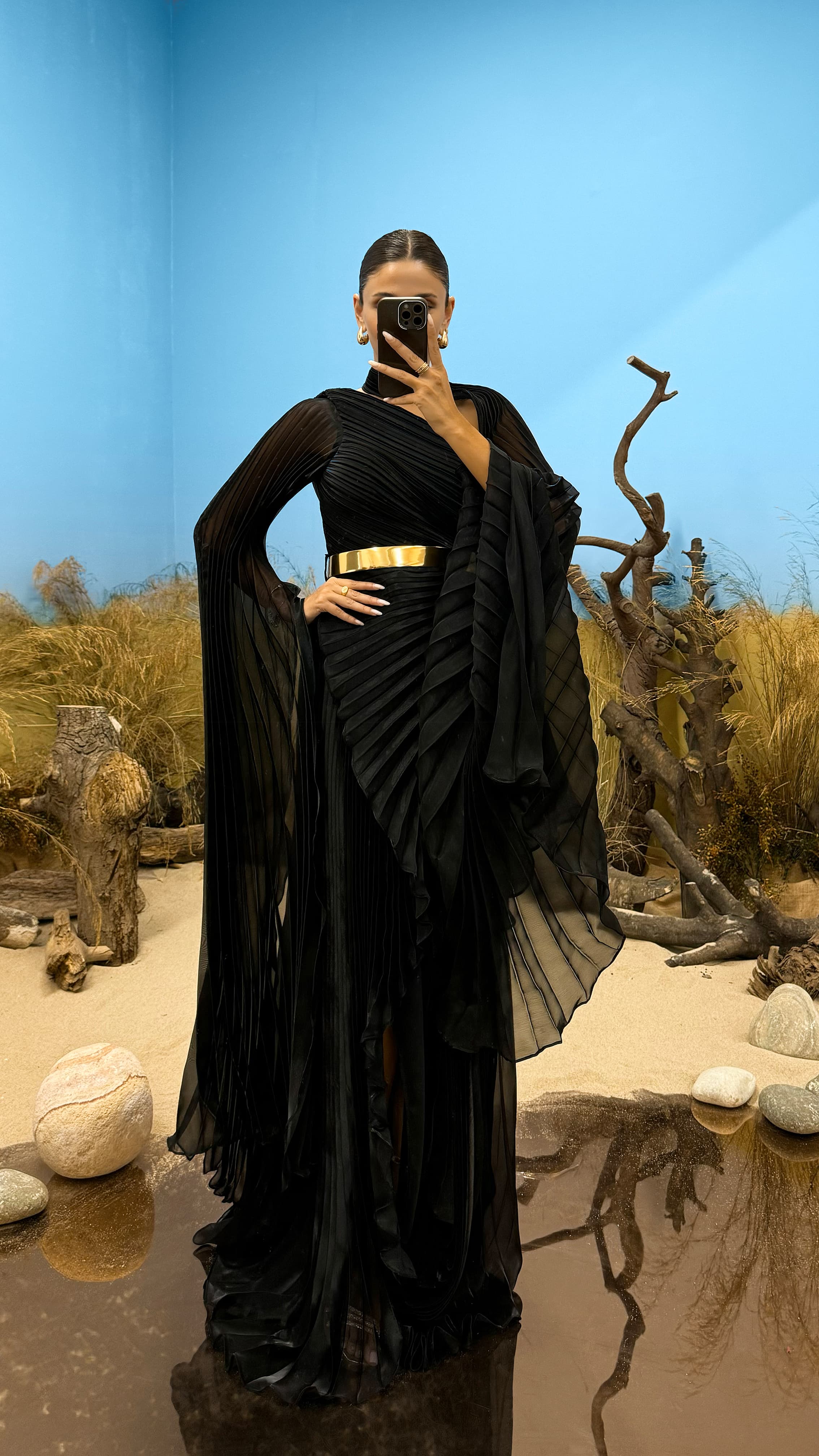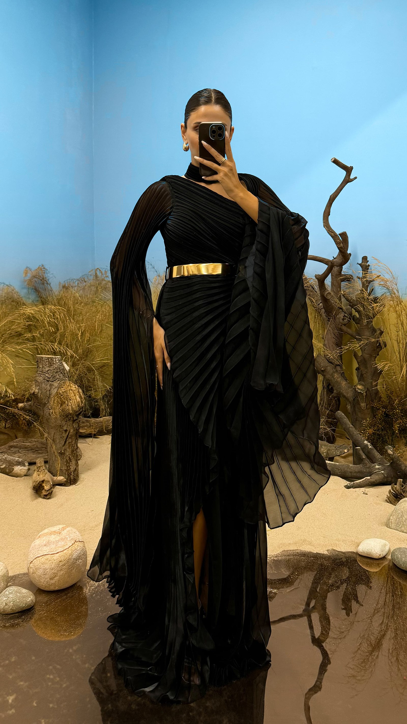 • Siyah Yaka Detay Asimetrik Kesim Abiye Elbise