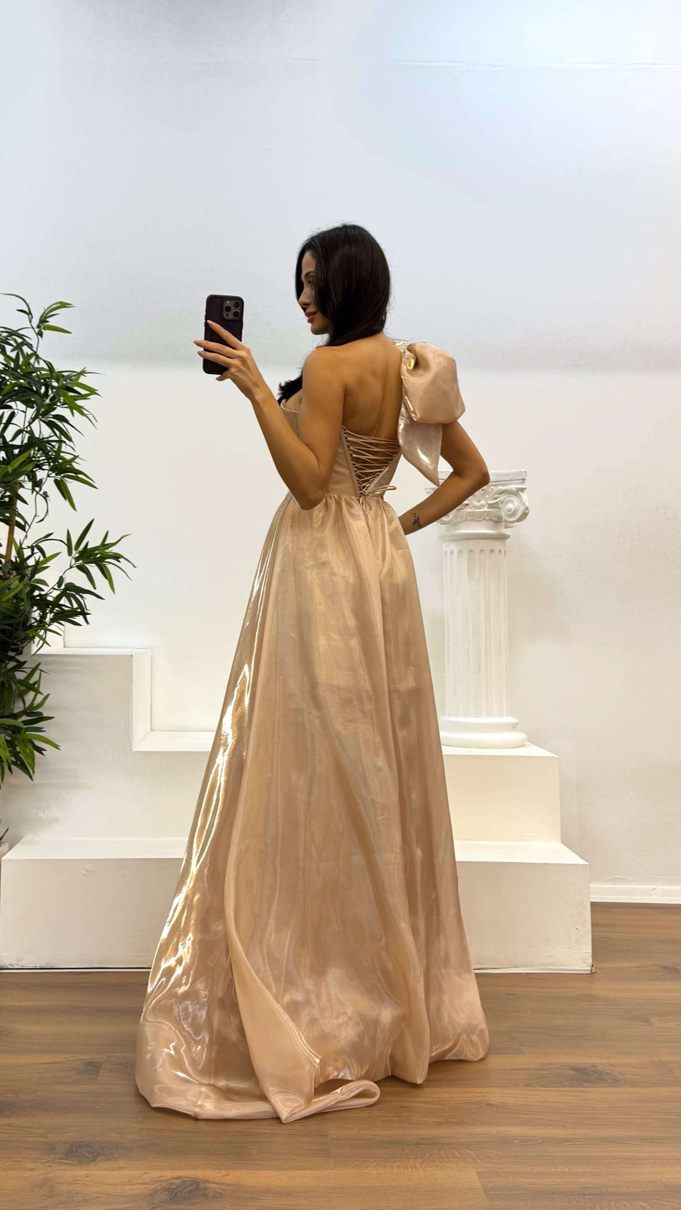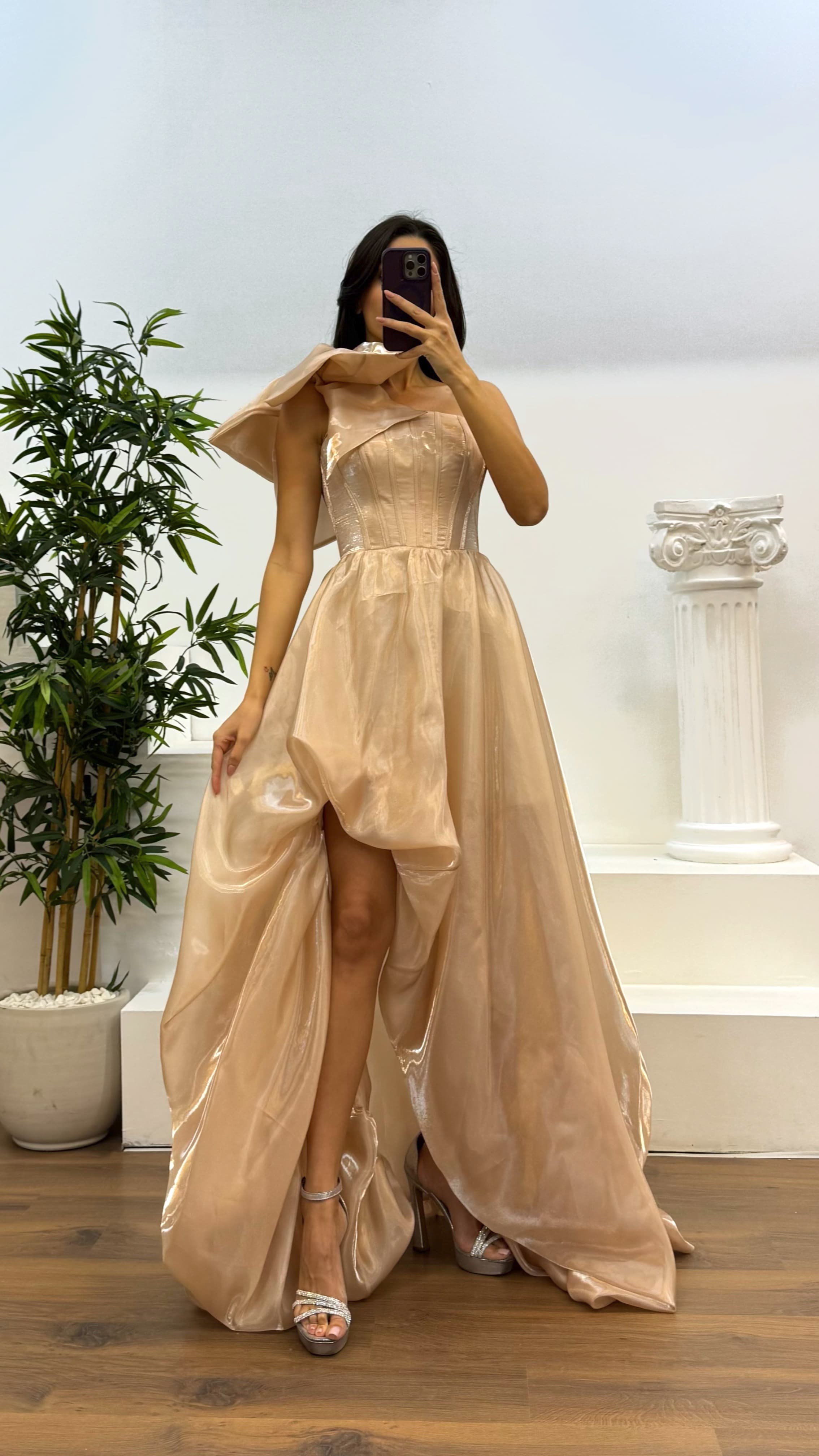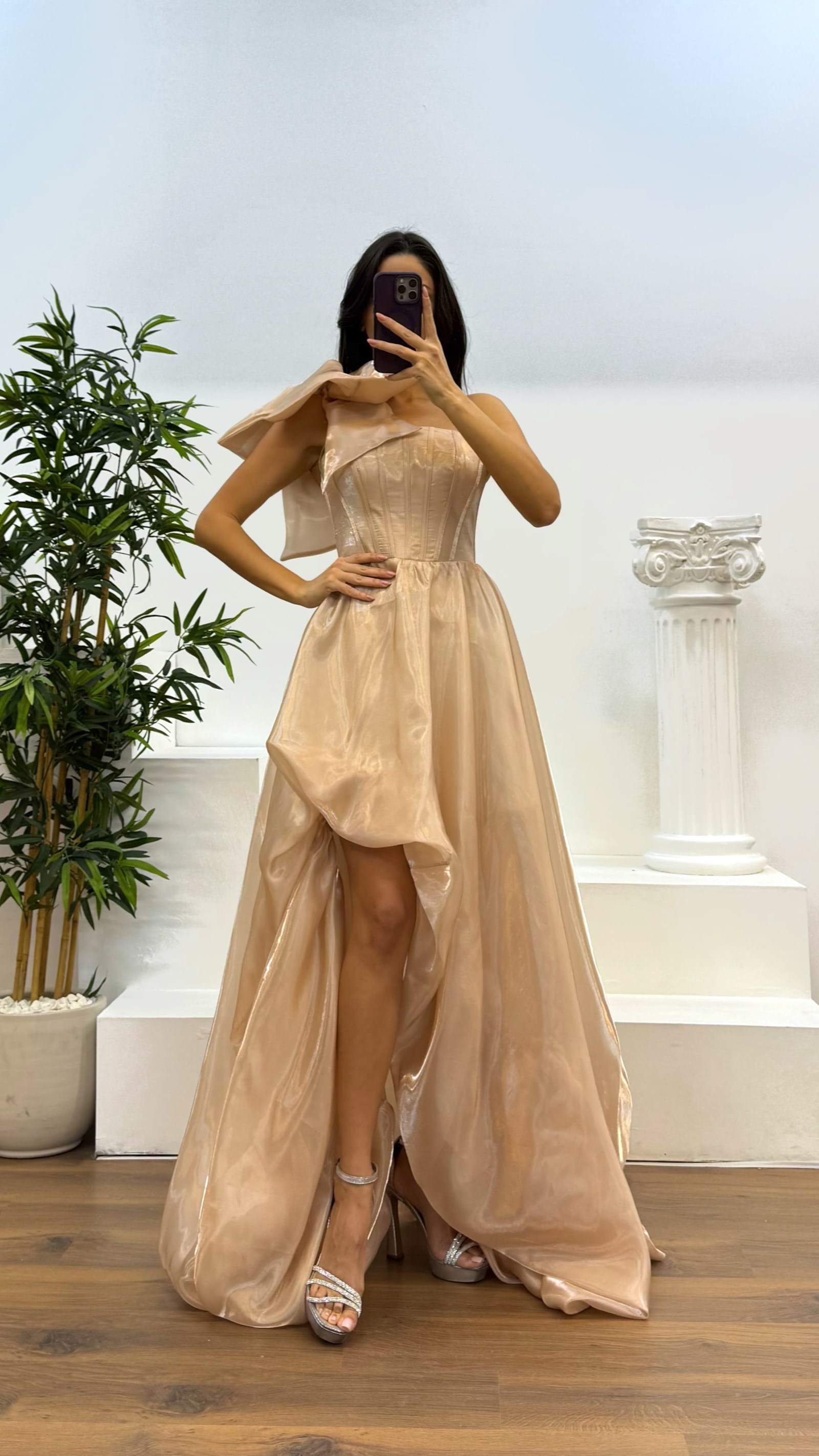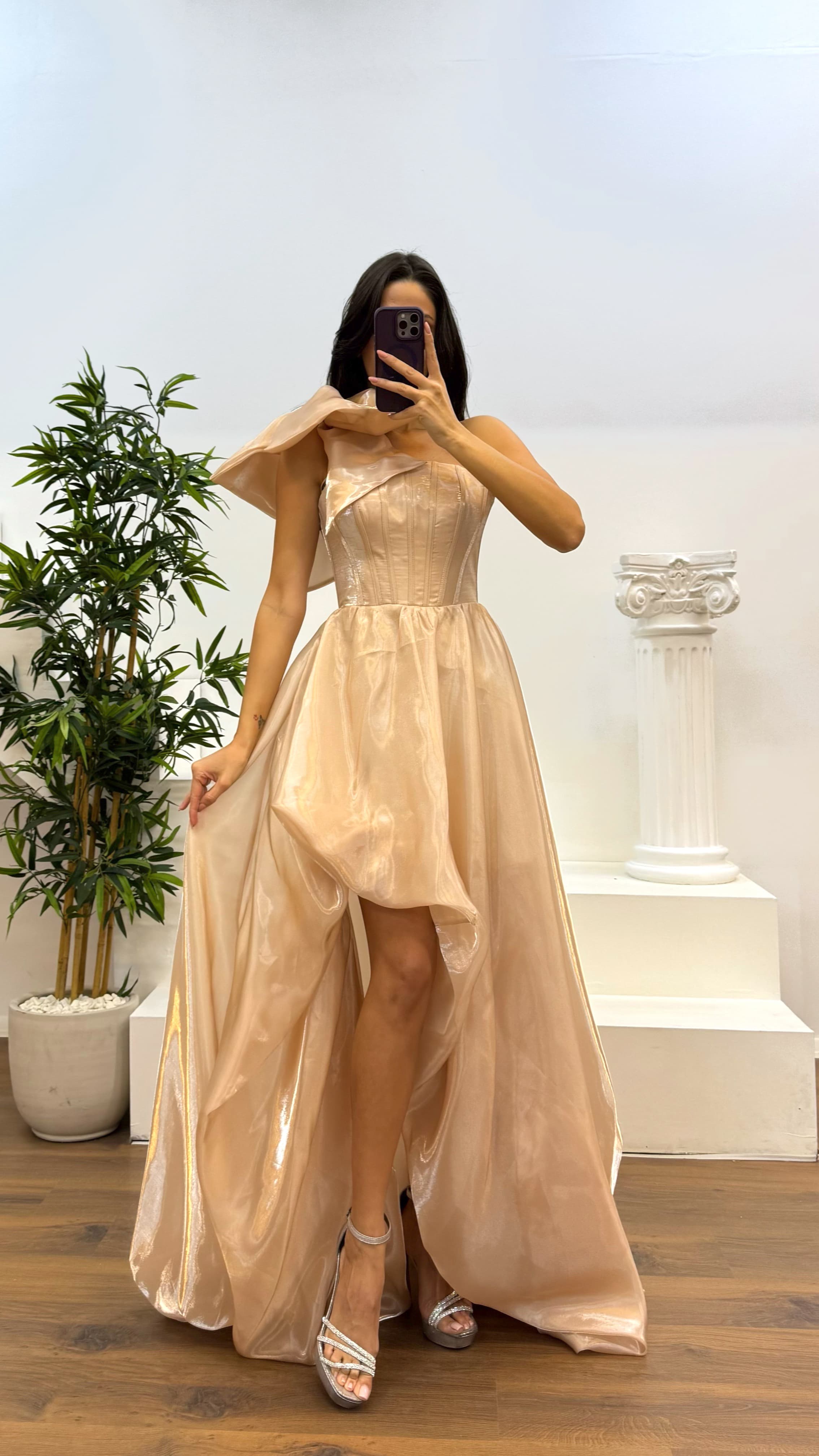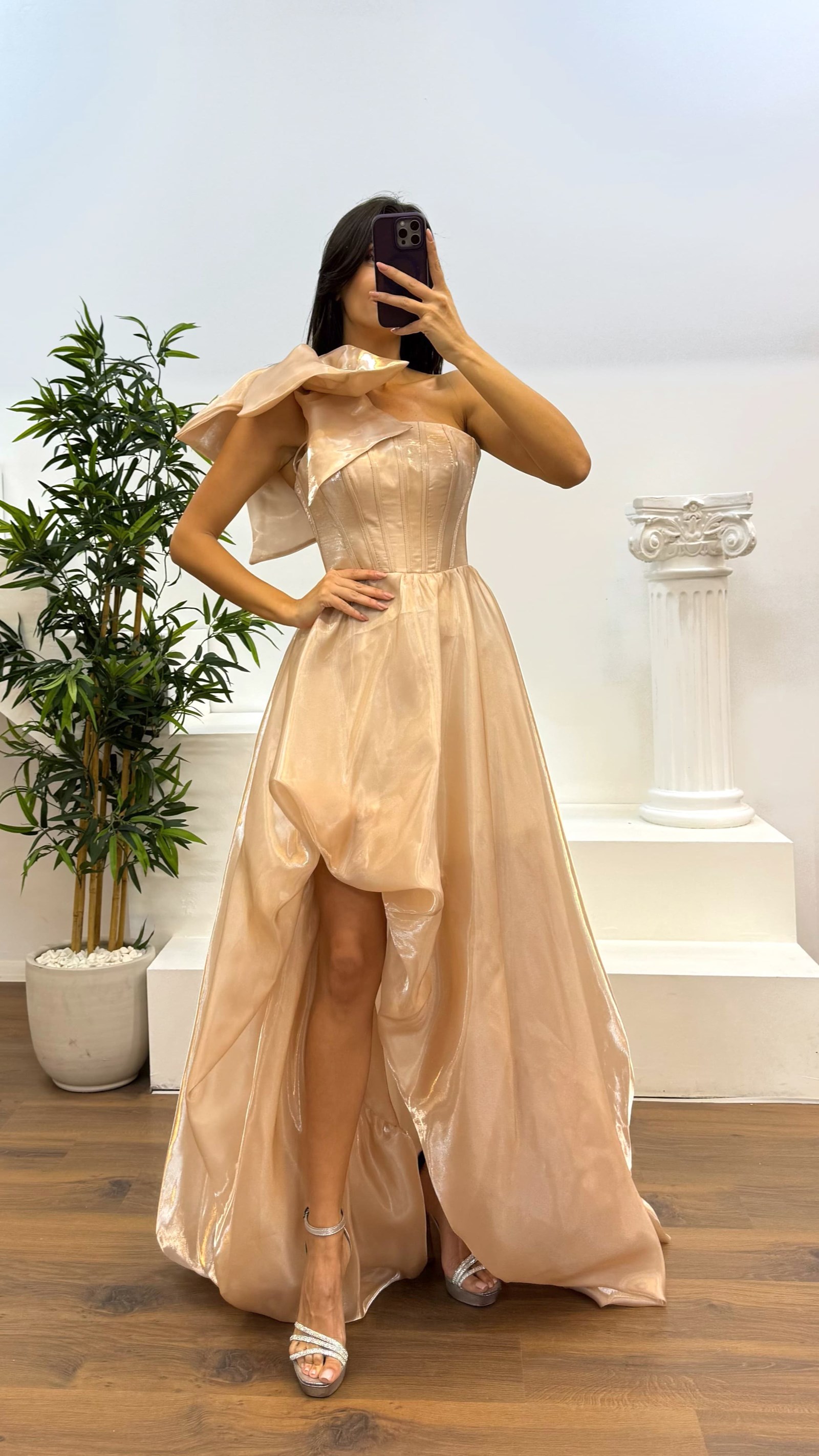 Ein Schulter-Abendkleid Das Produkt ist in den Größen 36-44 erhältlich, mit Brustpolster, gefüttert, mit Schlitz, Kreuzbandverschluss und Reißverschluss auf der Rückseite, entworfen als Abendkleid mit Schulterdetails. Die Länge des Produkts kann zwischen 165-170 cm variieren. Stoffart: Organza-Satin.