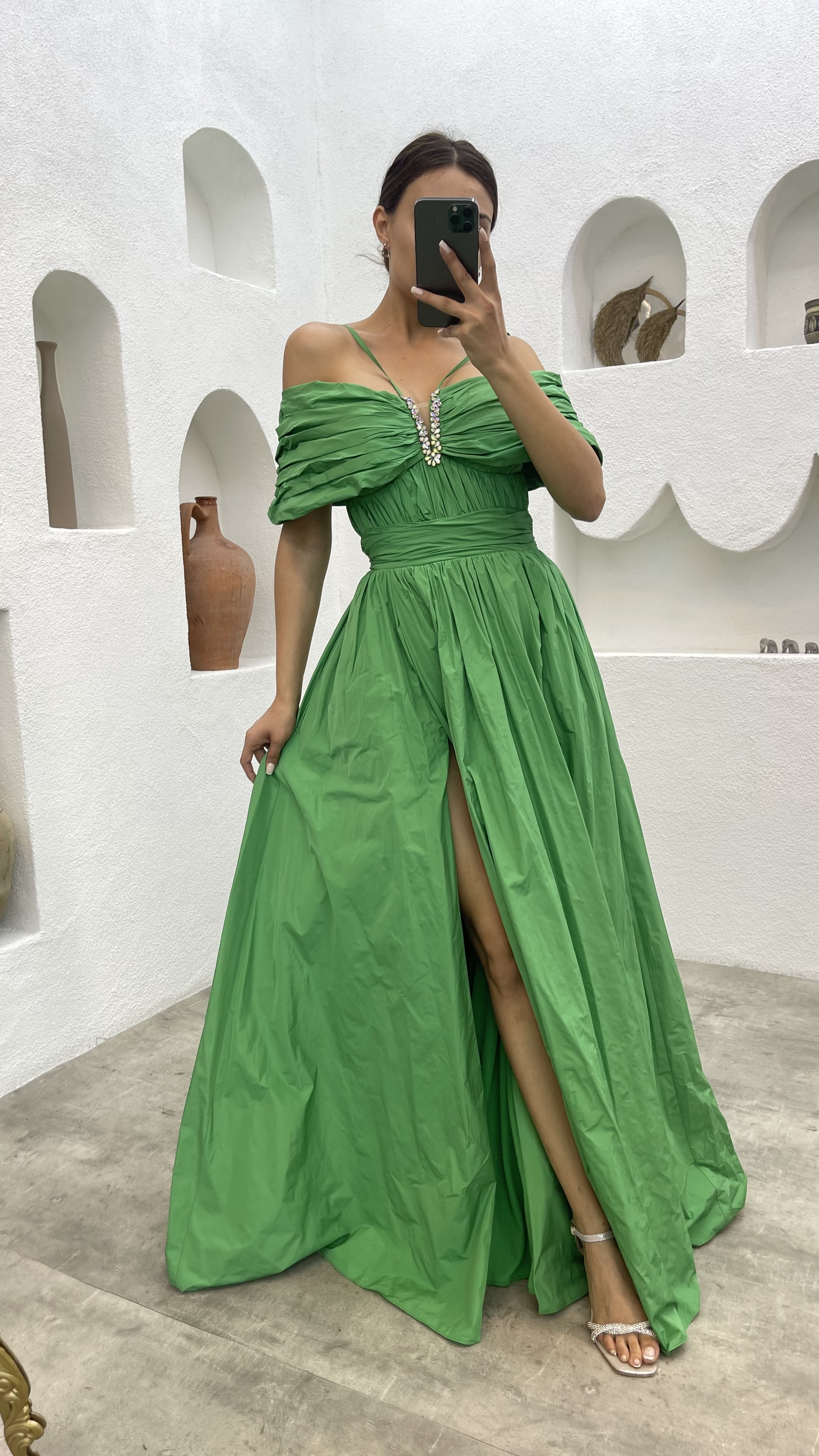 • Yeşil İp Askılı Göğsü Taşlı Abiye Elbise