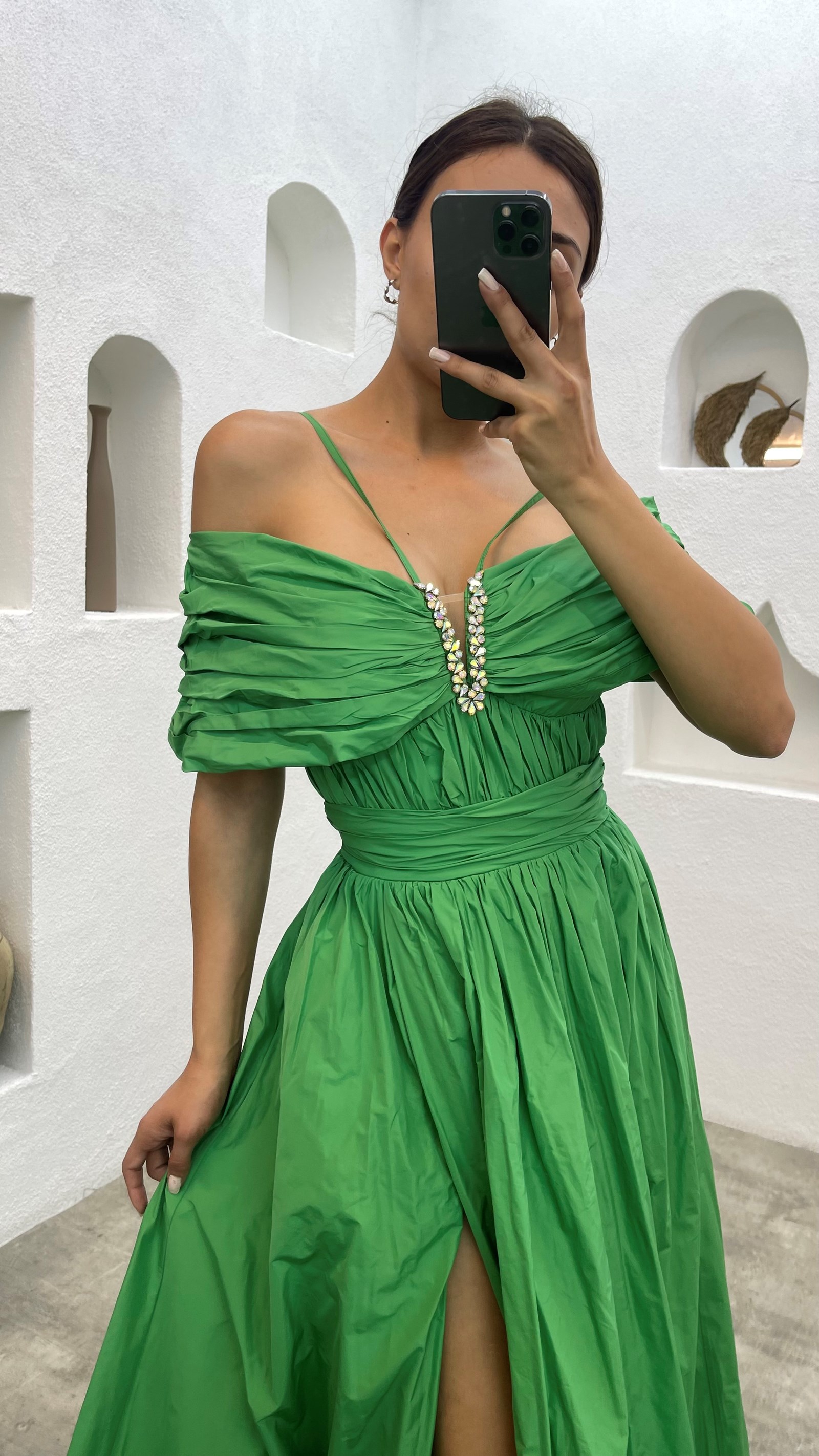 Grünes Abendkleid mit Seilträgern und Steinen auf der Brust