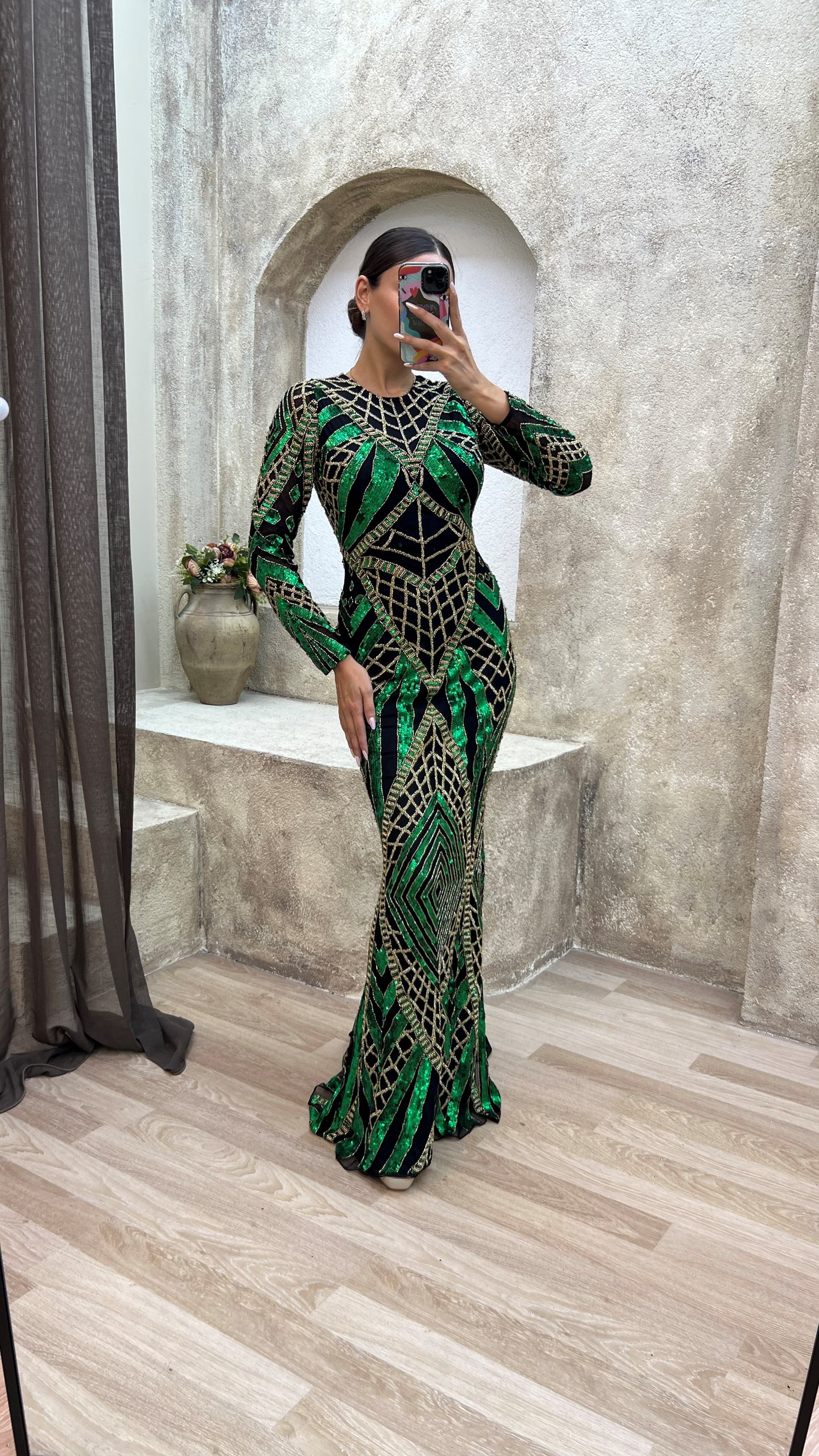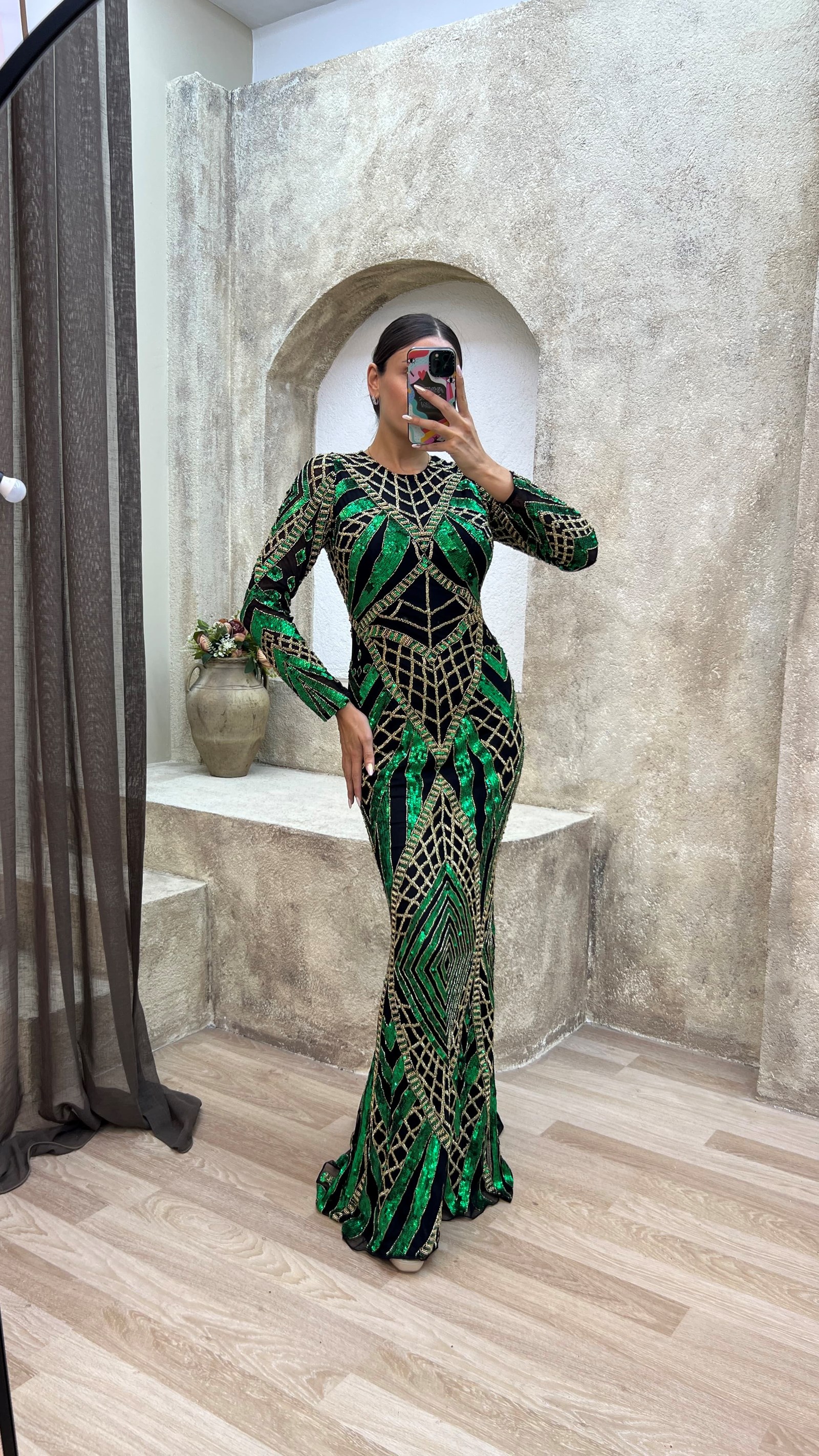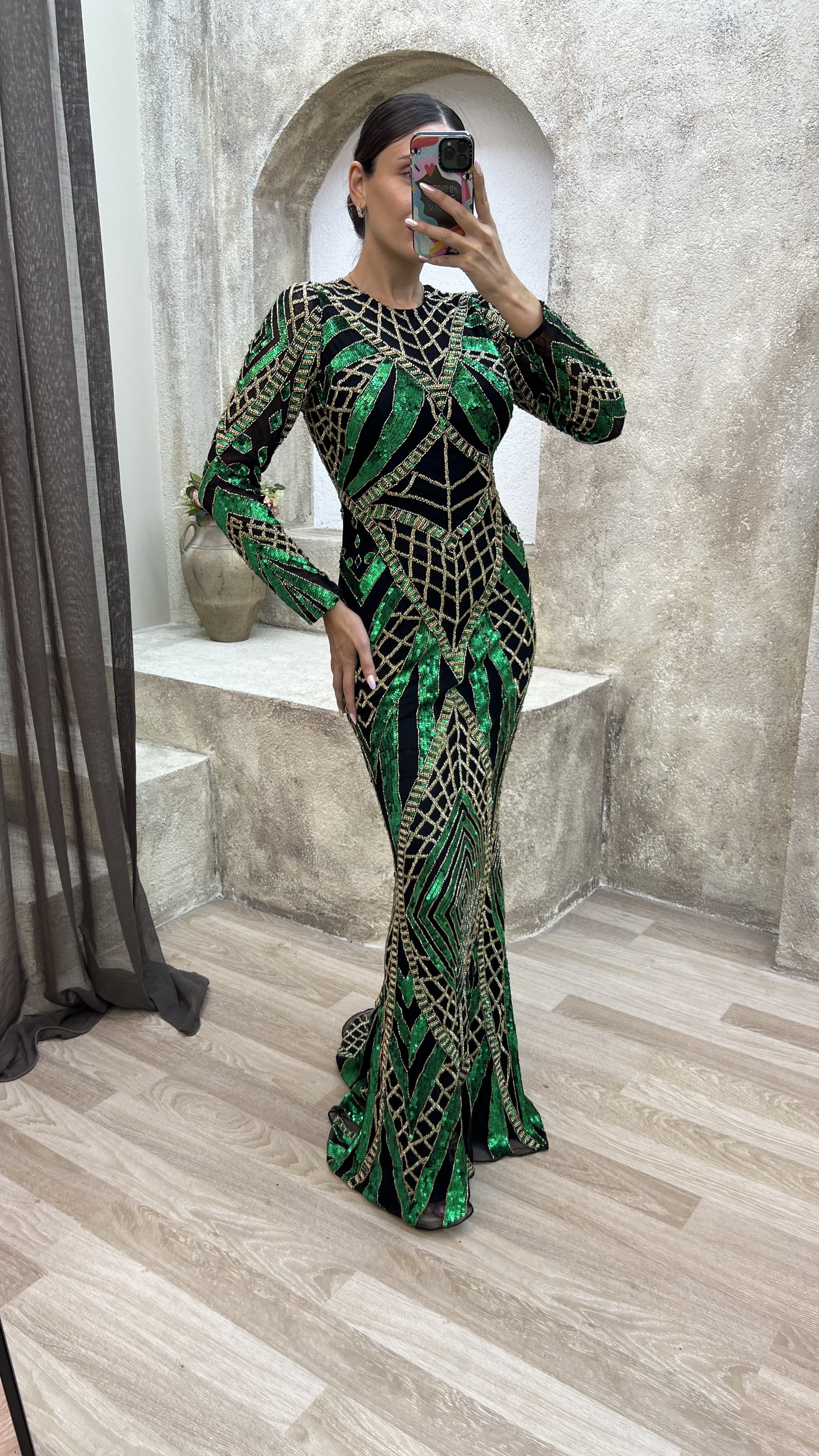 • Yeşil Özel İşlemeli Tasarım Abiye Elbise