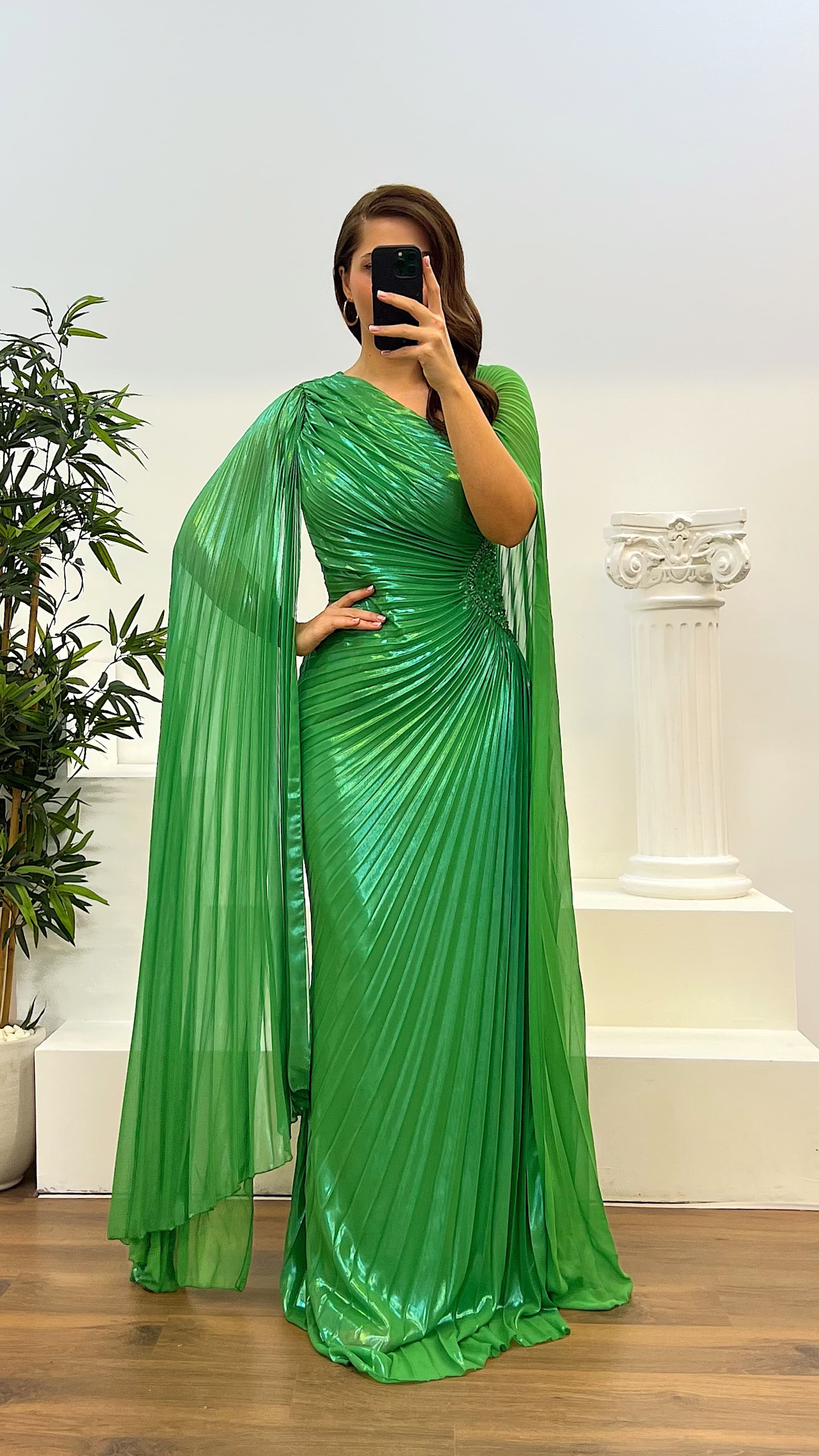 • Yeşil Piliseli Bel Detay Büyük Beden Abiye Elbise
