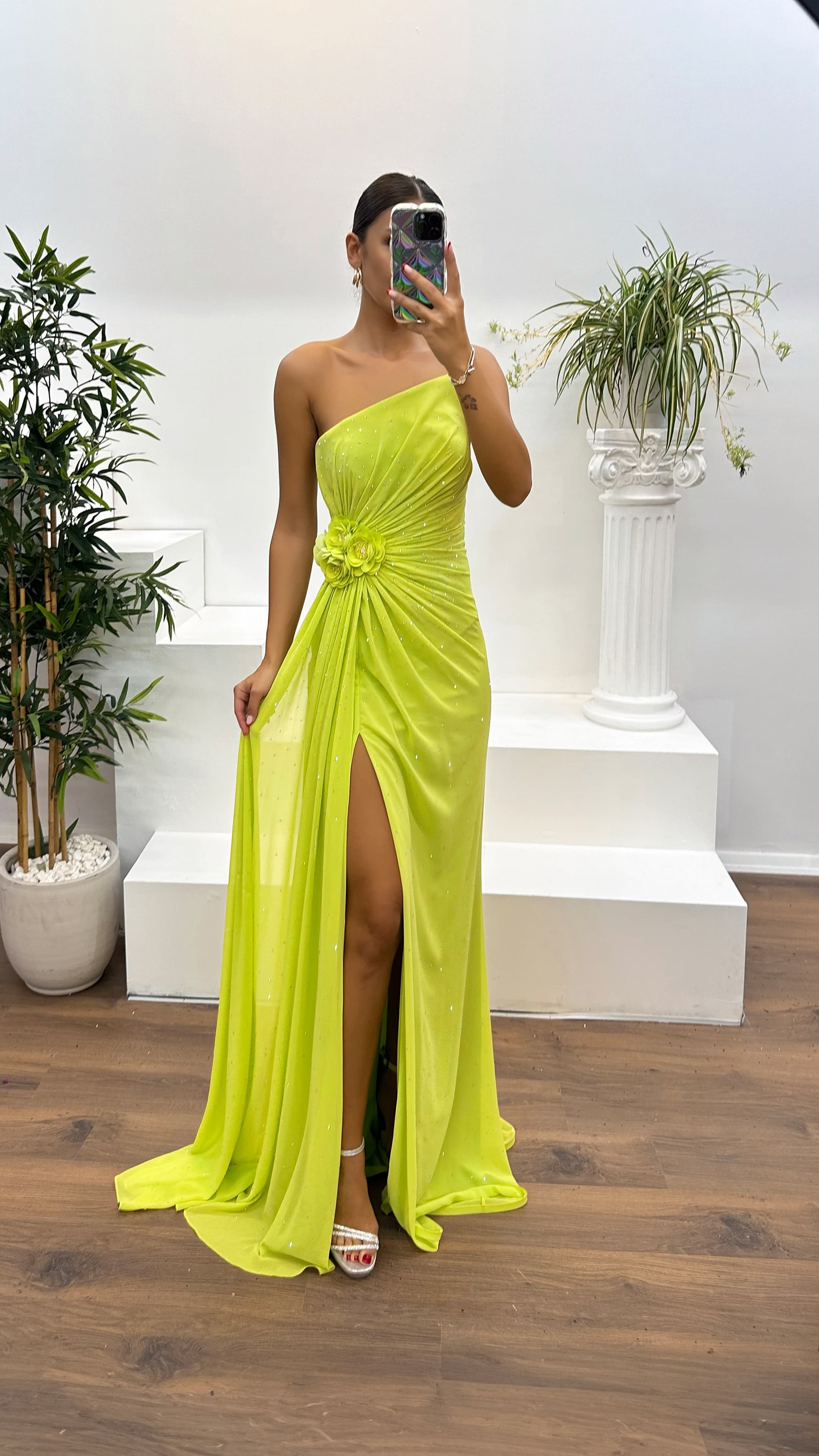 • Yeşil Straplez İşlemeli Abiye Elbise