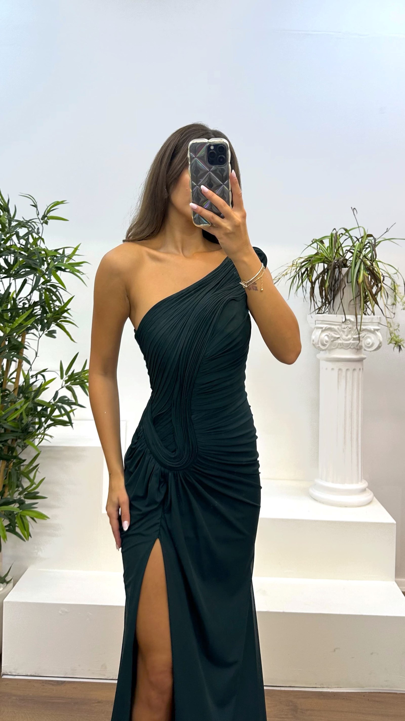 Einseitiges Schulter-Drapierung Abendkleid Das Produkt passt zu den Größen 36-44, mit Brustpolstern, gefüttert, mit Reißverschluss hinten, Schlitz und Drapierungsdetails. Länge des Produkts: Kann zwischen 165-170 cm variieren. Stoffart: 100% Polyester.