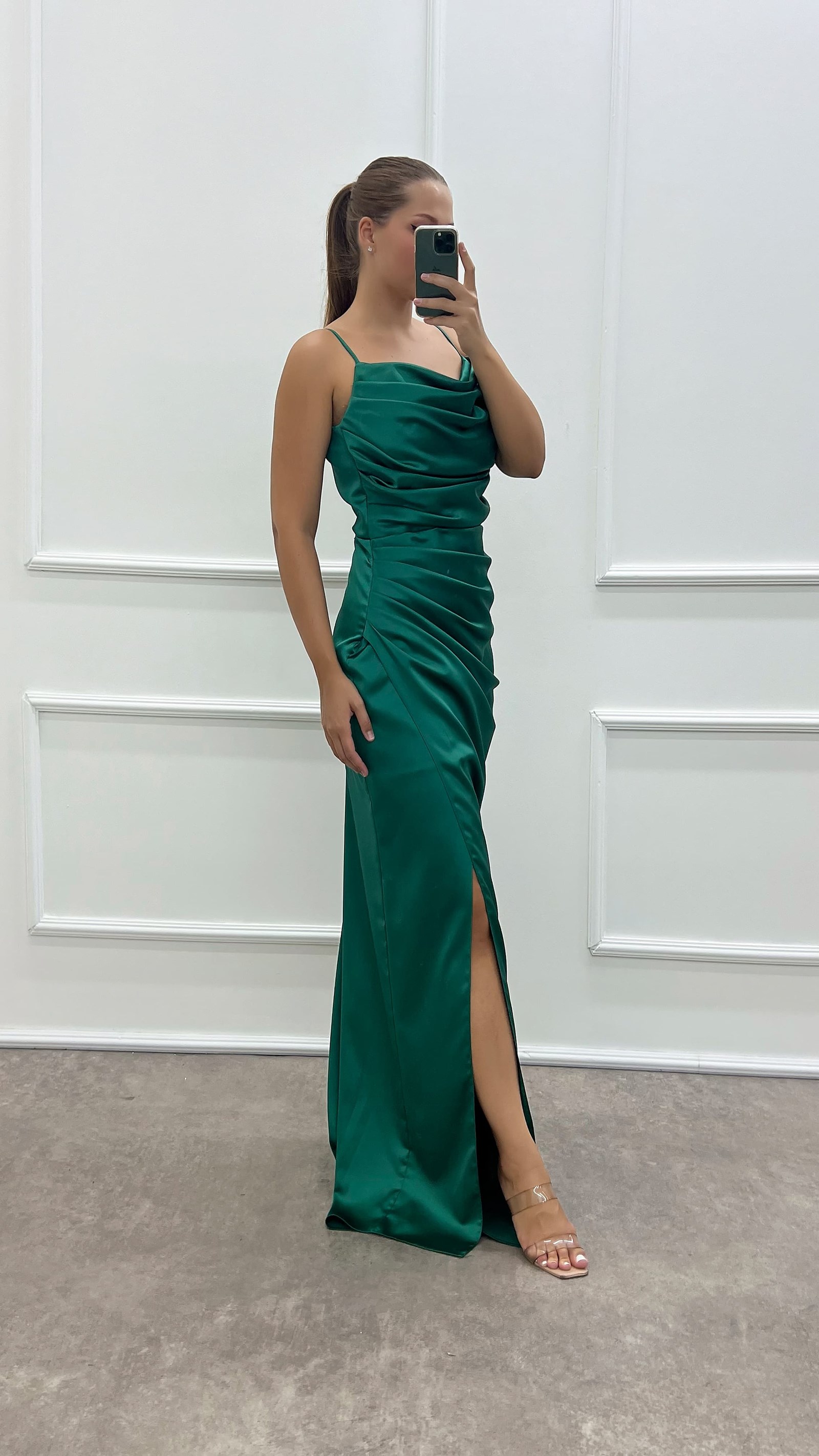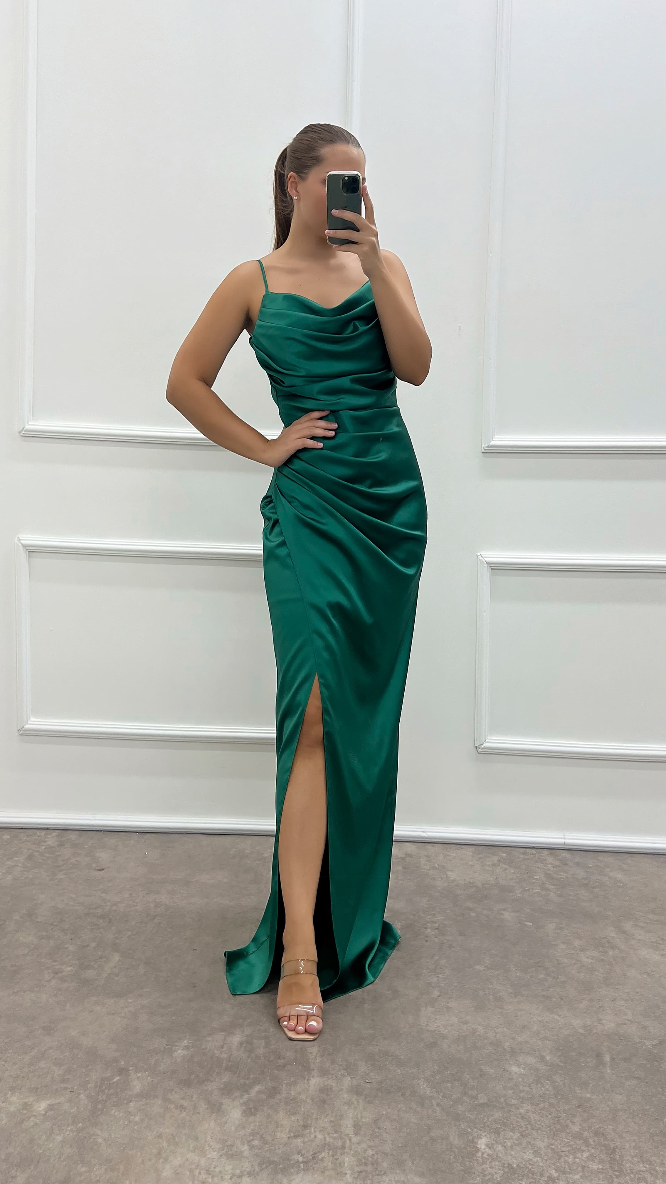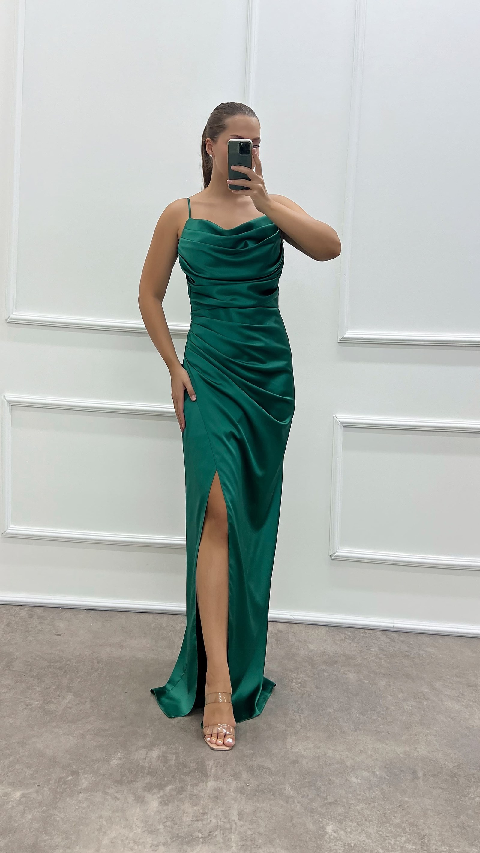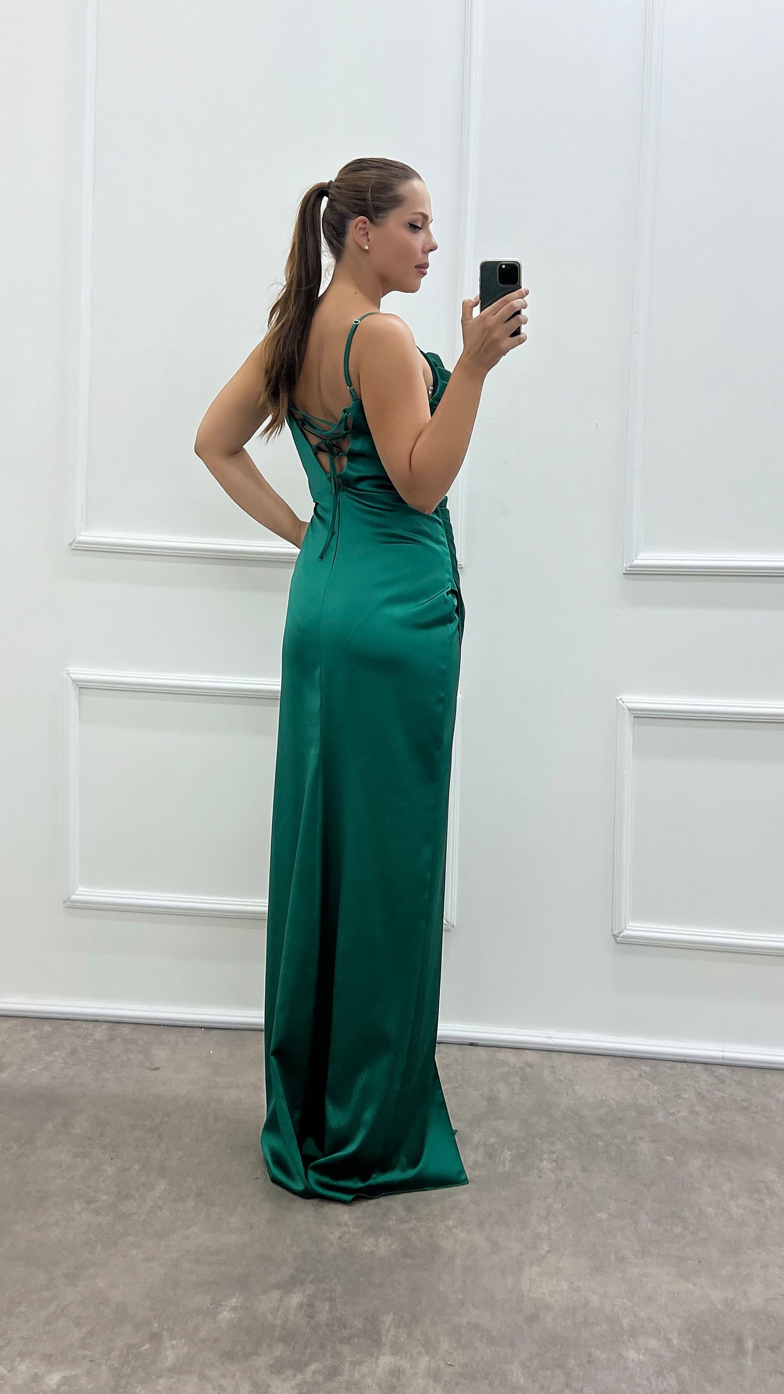 Zümrüt Yeşili İp Askılı Sırt Detay Büyük Beden Abiye Elbise