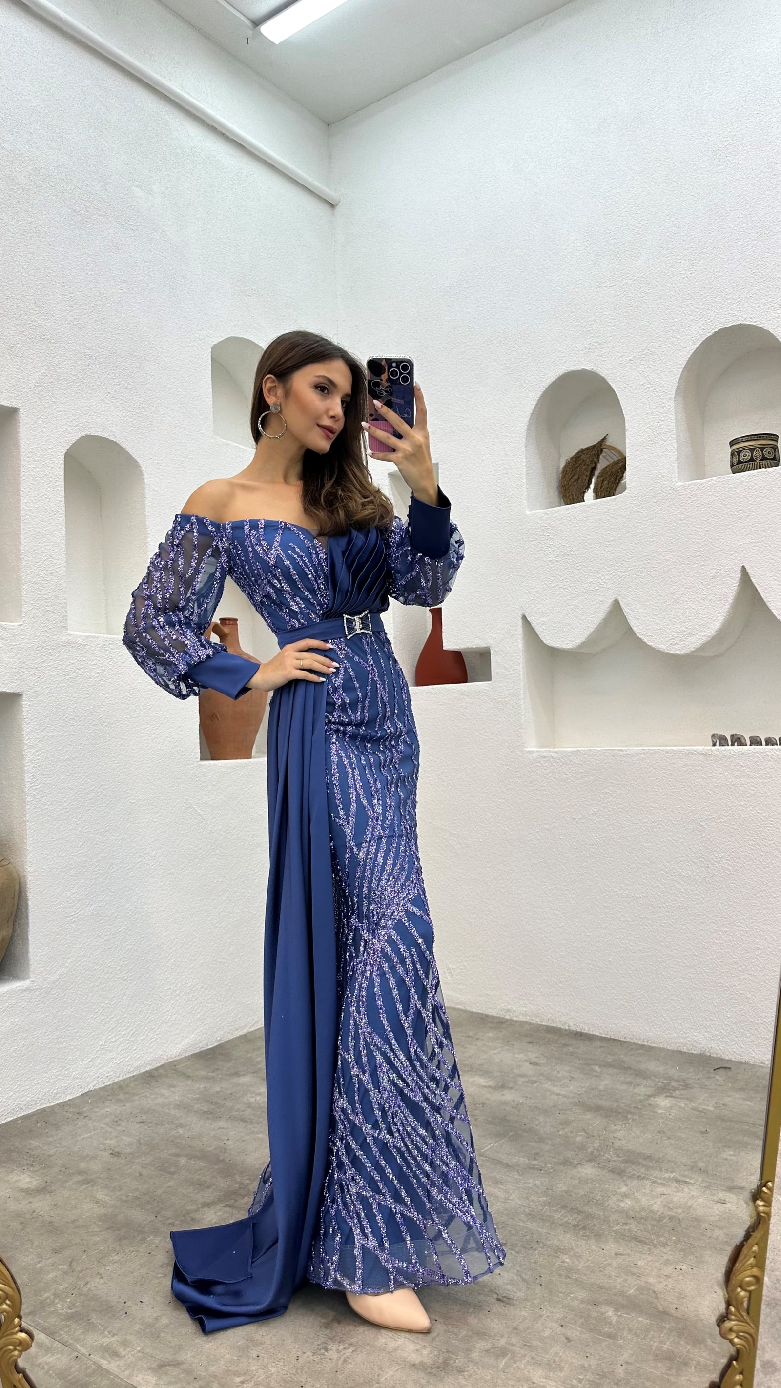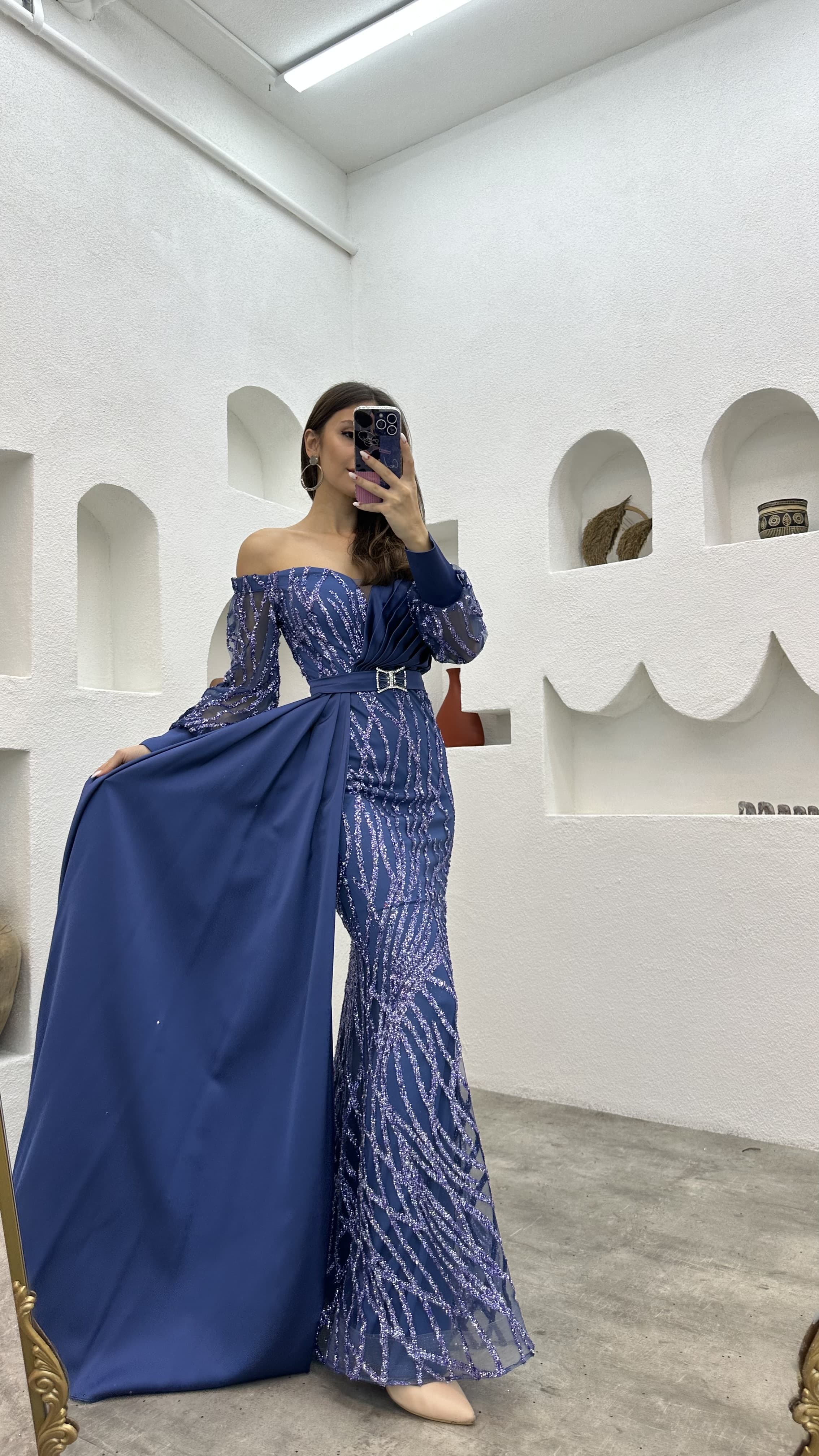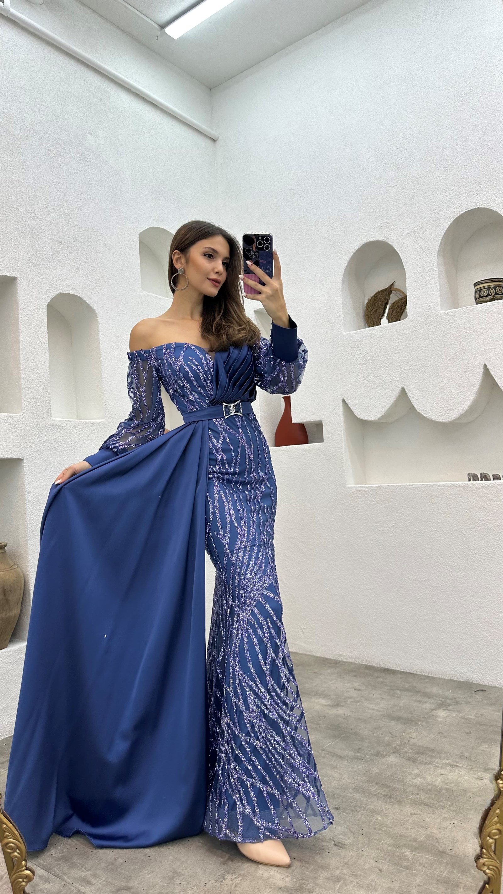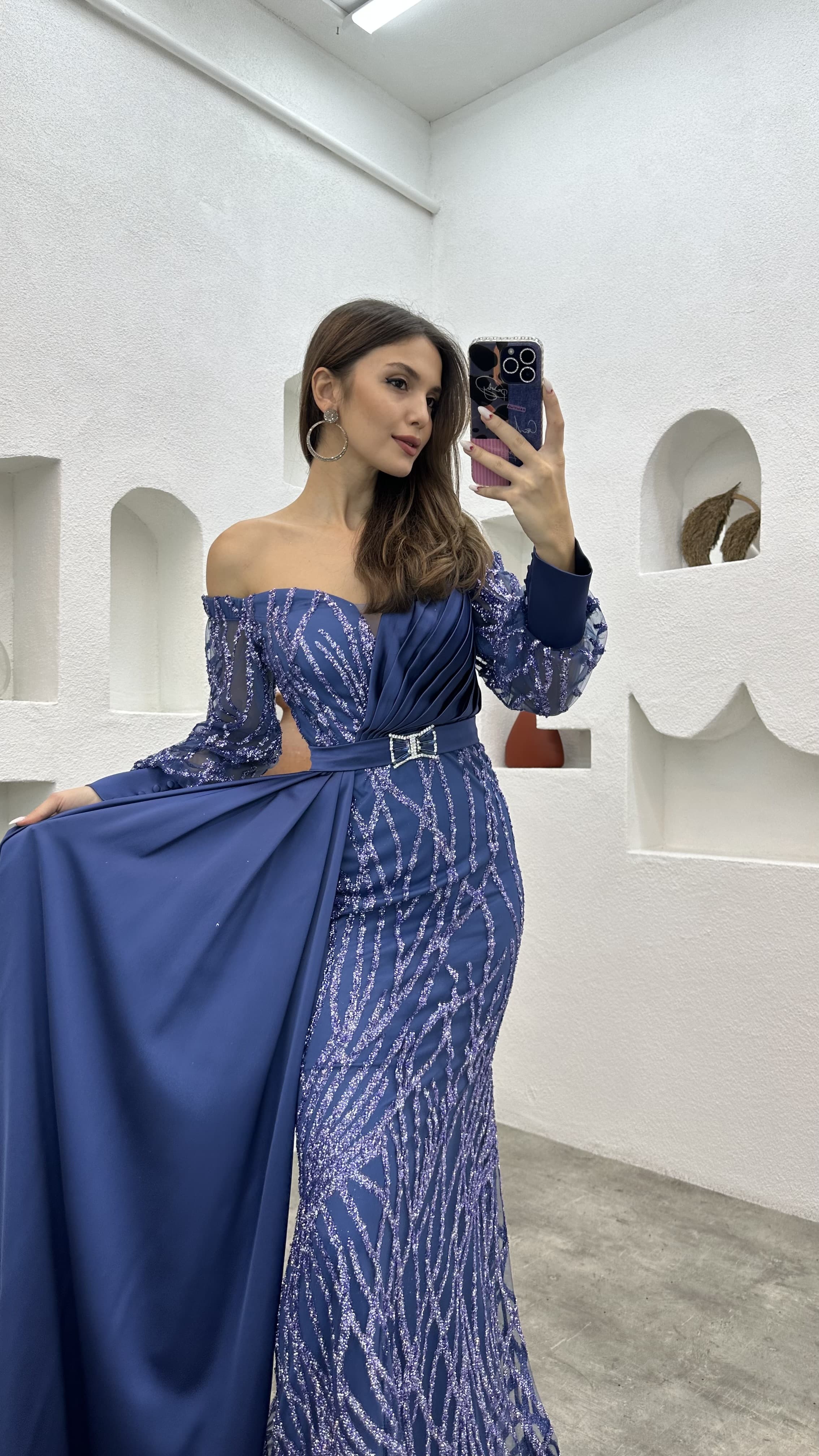 • İndigo Kemerli İşlemeli Drapeli Abiye Elbise