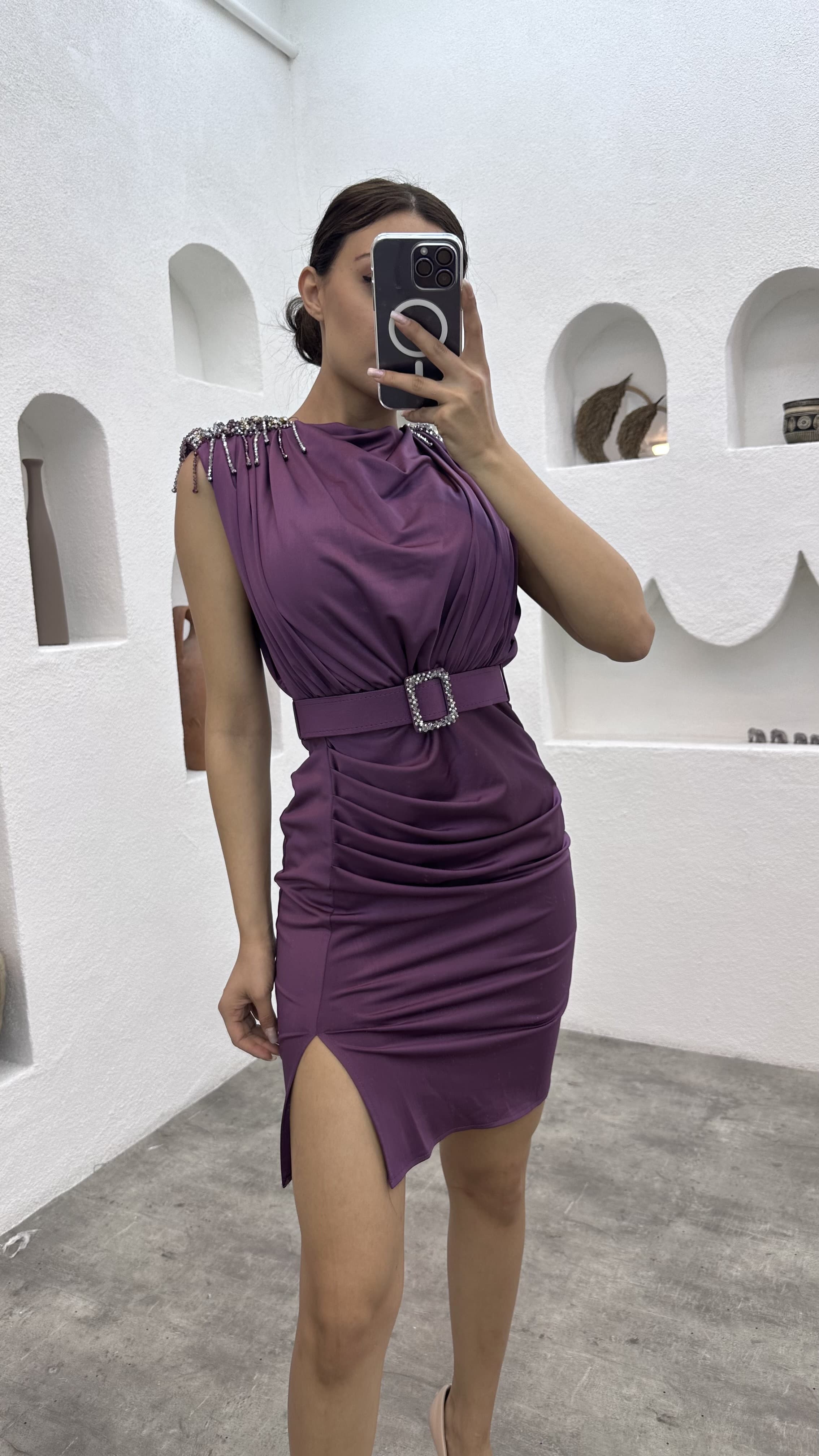 • Lila Omuzları Boncuk İşleme Kemerli Mini Buzi Abiye Elbise