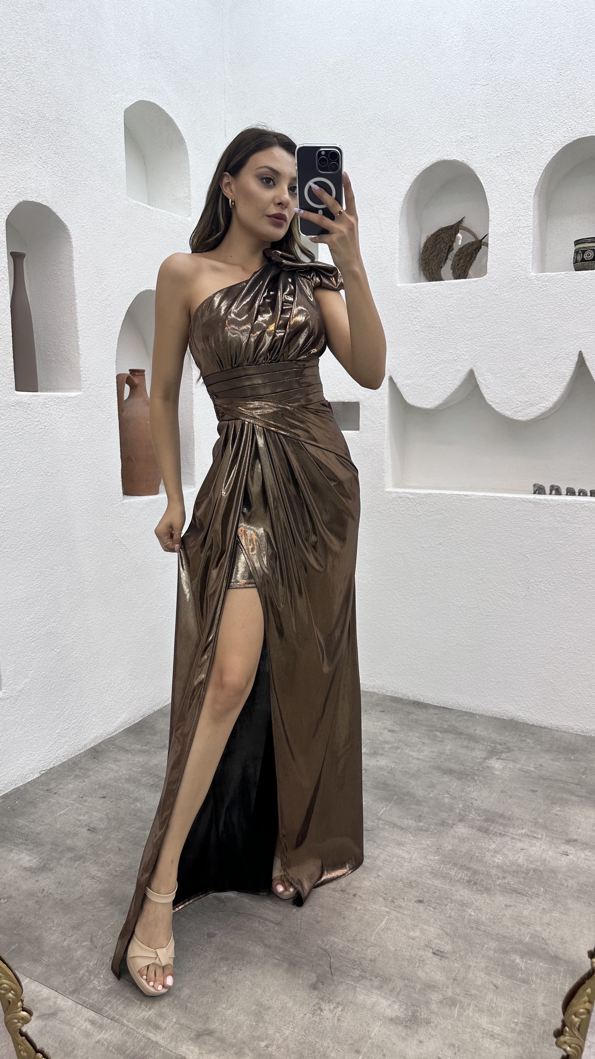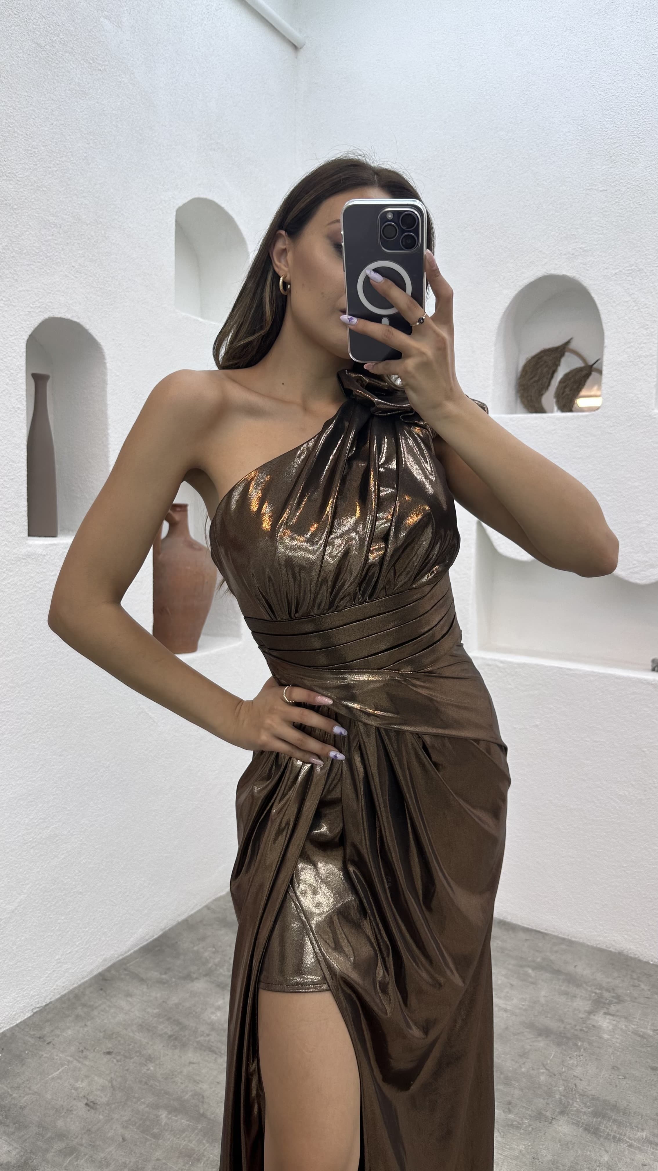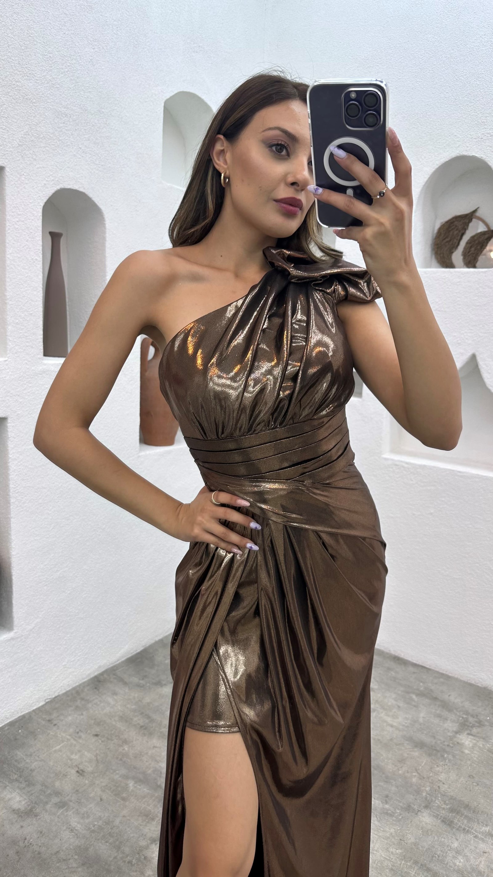 • Kahverengi Tek Kol Bel Detay Abiye Elbise