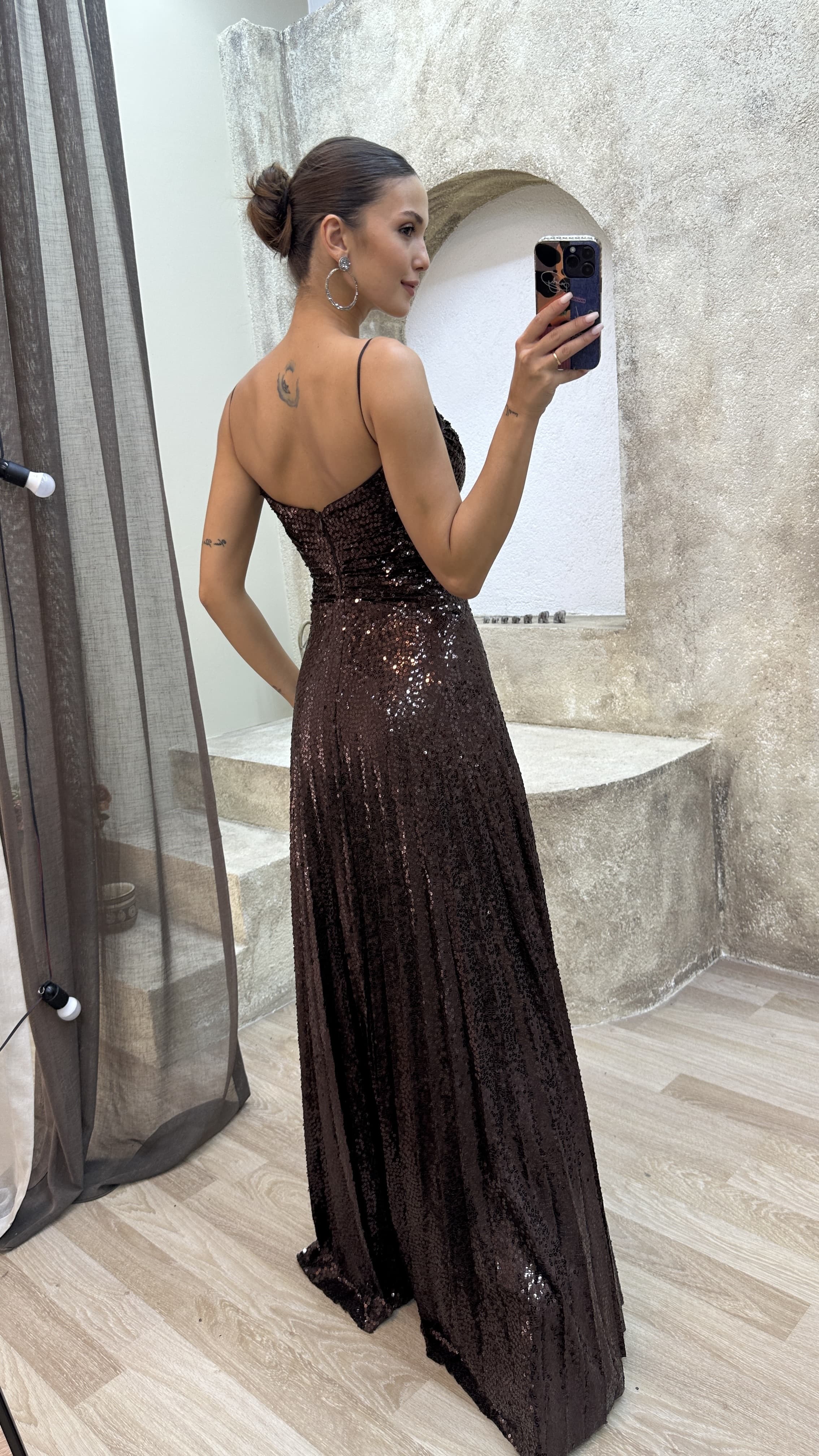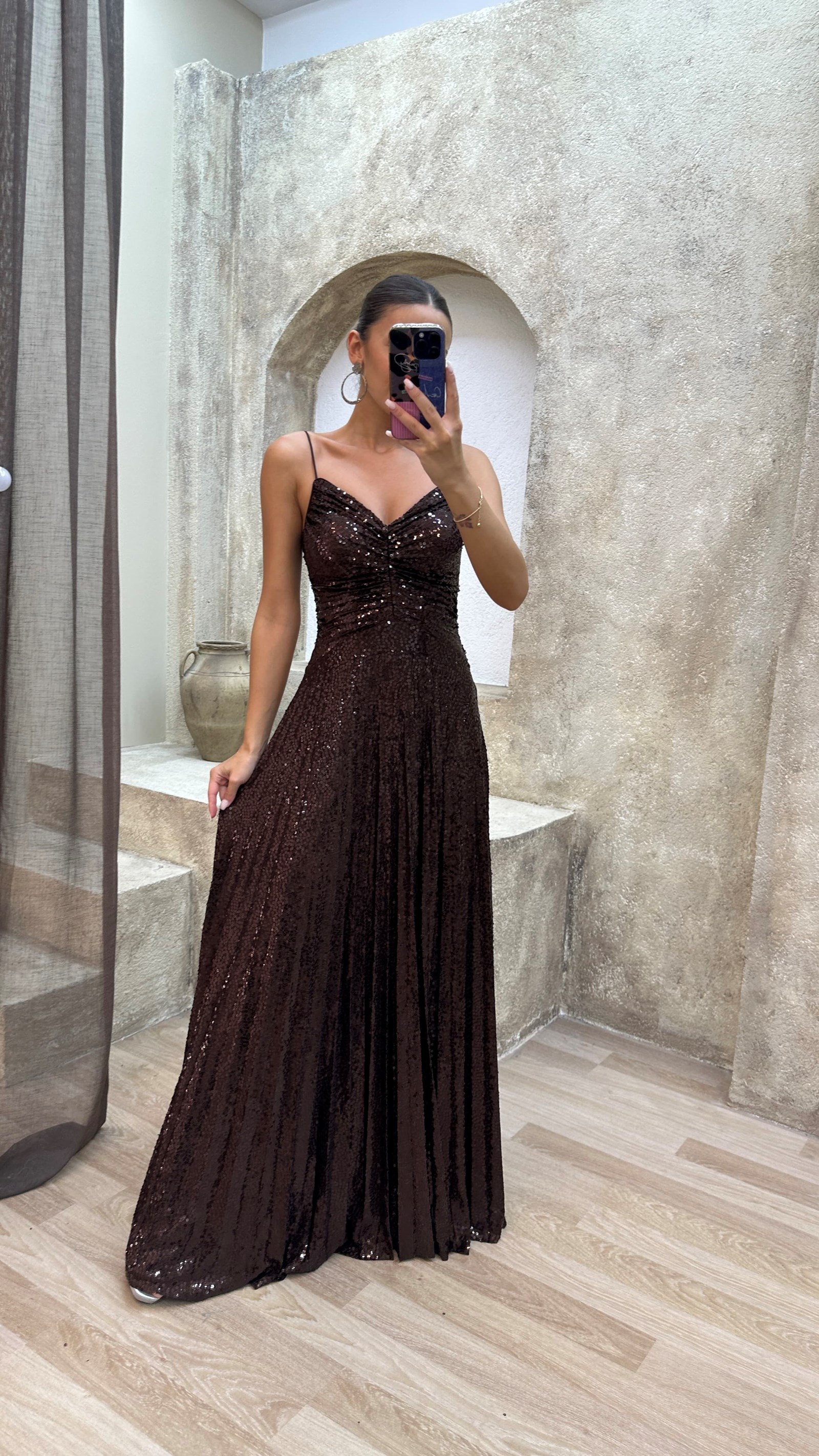 • Kahverengi İp Askılı Payet Abiye Elbise