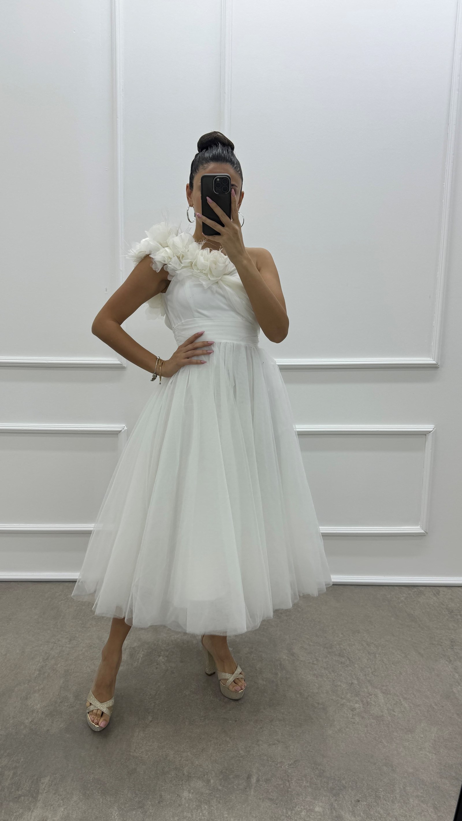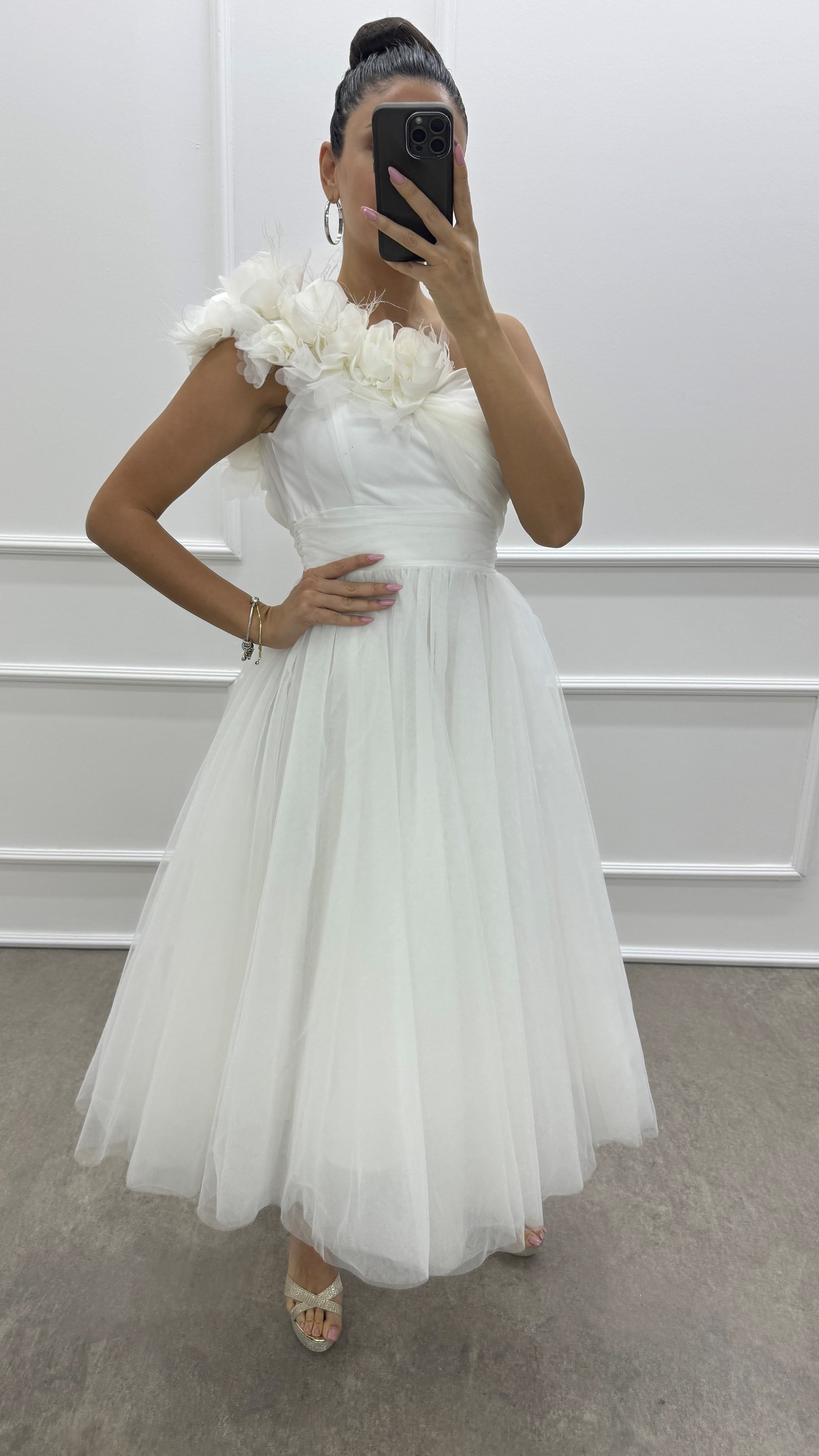Beyaz Omuzu Çiçek Detay Tasarım Tül Elbise