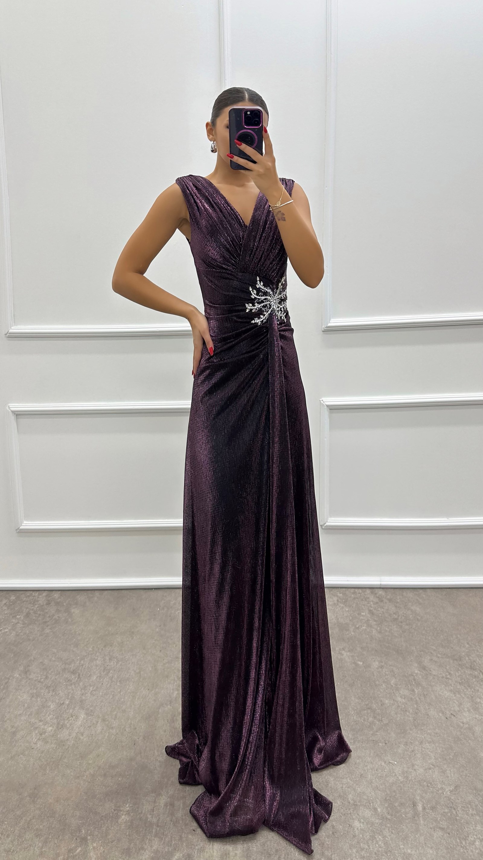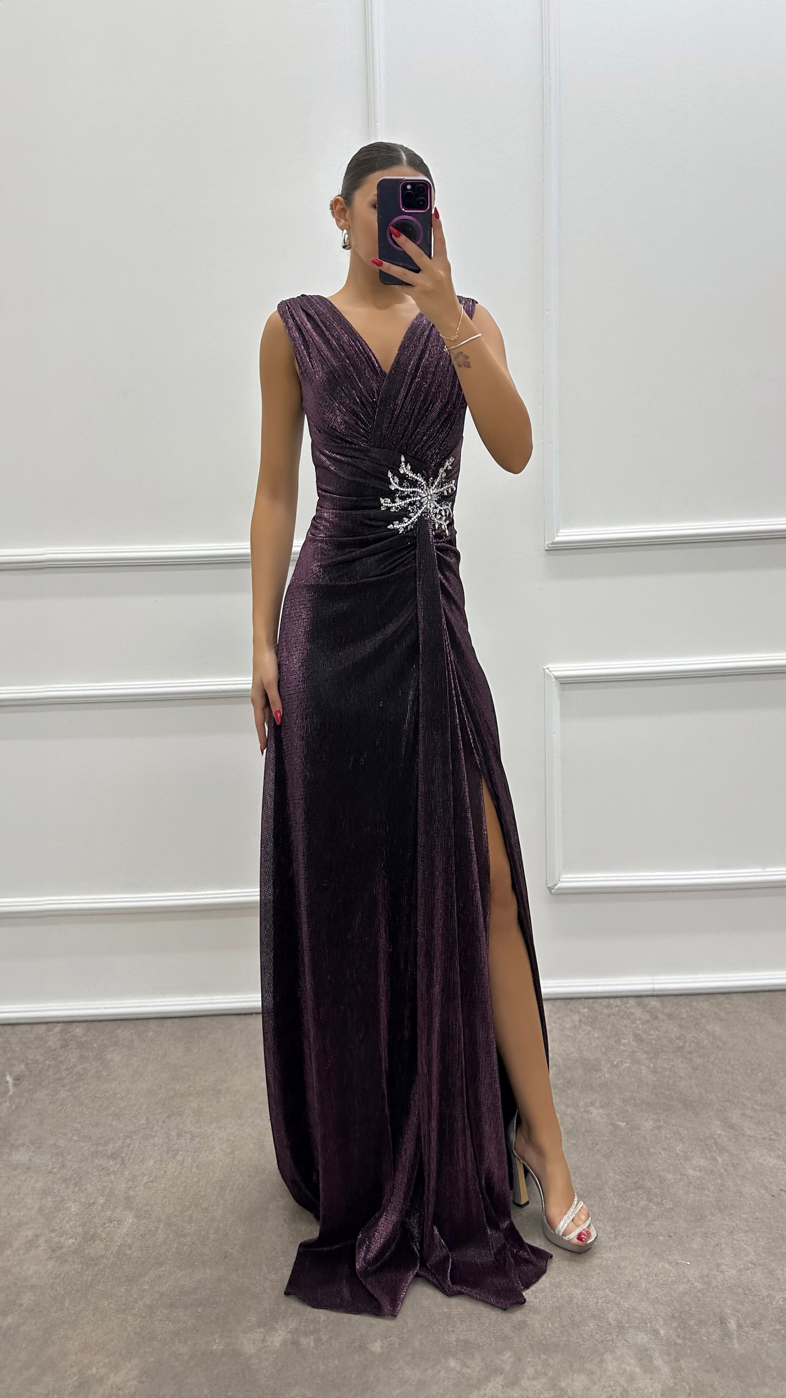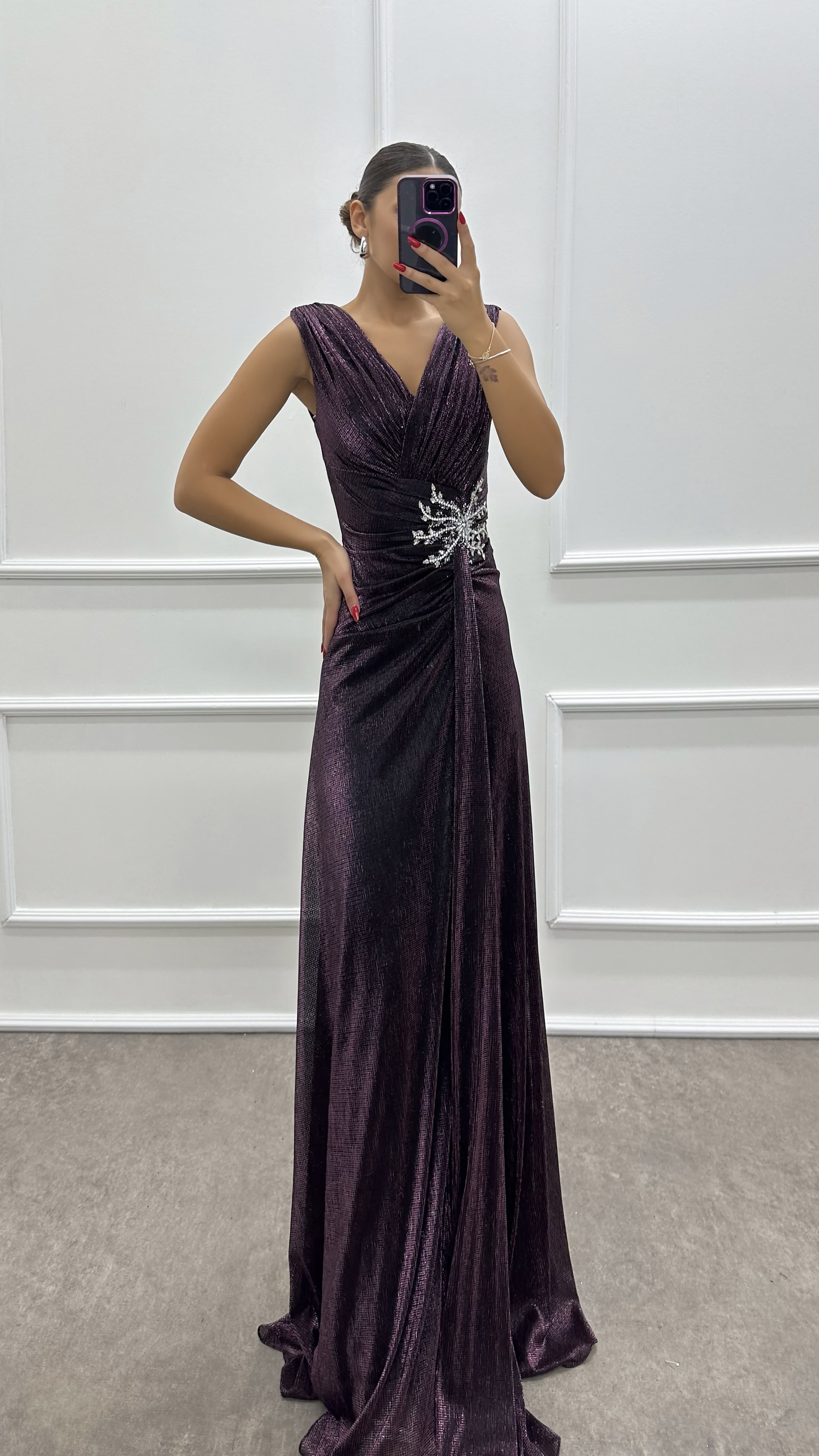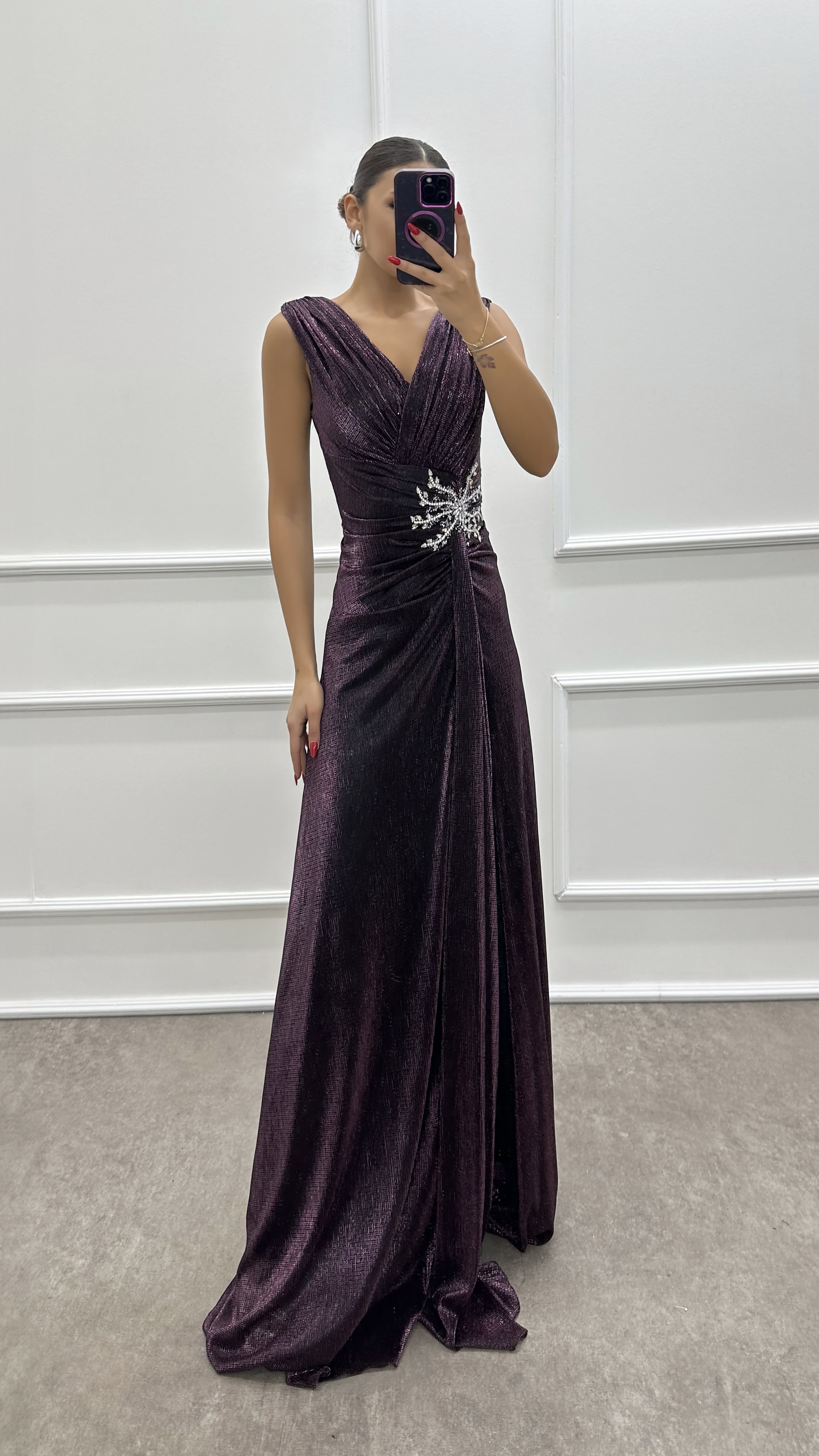 • Mürdüm V Yaka Bel Detay Tasarım Elbise
